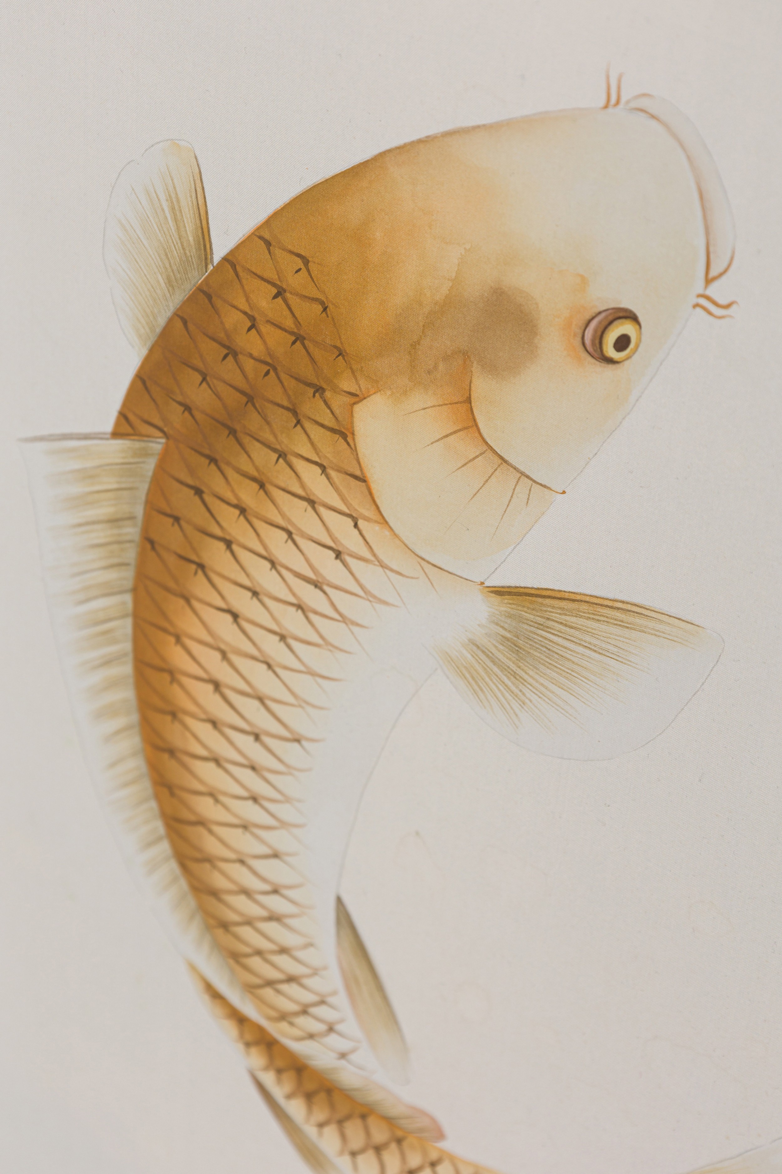 Pair of Mid-Century Koi Fish and Tree Painted Silk Panels