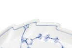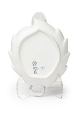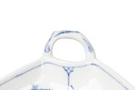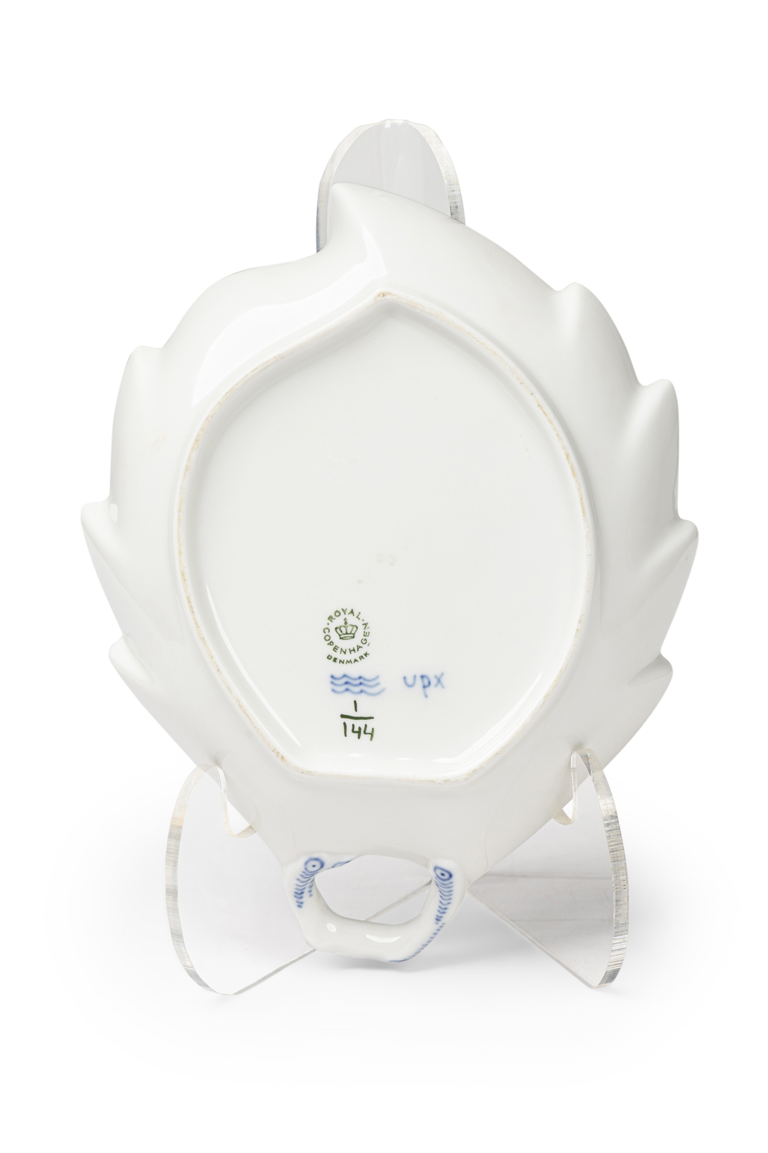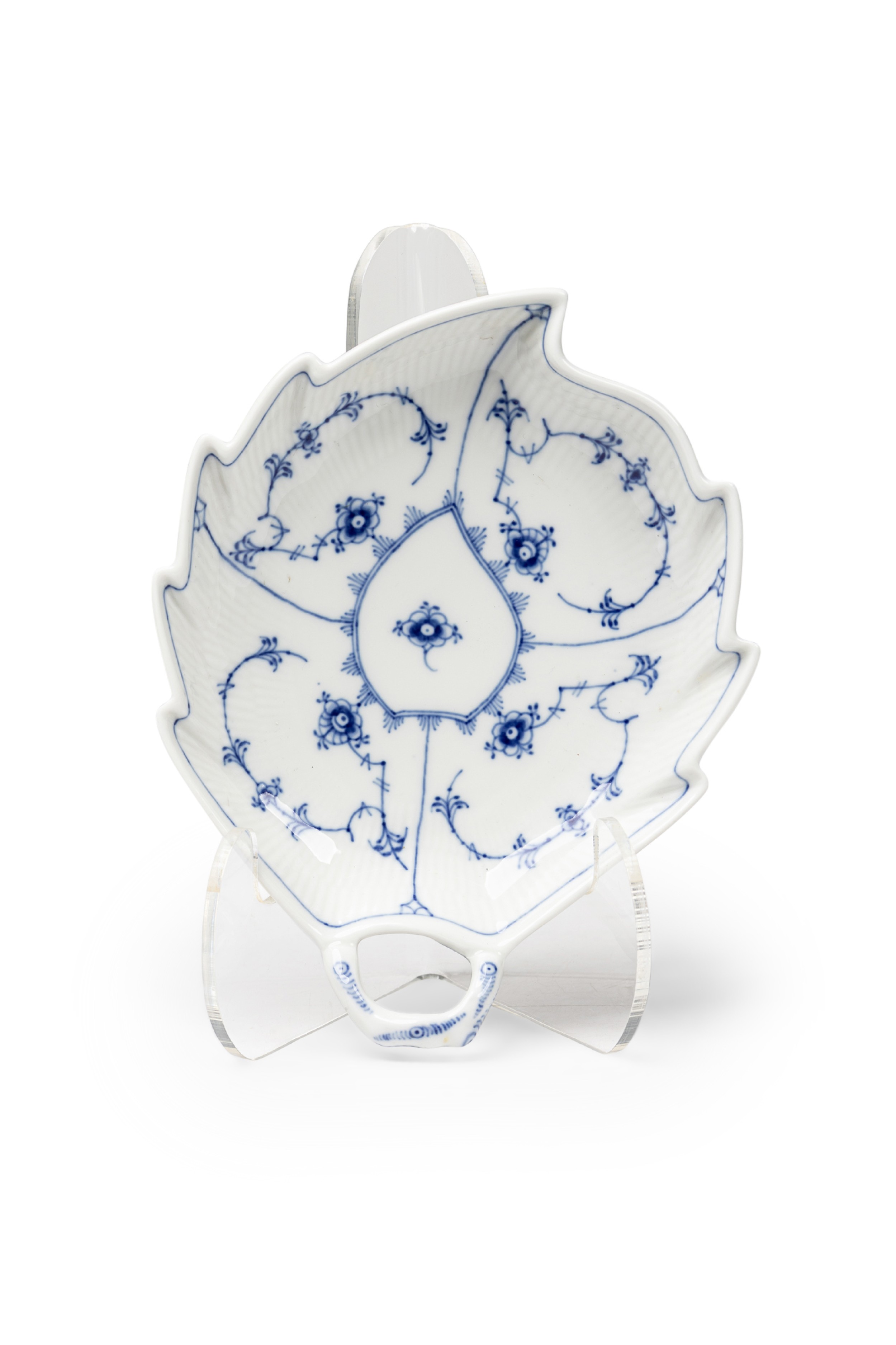 Continental Mid-Century Royal Copenhagen blue onion porcelain dish in the shape of a leaf with a hand painted floral design and a handle (marked: ROYAL COPENHAGEN, 1/144, UPX)