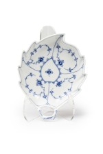 Continental Mid-Century Royal Copenhagen blue onion porcelain dish in the shape of a leaf with a hand painted floral design and a handle (marked: ROYAL COPENHAGEN, 1/144, UPX).