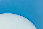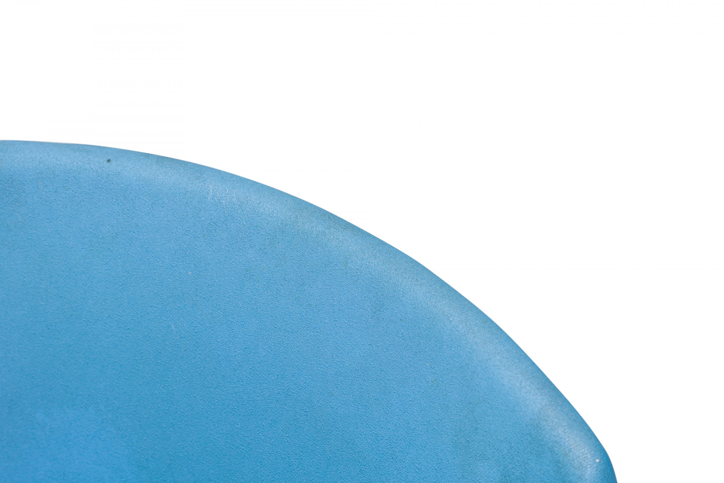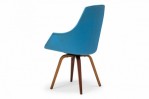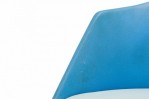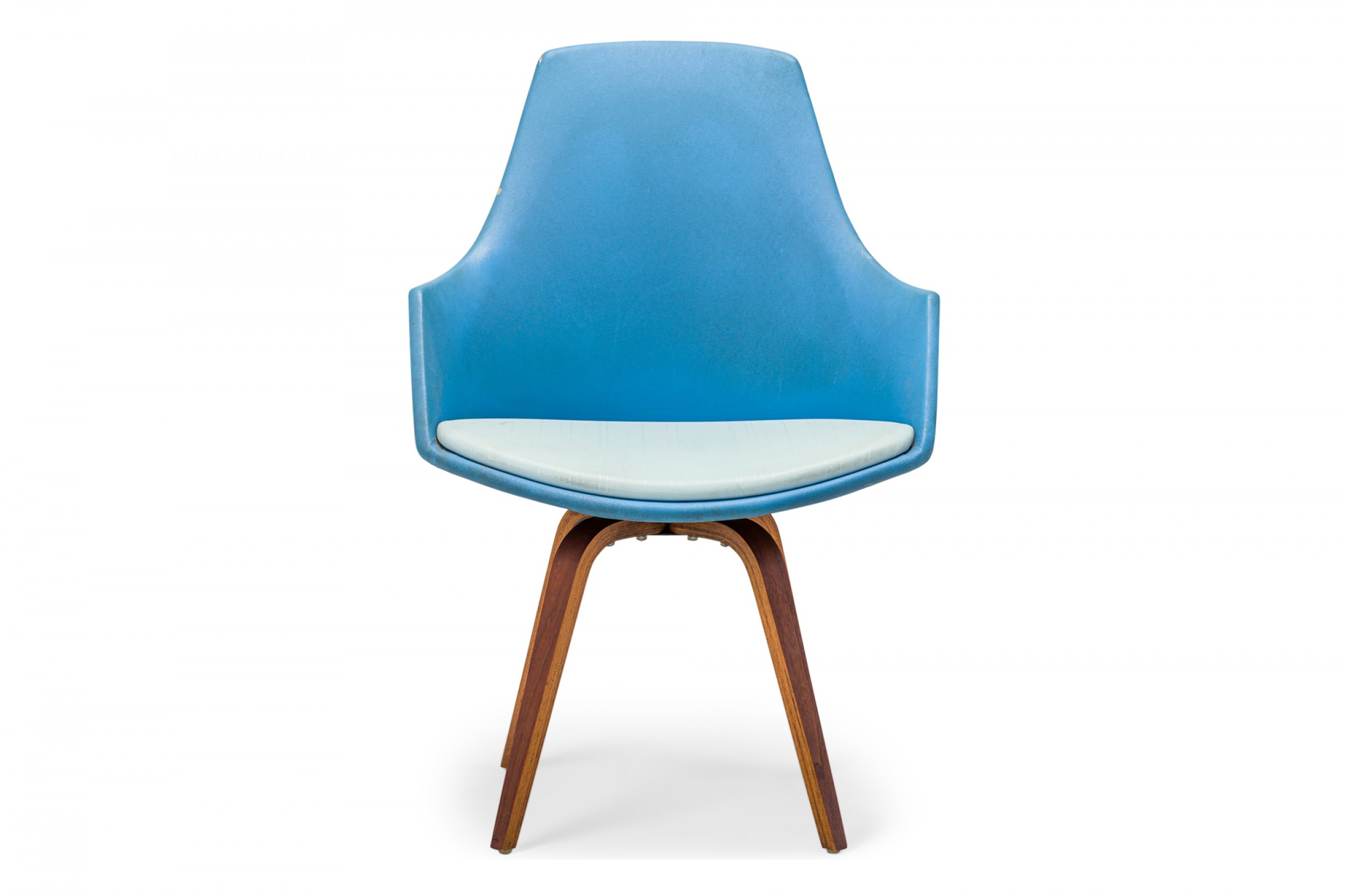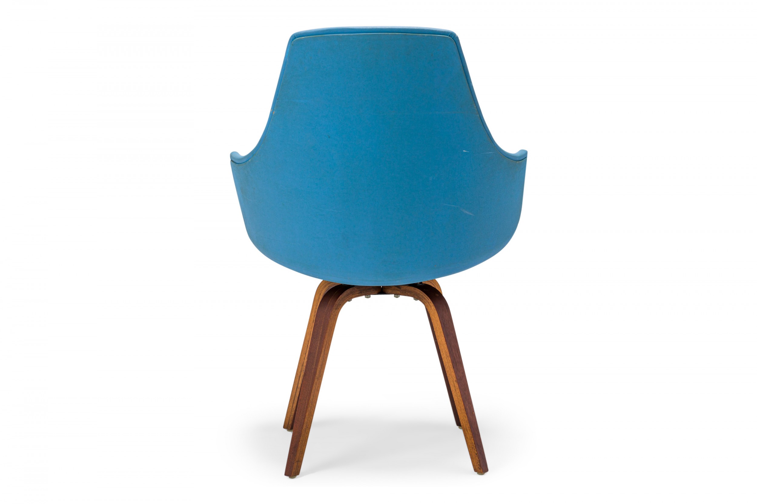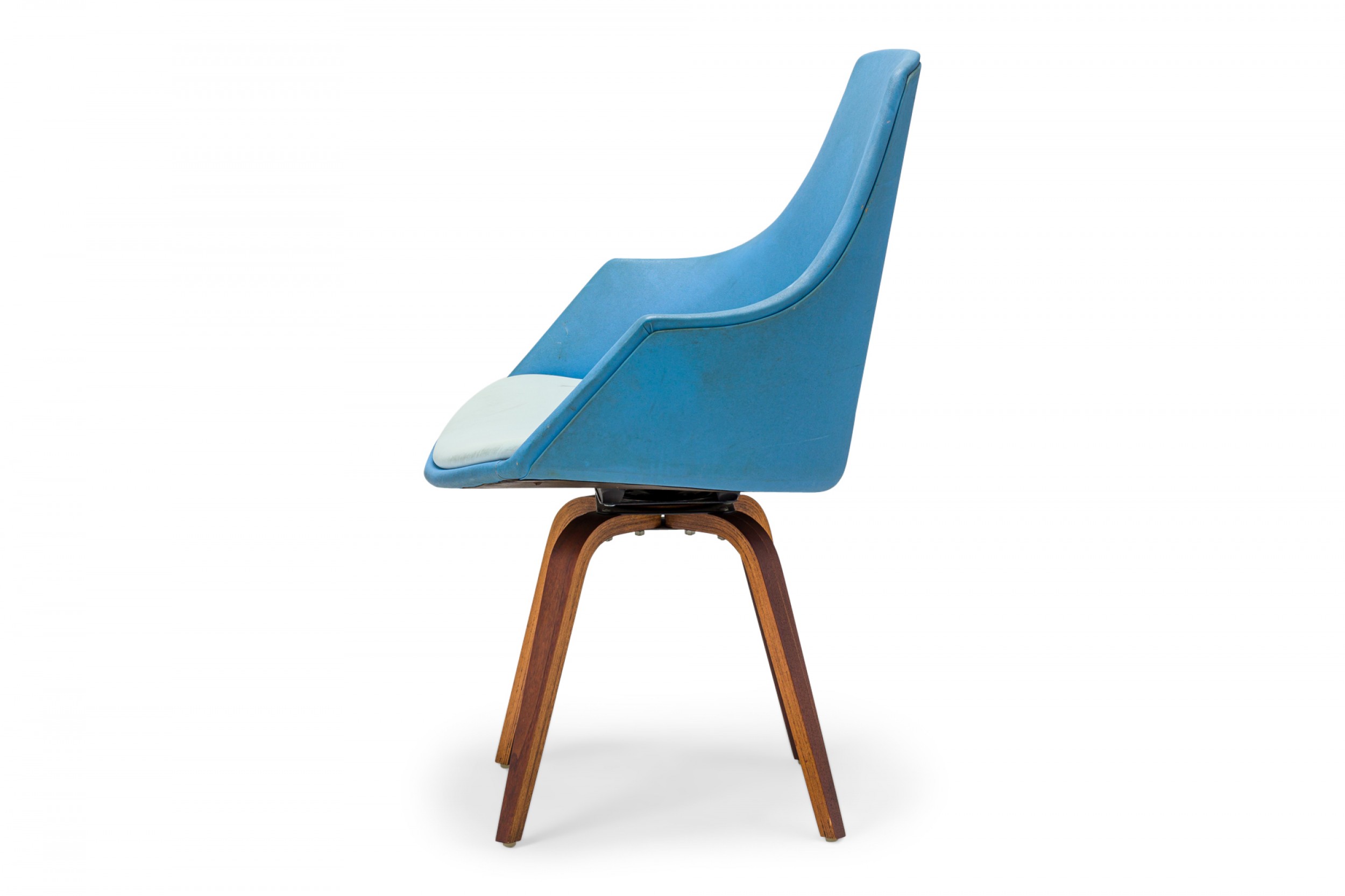 American Mid-Century swivel side / desk chair with a shaped seat and back upholstered in bright and light blue vinyl, resting on a four leg curved plywood base. (NORMAN CHERNER FOR PLYCRAFT)