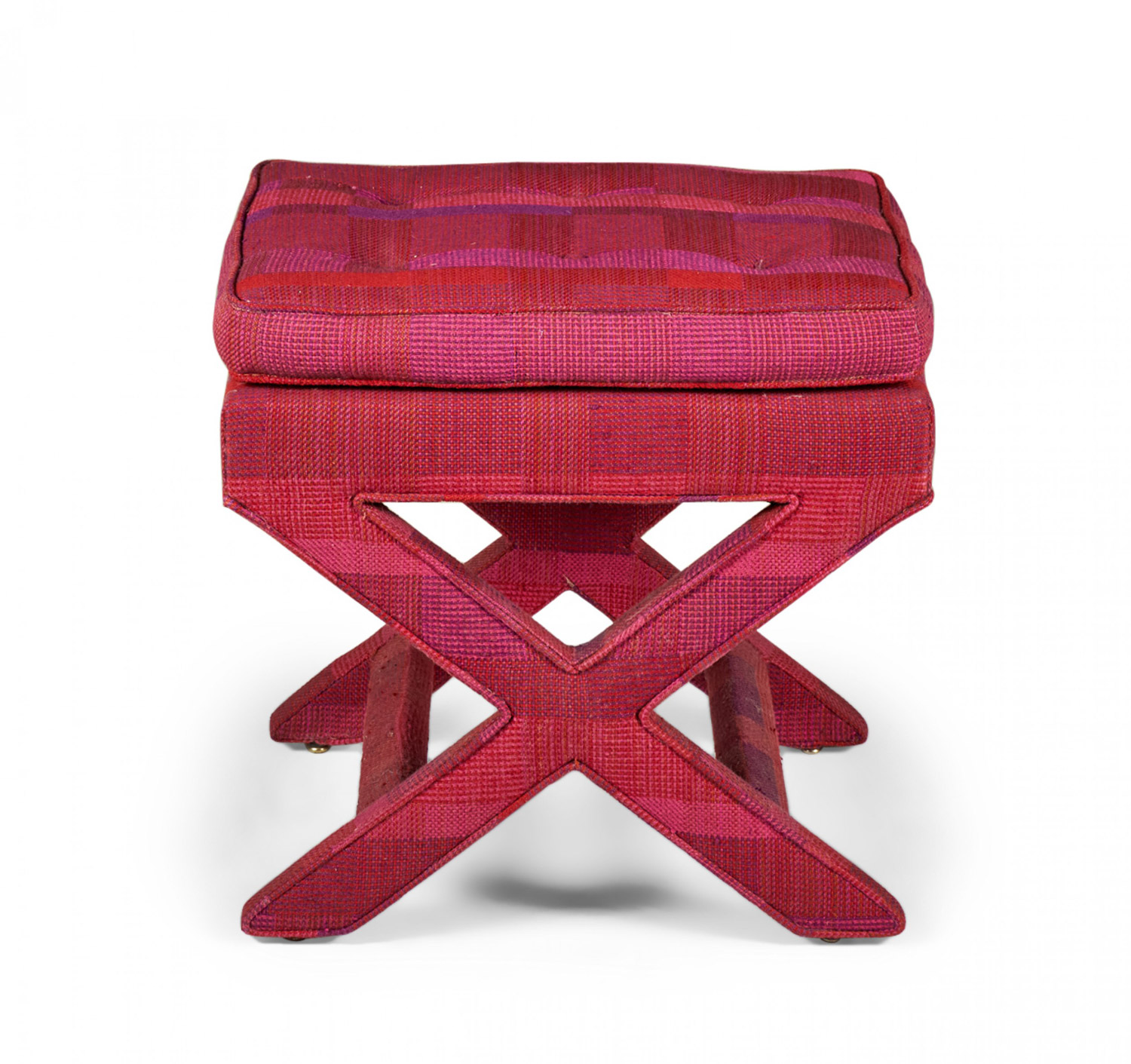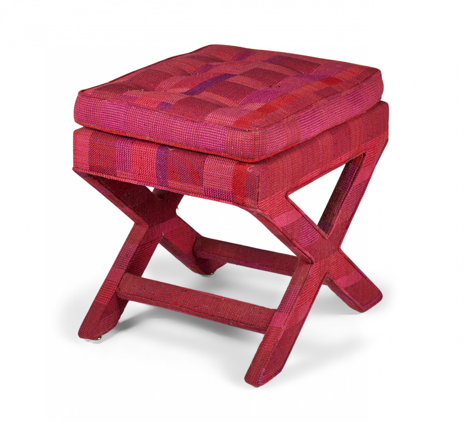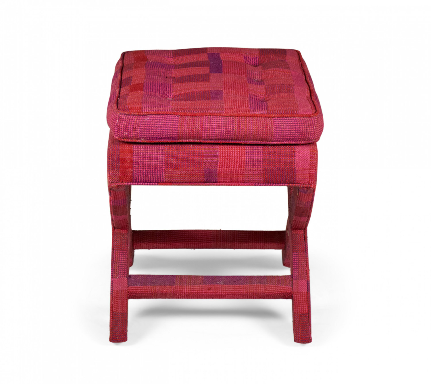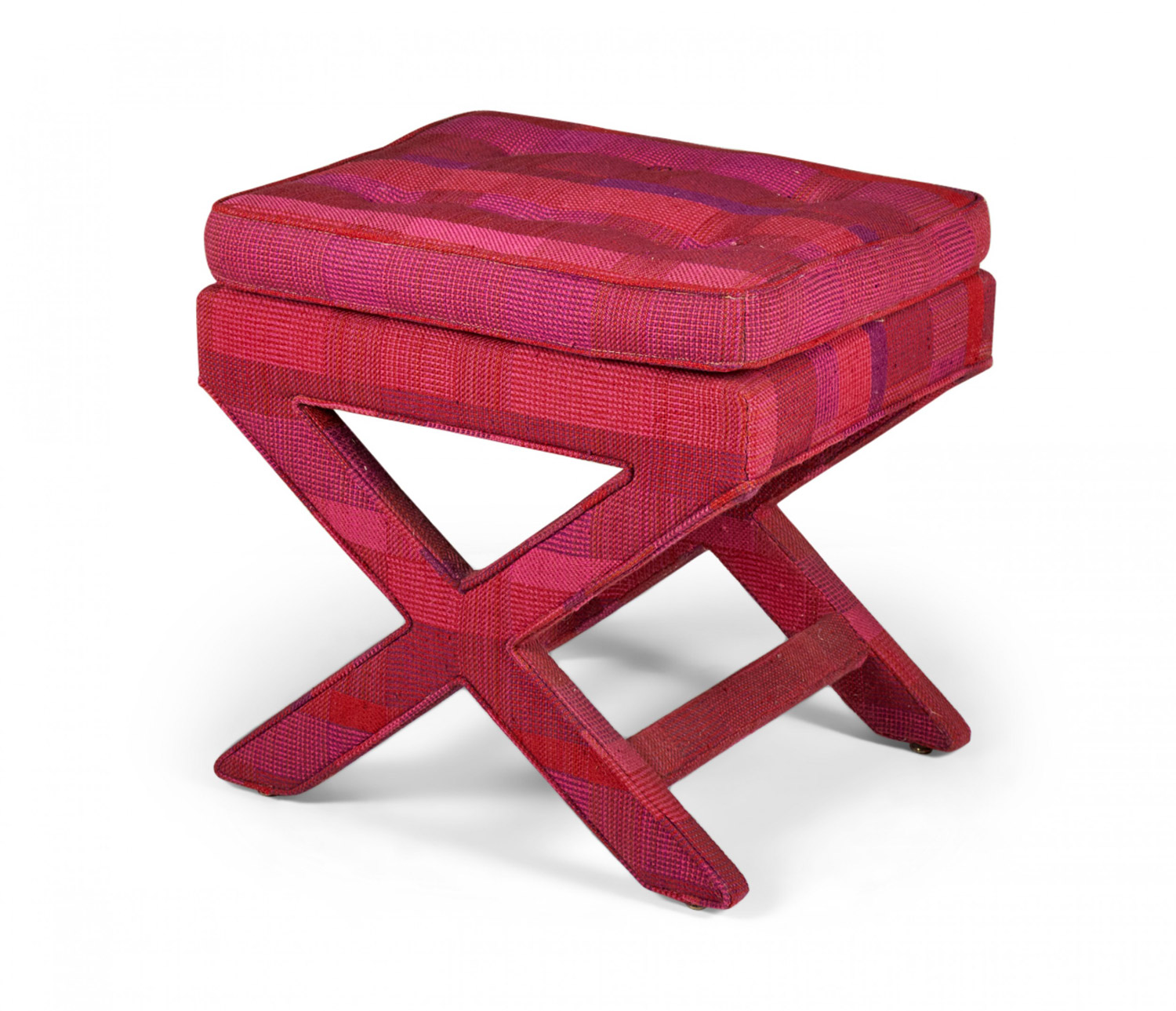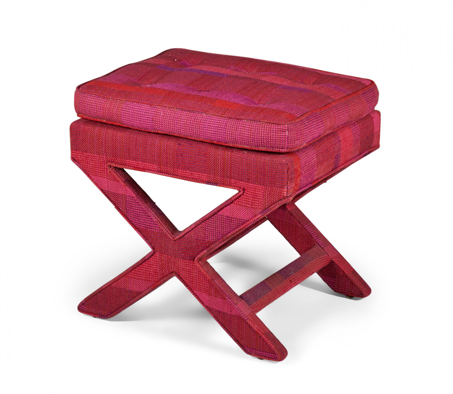PAIR of American Contemporary x-base benches, fully upholstered in a woven fabric in organic stripes of various shades of magenta with button tufted seats. (manner of BILLY BALDWIN)(PRICED AS PAIR).