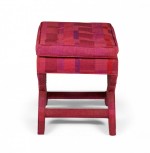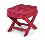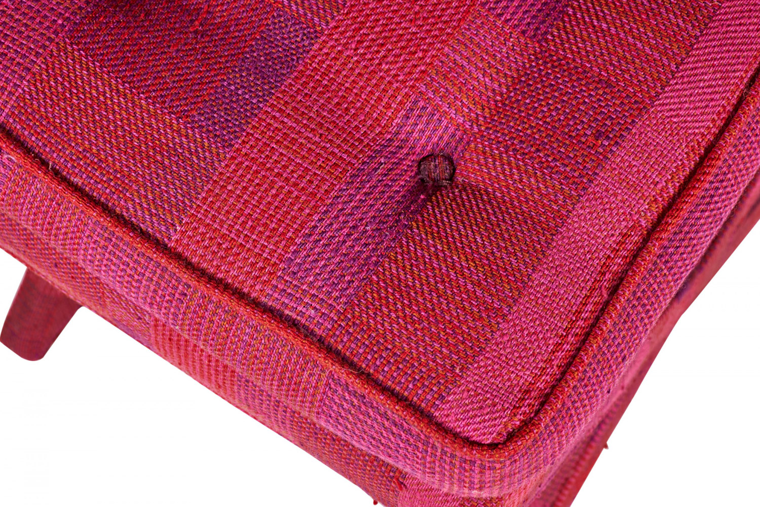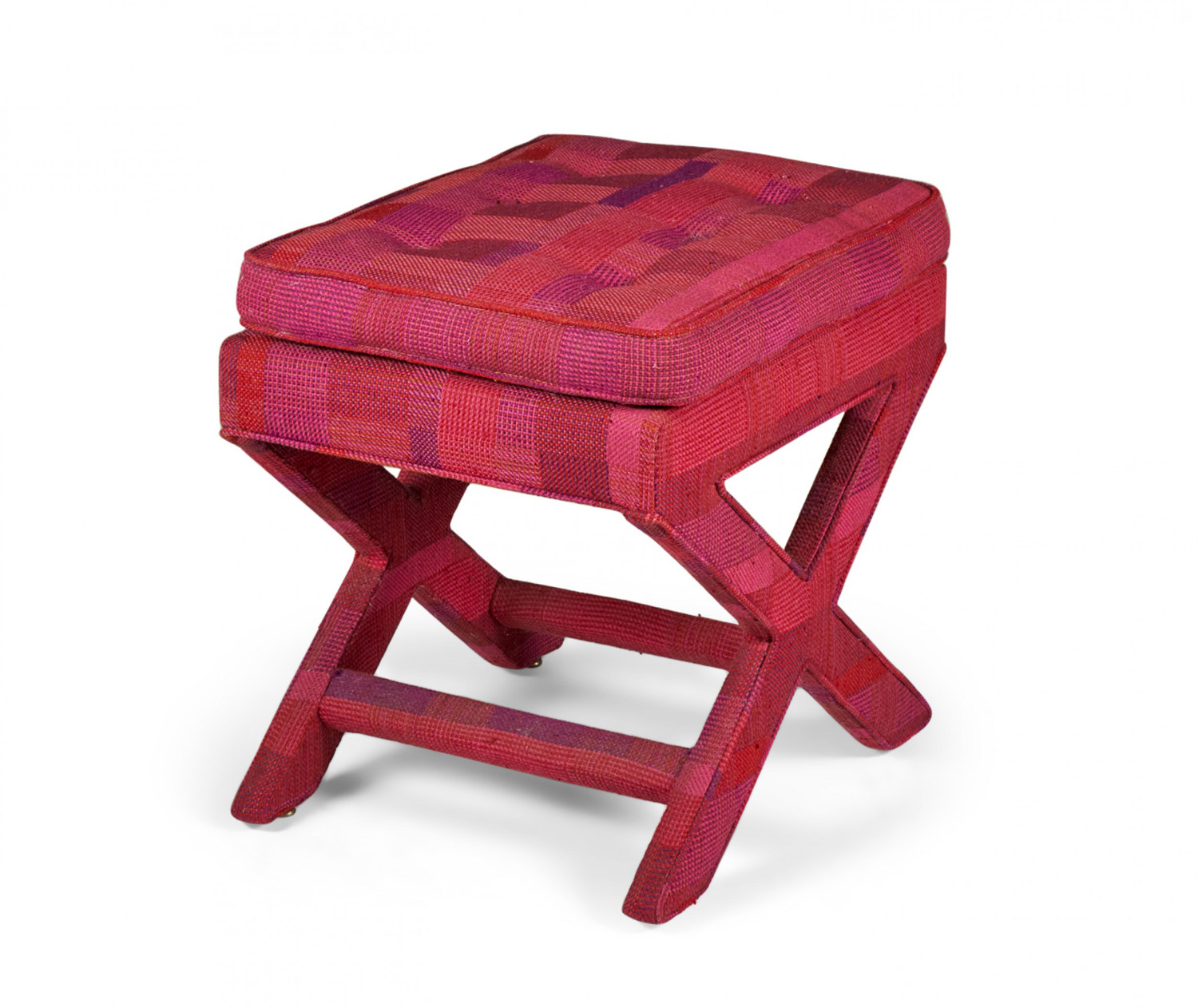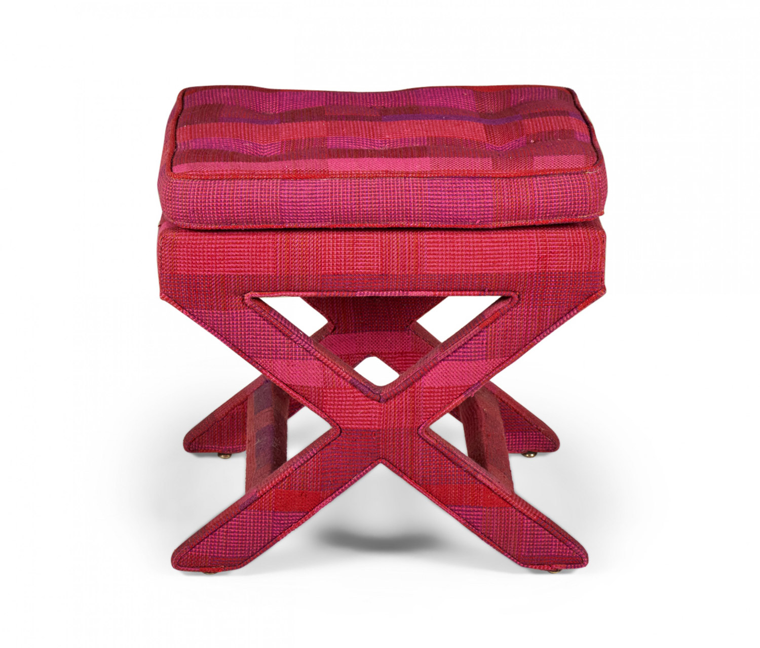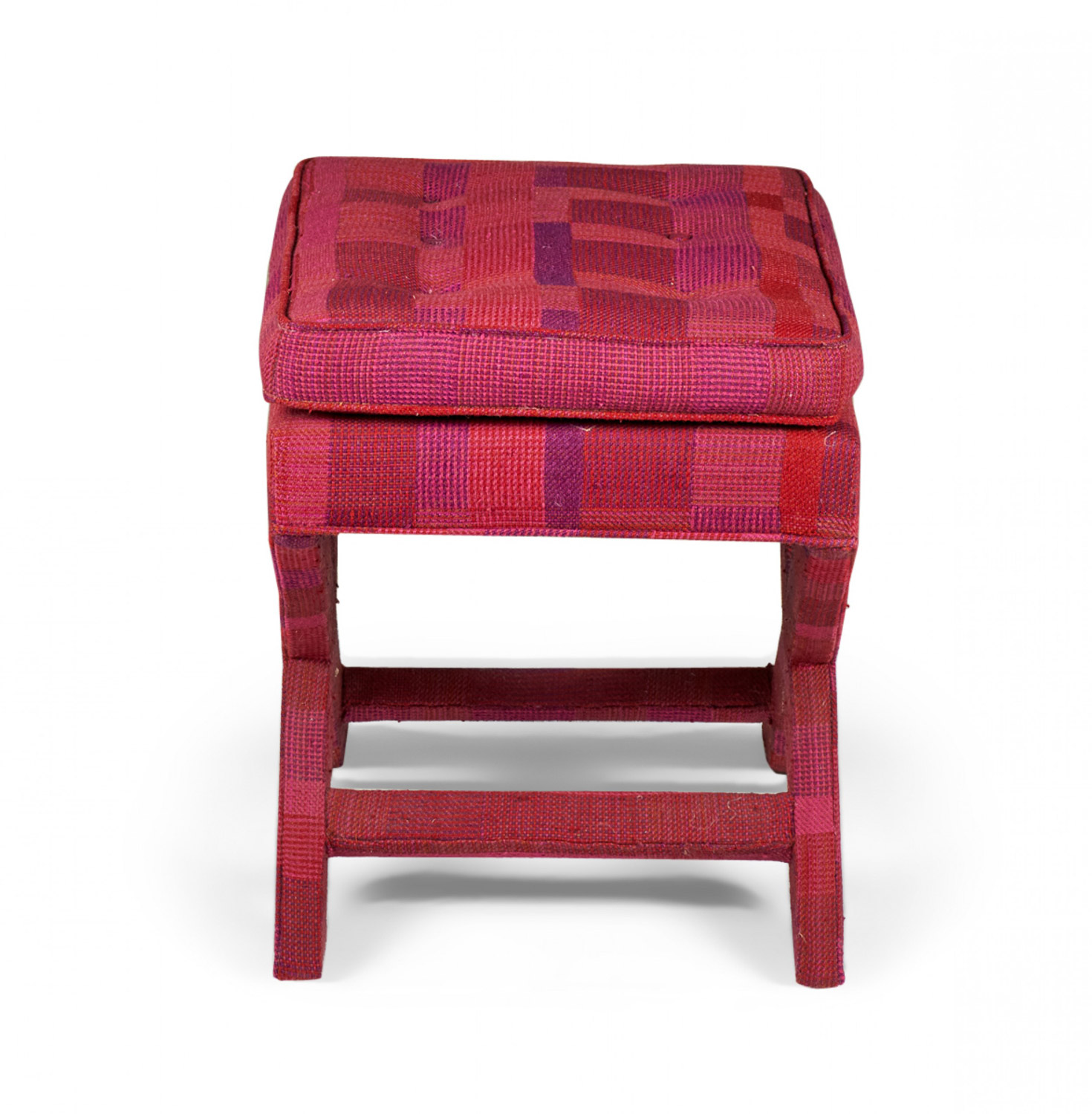 PAIR of American Contemporary x-base benches, fully upholstered in a woven fabric in organic stripes of various shades of magenta with button tufted seats. (manner of BILLY BALDWIN)(PRICED AS PAIR).
