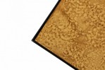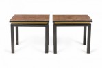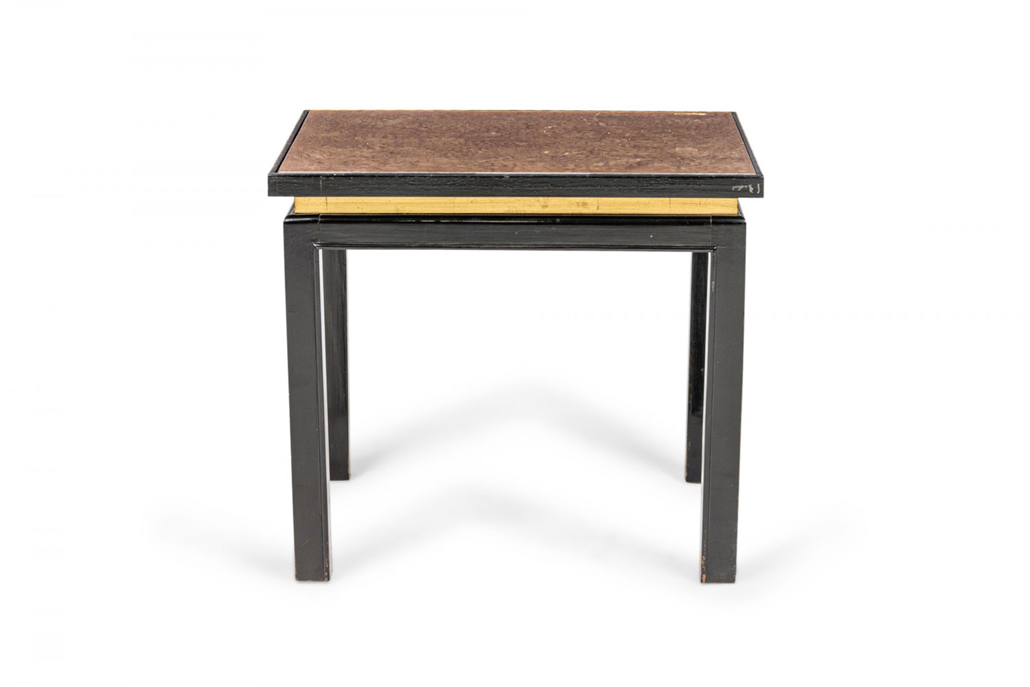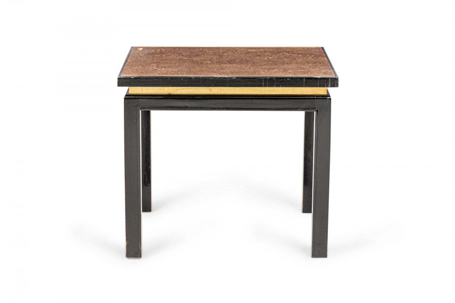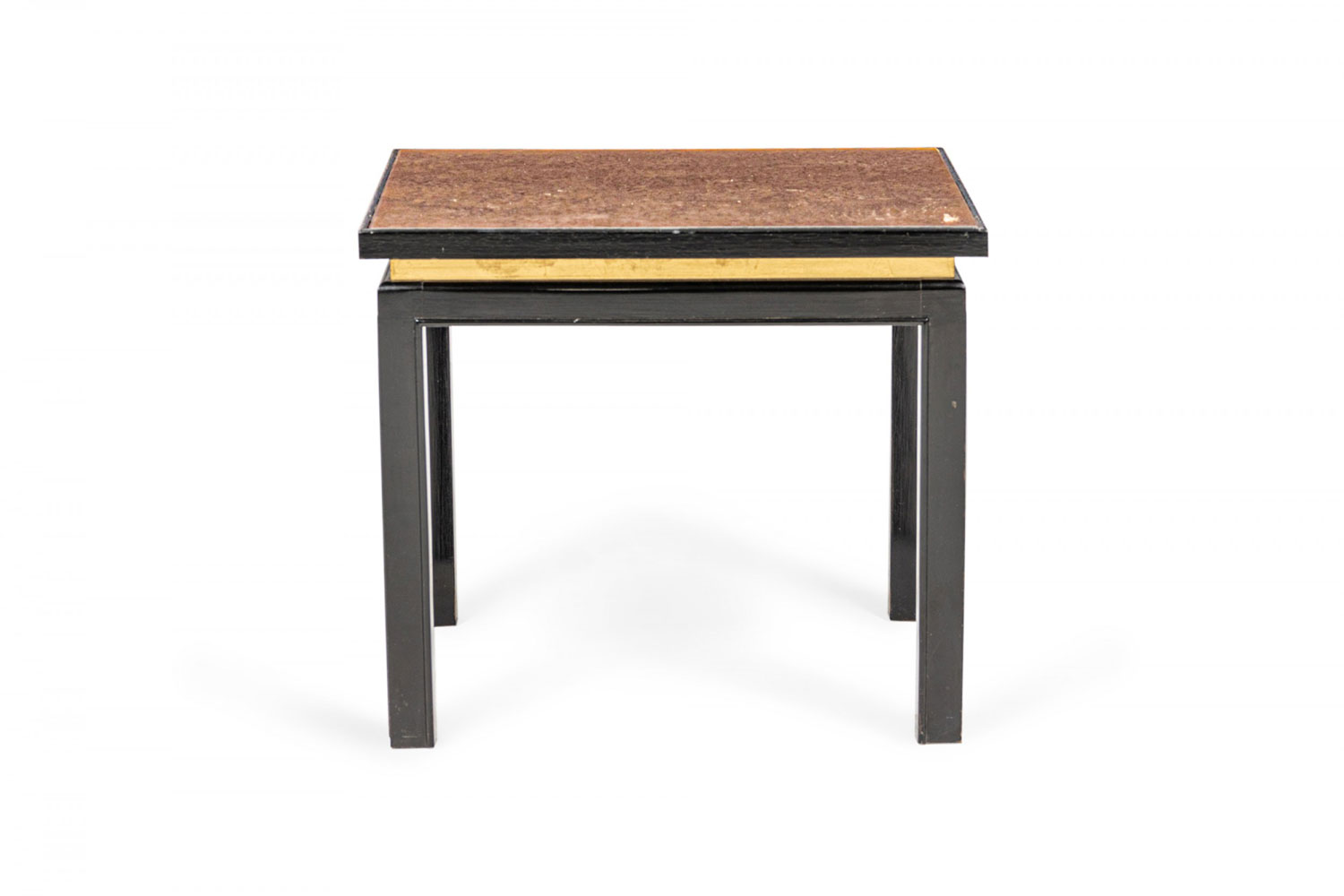 PAIR of American Mid-Century (circa 1960) square end / side tables with similar gold leaf tops beneath glass, supported by a square ebonized frame with gilt section between tabletop and legs. (manner of JAMES MONT)(PRICED AS PAIR).