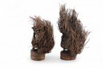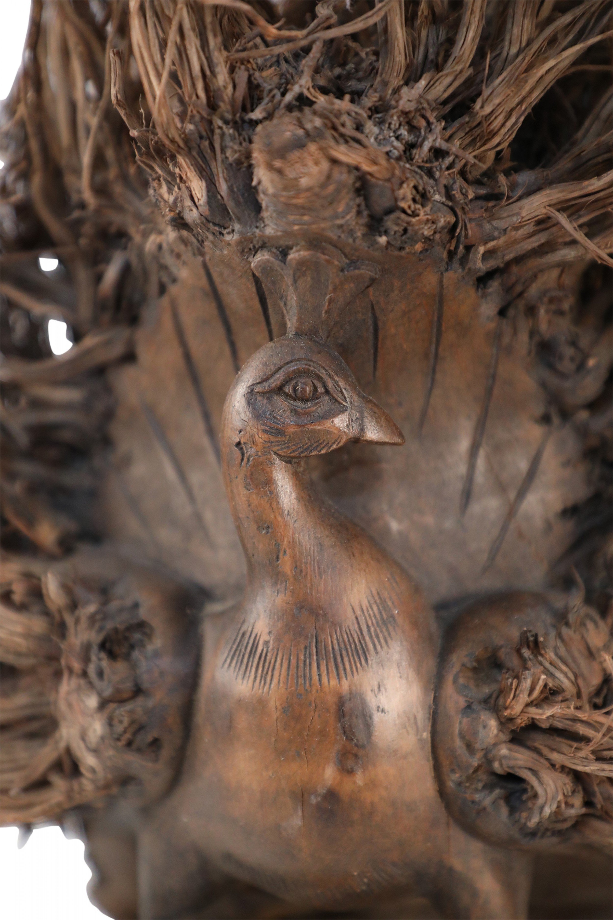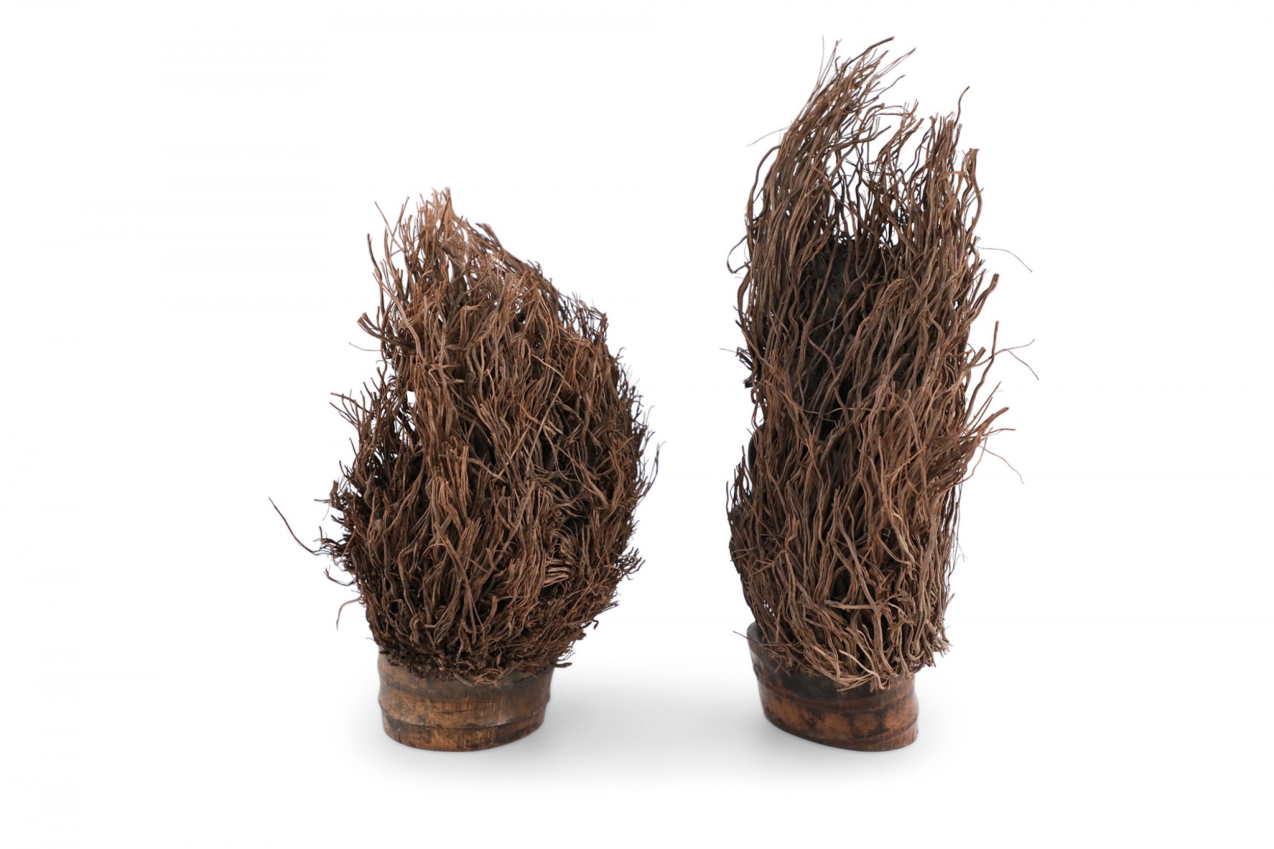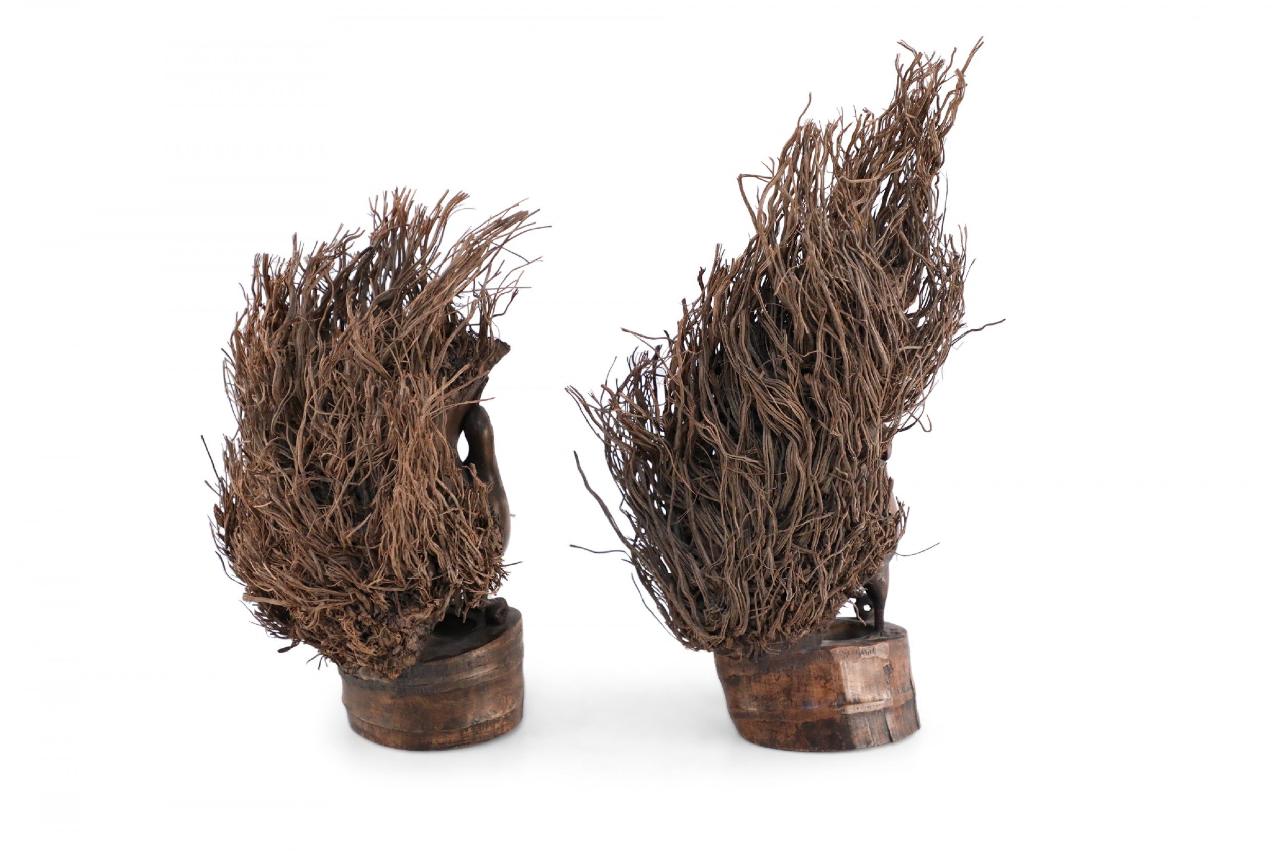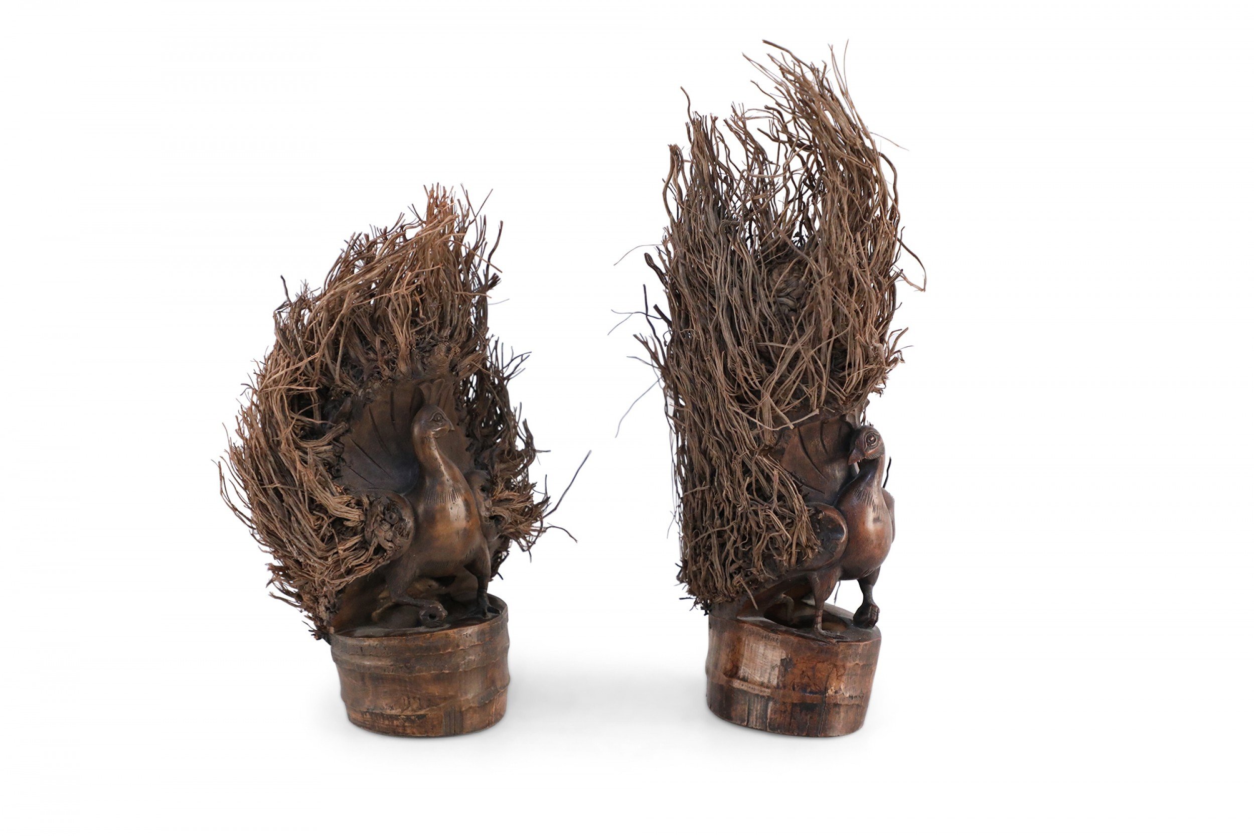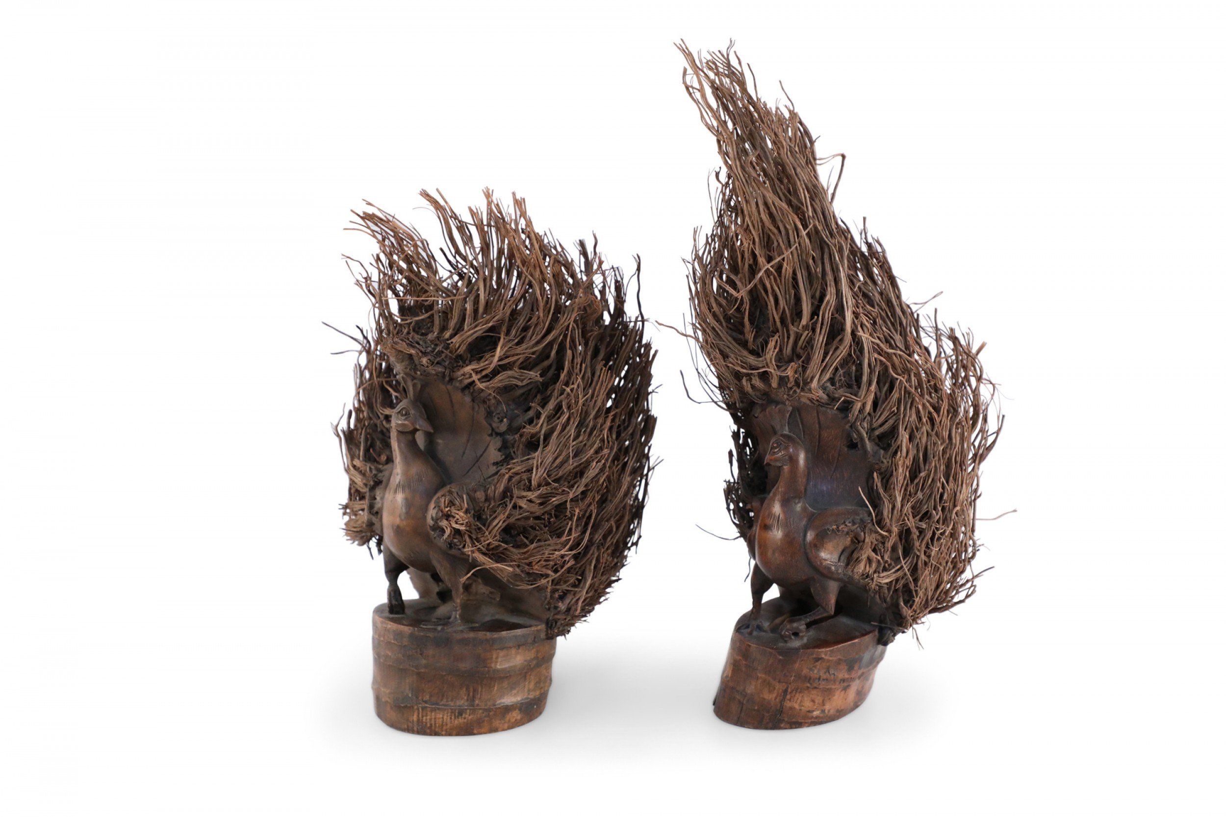 PAIR of similar Chinese peacock sculptures carved from the roots of bamboo, utilizing the main section of the root for the bodies, and the "root hair" to represent the tail feathers, both sitting atop rounded bases (sculptures differ in size and shape)(PRICED AS PAIR).