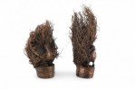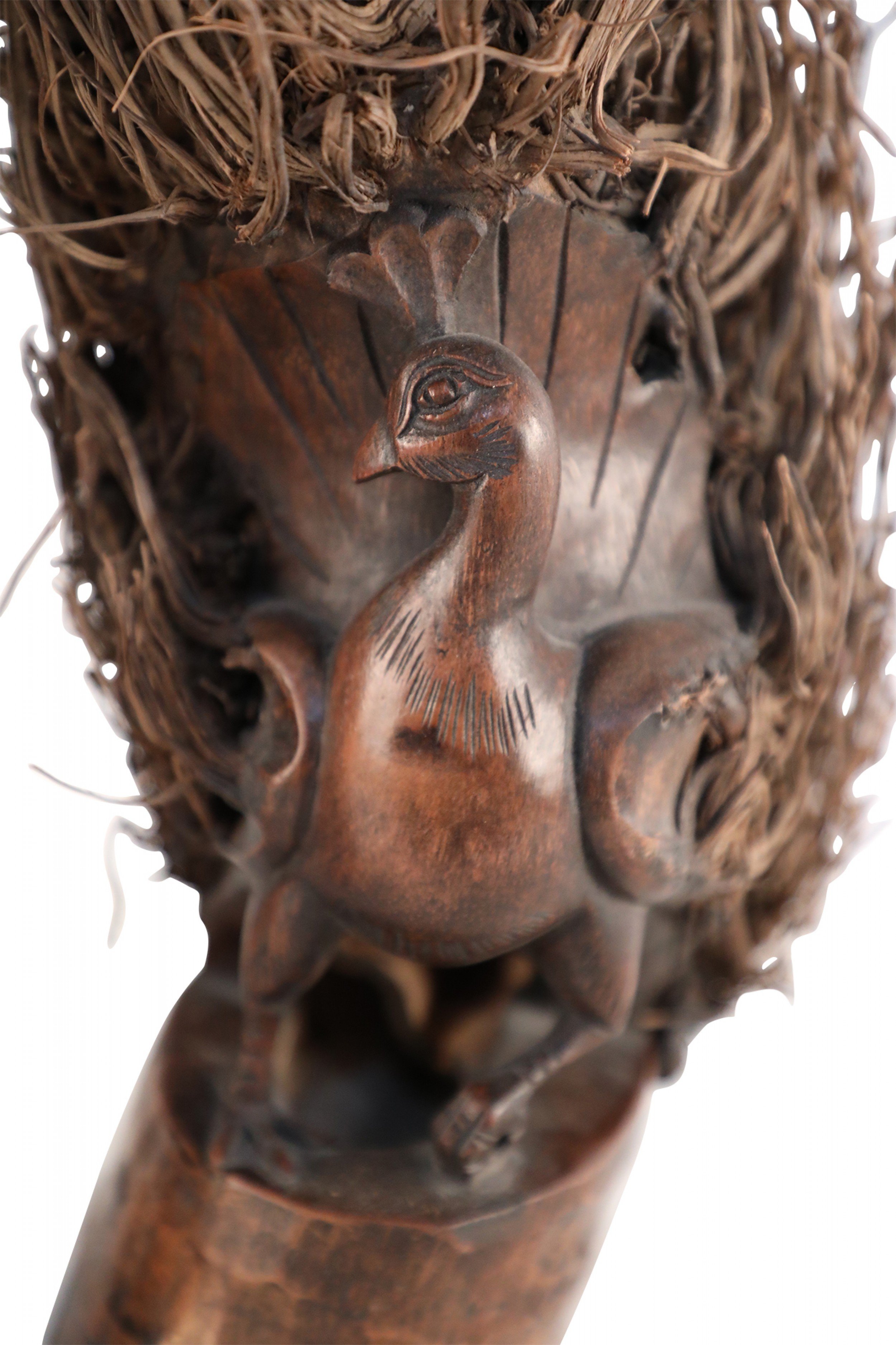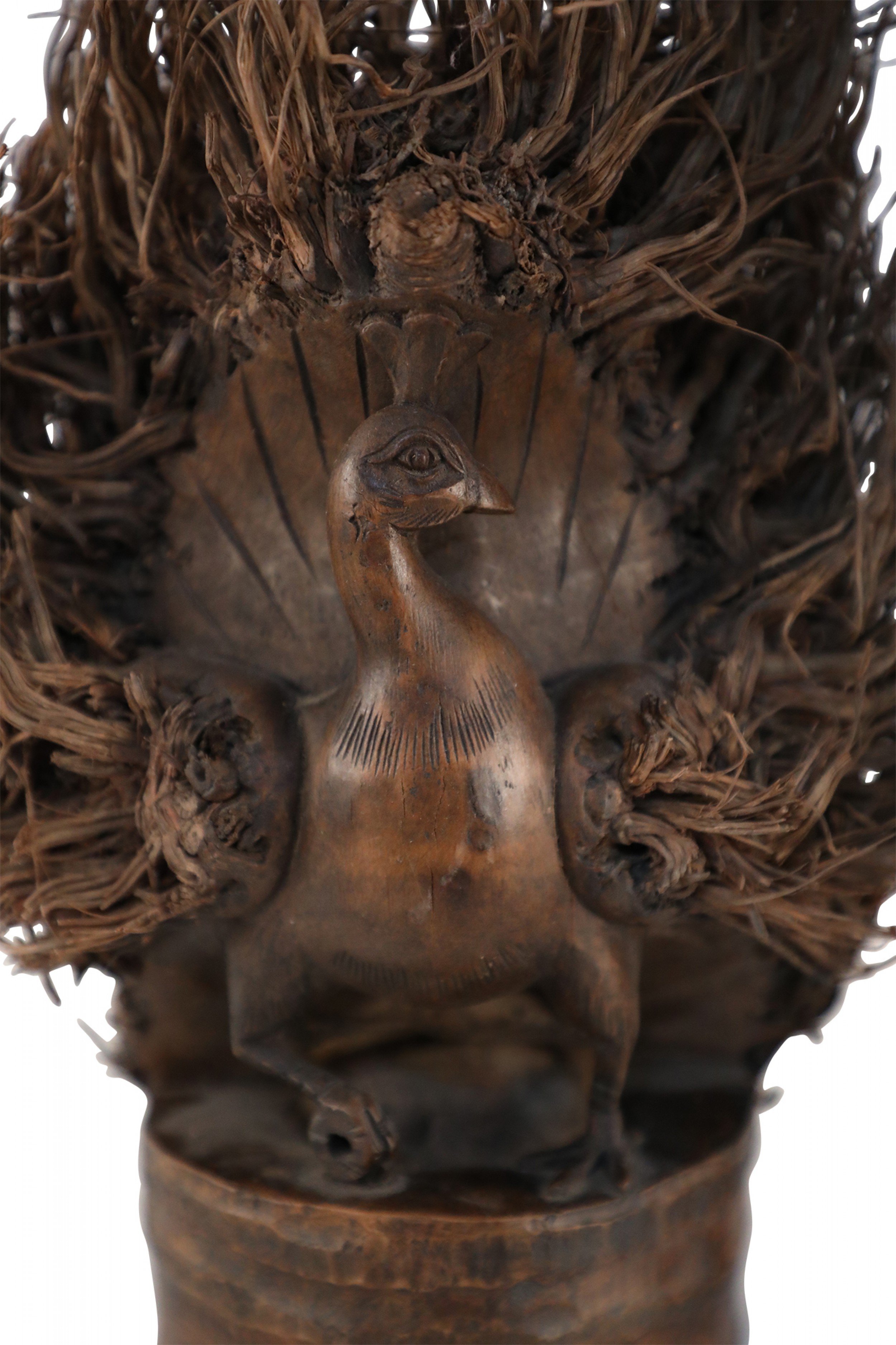 PAIR of similar Chinese peacock sculptures carved from the roots of bamboo, utilizing the main section of the root for the bodies, and the "root hair" to represent the tail feathers, both sitting atop rounded bases (sculptures differ in size and shape)(PRICED AS PAIR)