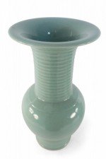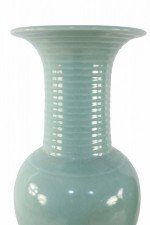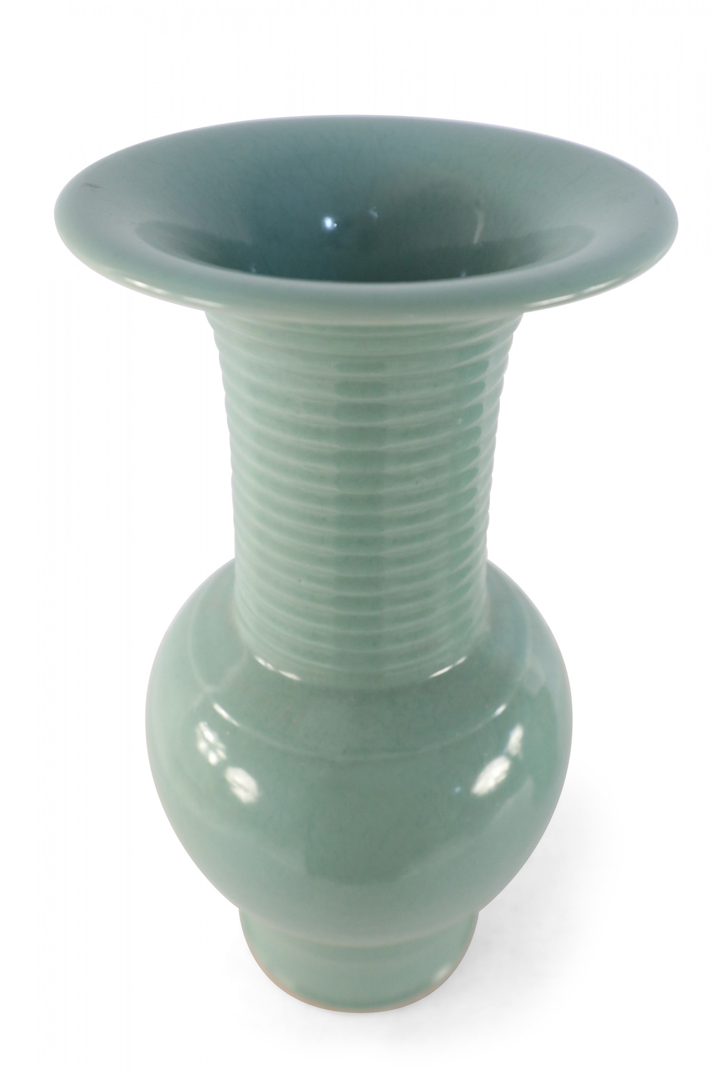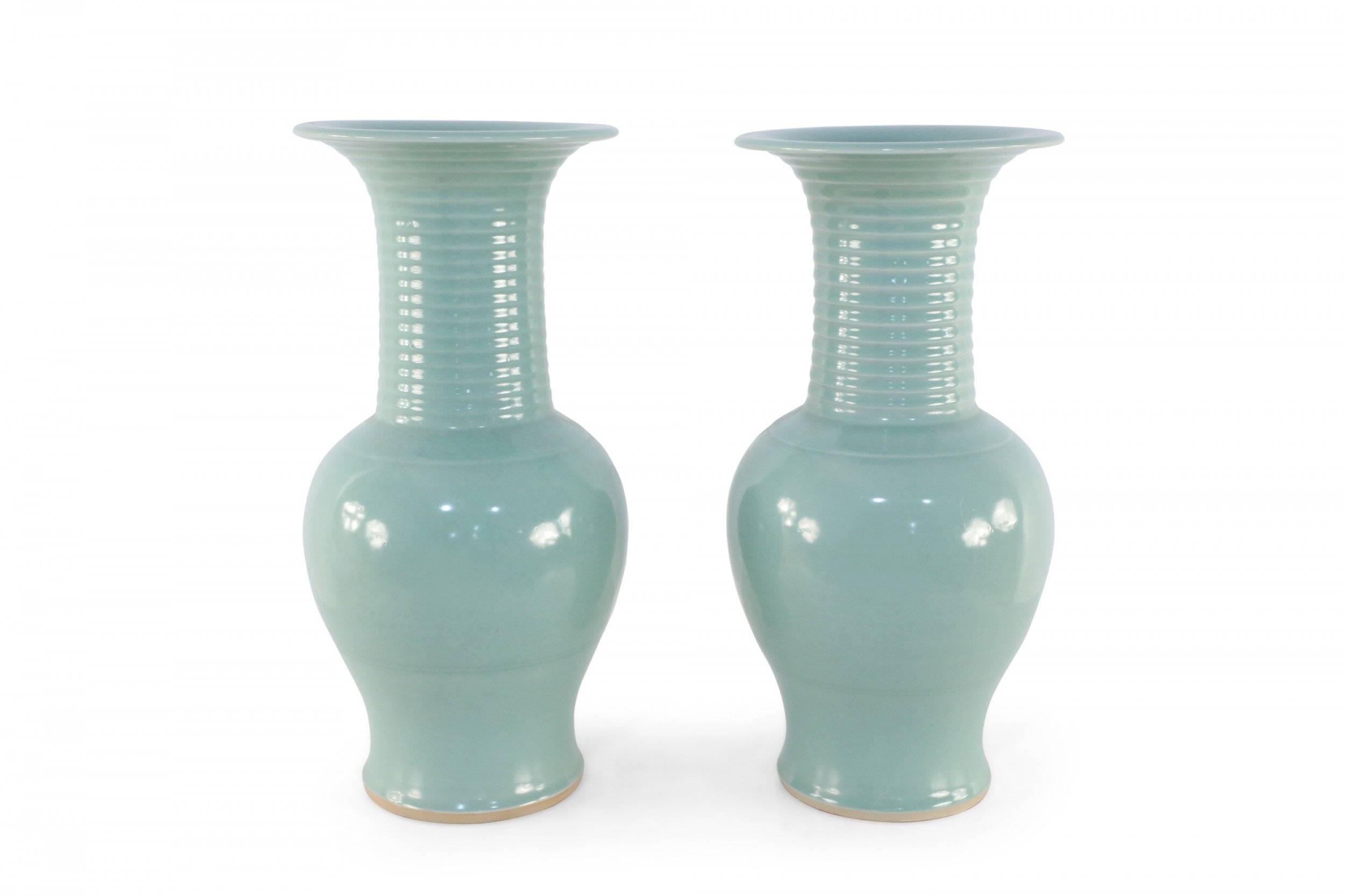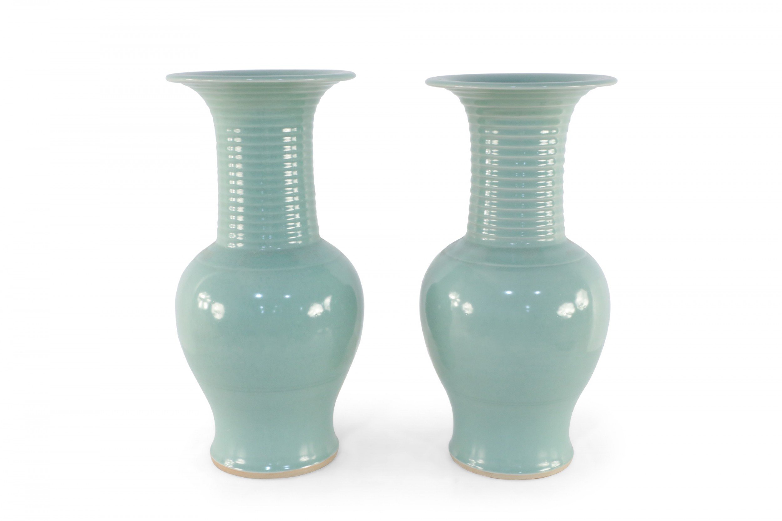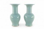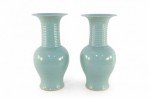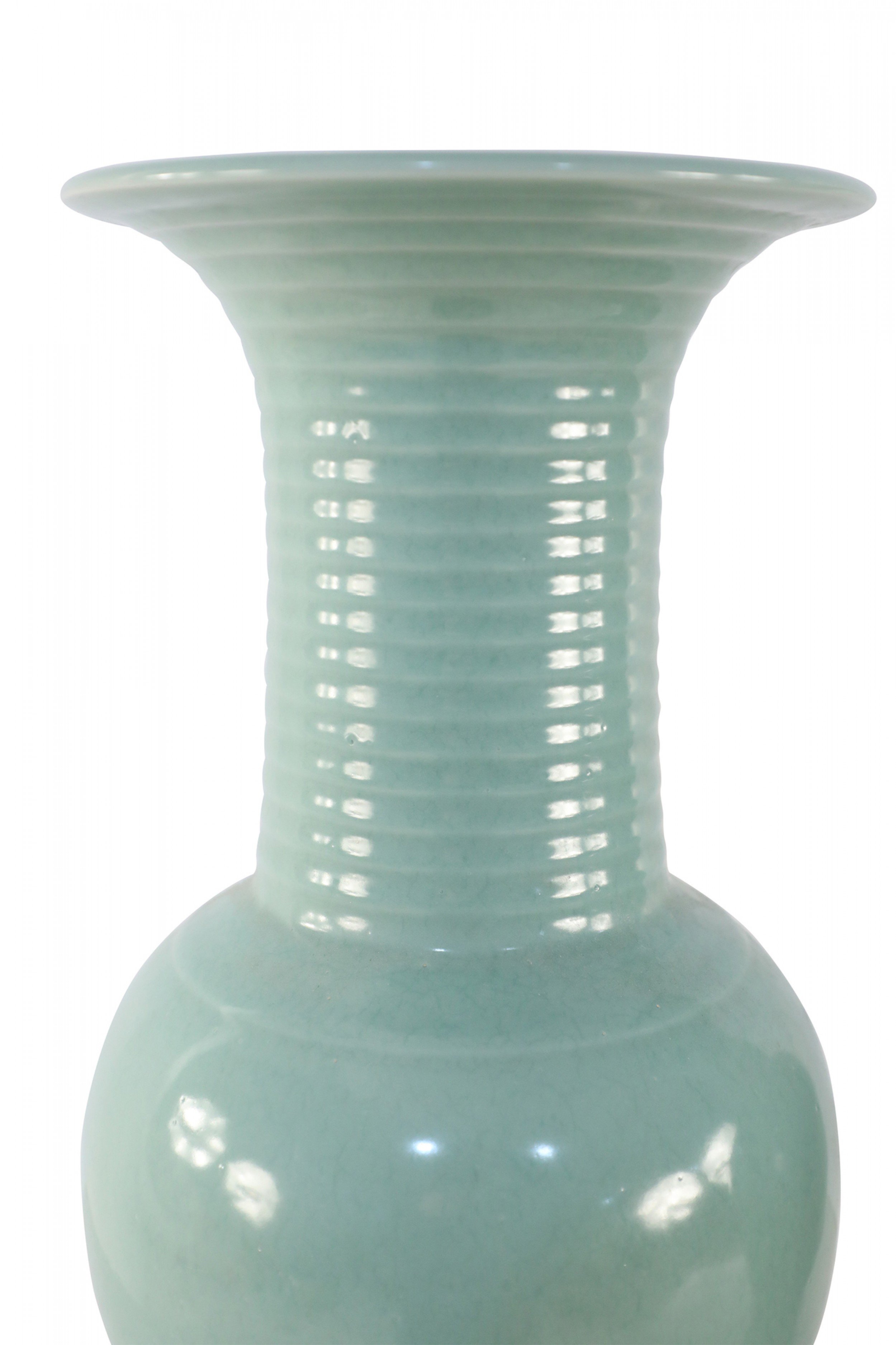 PAIR of Chinese celadon porcelain urns with continuous raised swirling motifs flowing up the slender, fluted necks. (PRICED AS PAIR)..