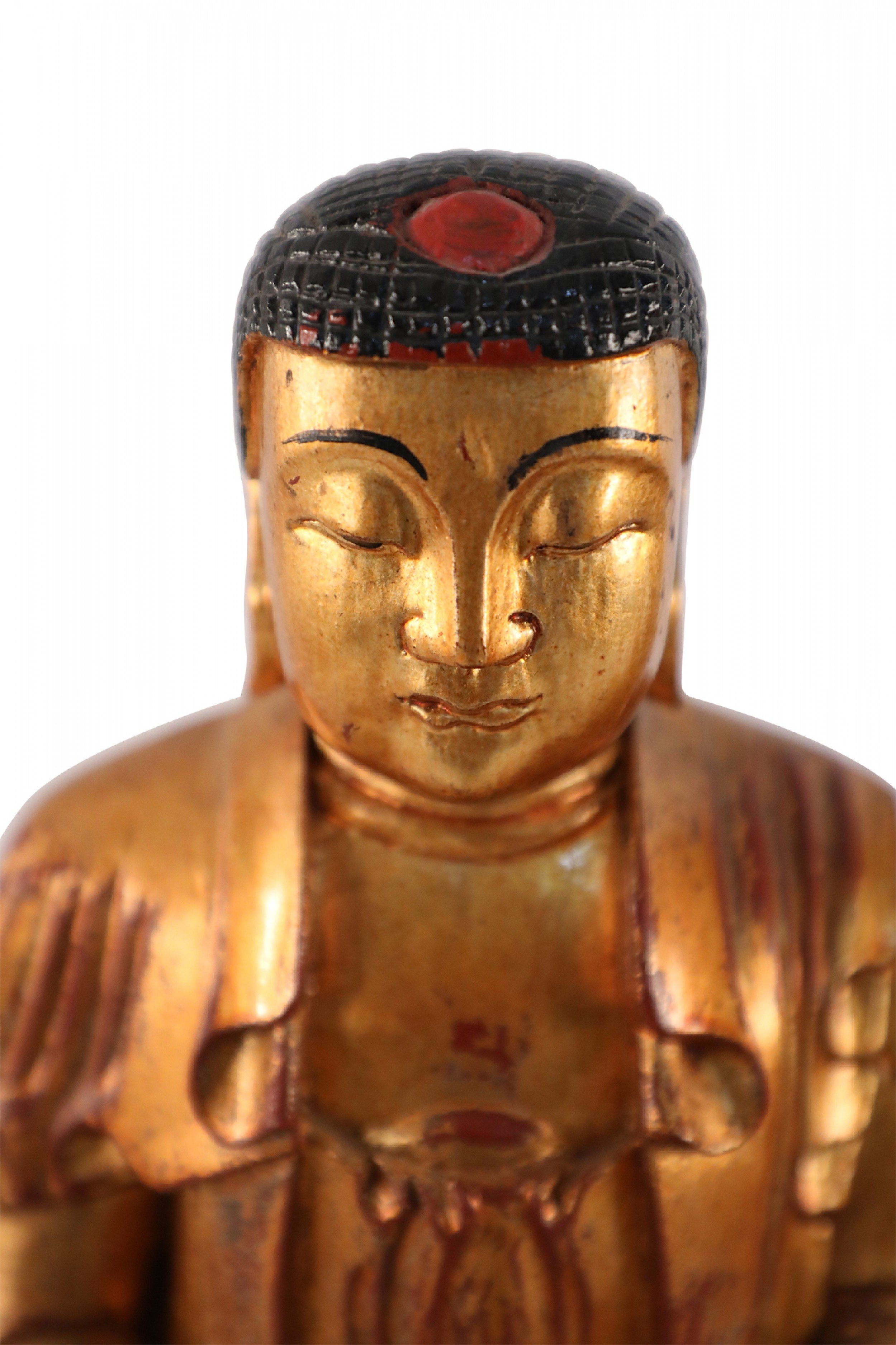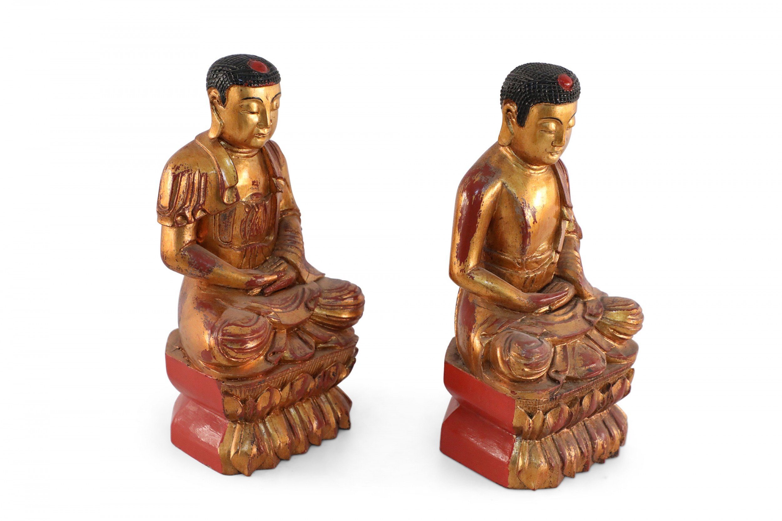 PAIR of Chinese gold, carved wooden Buddha figures seated atop floral and red platform bases (PRICED AS PAIR).