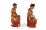 PAIR of Chinese gold, carved wooden Buddha figures seated atop floral and red platform bases (PRICED AS PAIR)