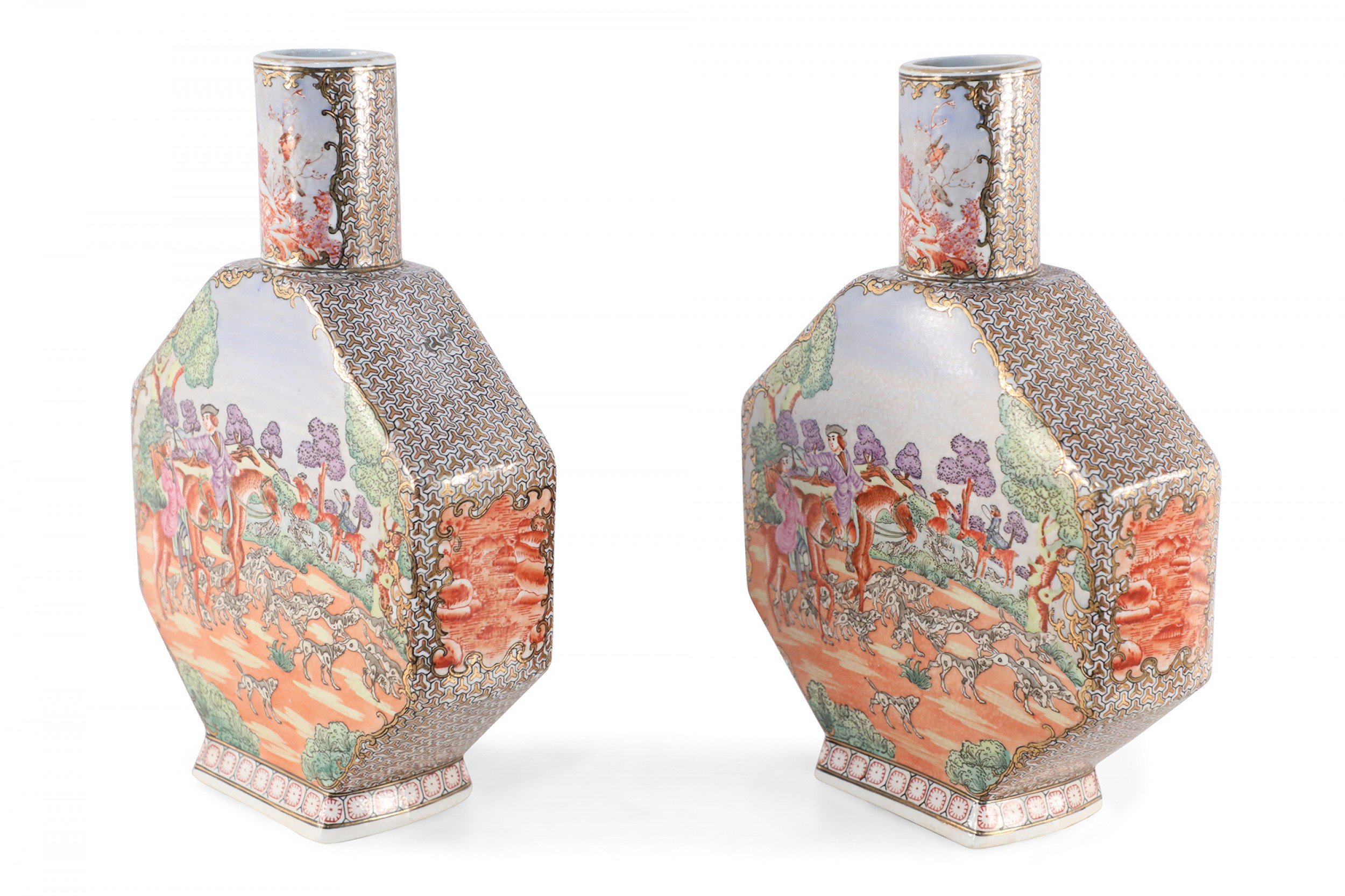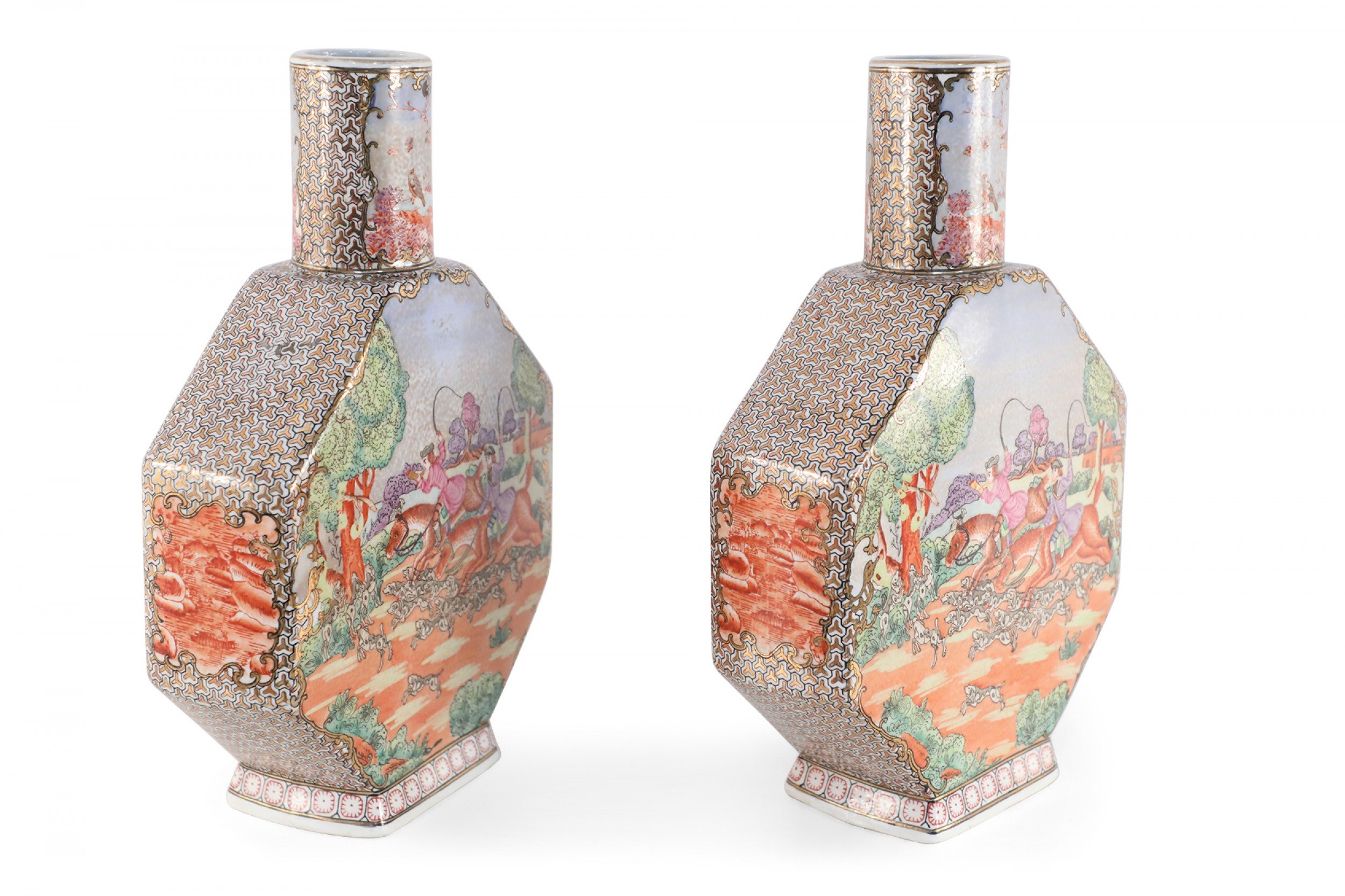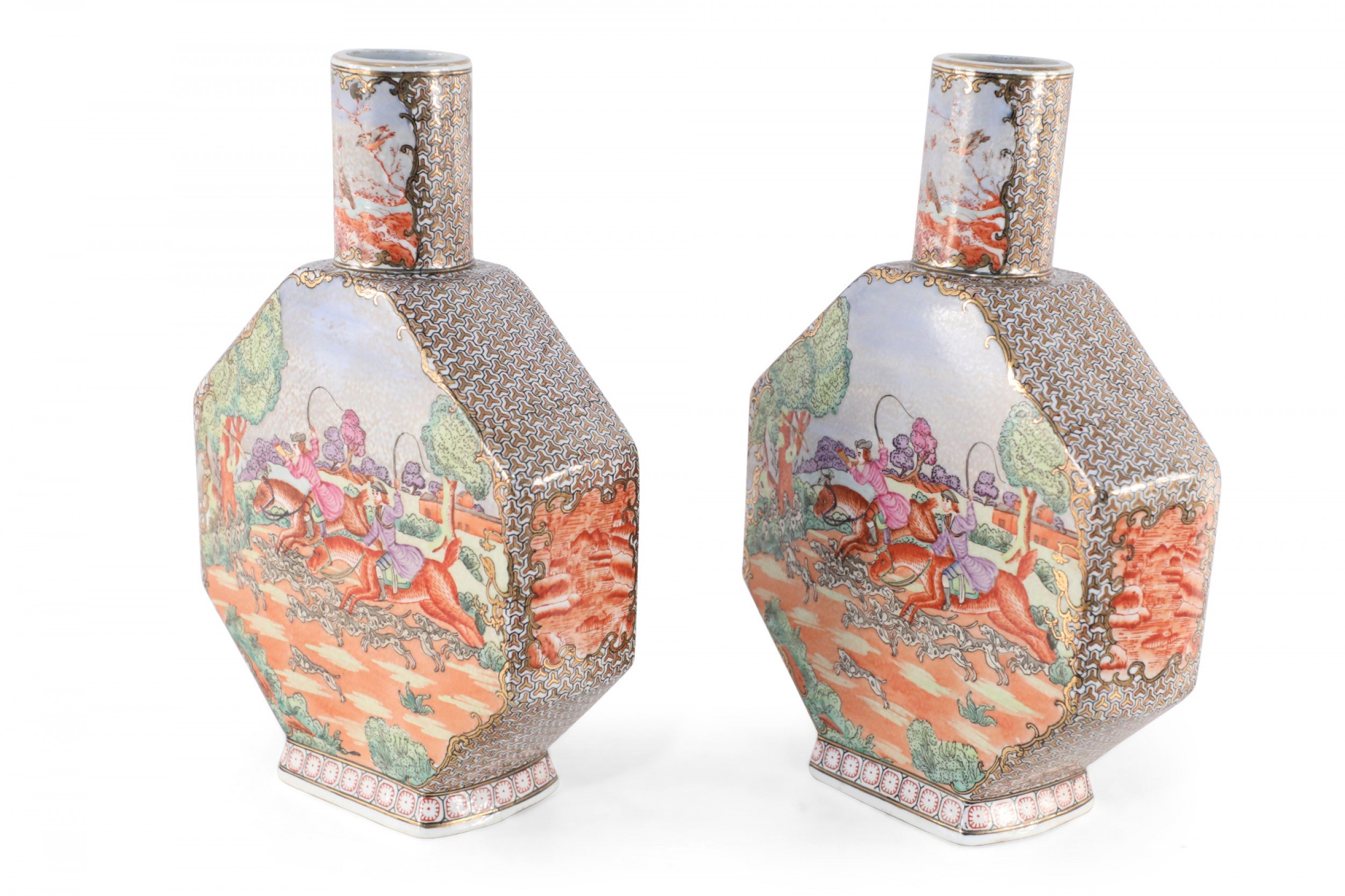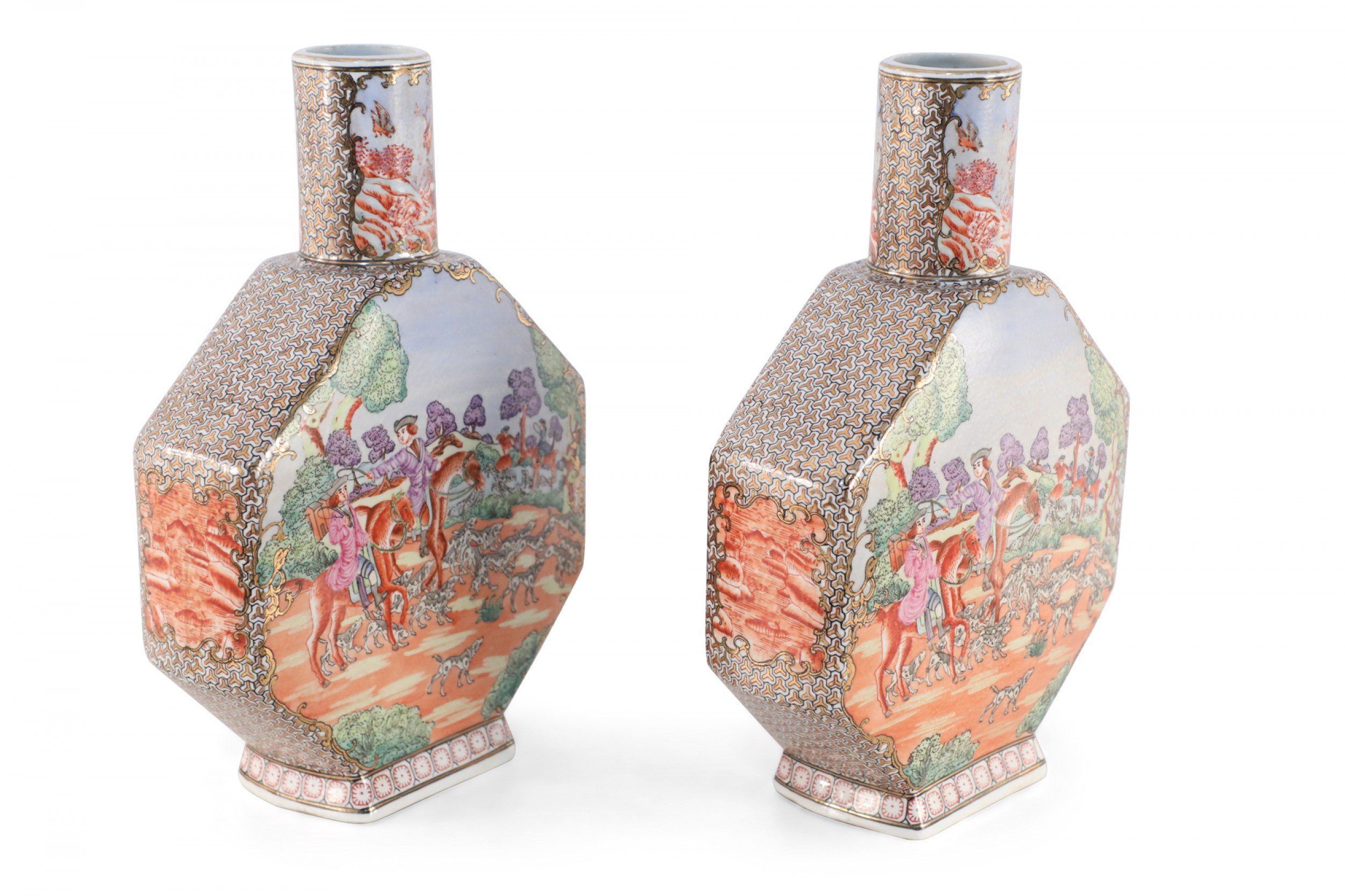 PAIR of Antique Chinese (Early 20th Century) Guangzhou painted export porcelain moonflask vases depicting richly colored dog hunt scenes on the bodies and gold patterned sides surrounding salmon-colored bucolic vignettes.(PRICED AS PAIR)(Related: NWL2152).