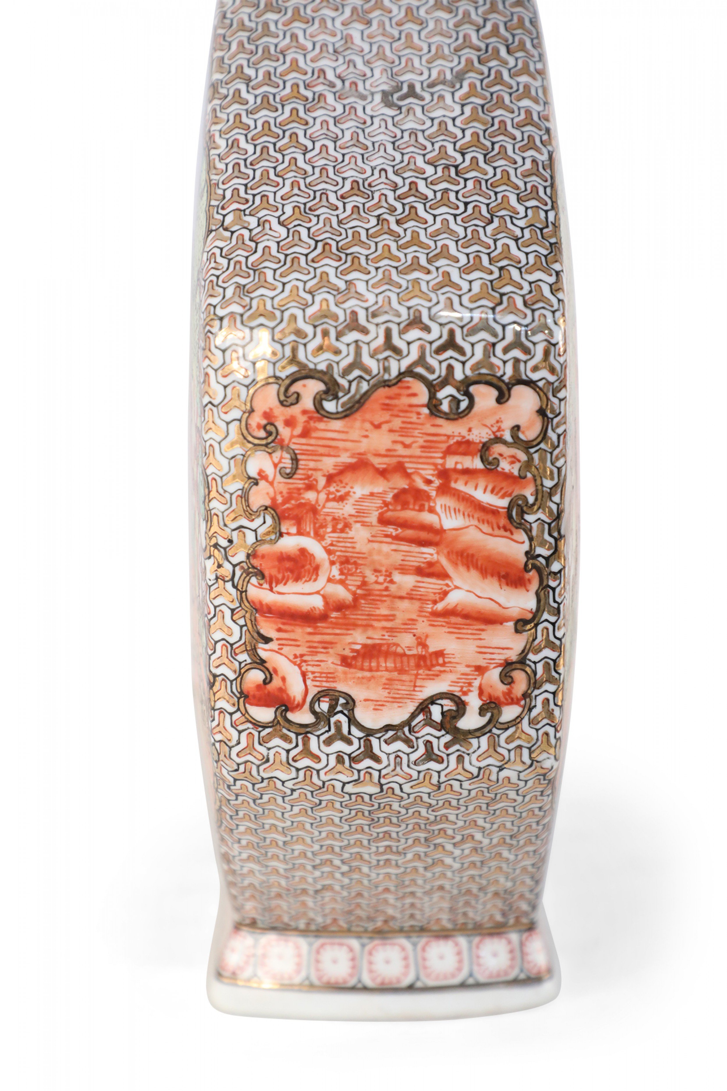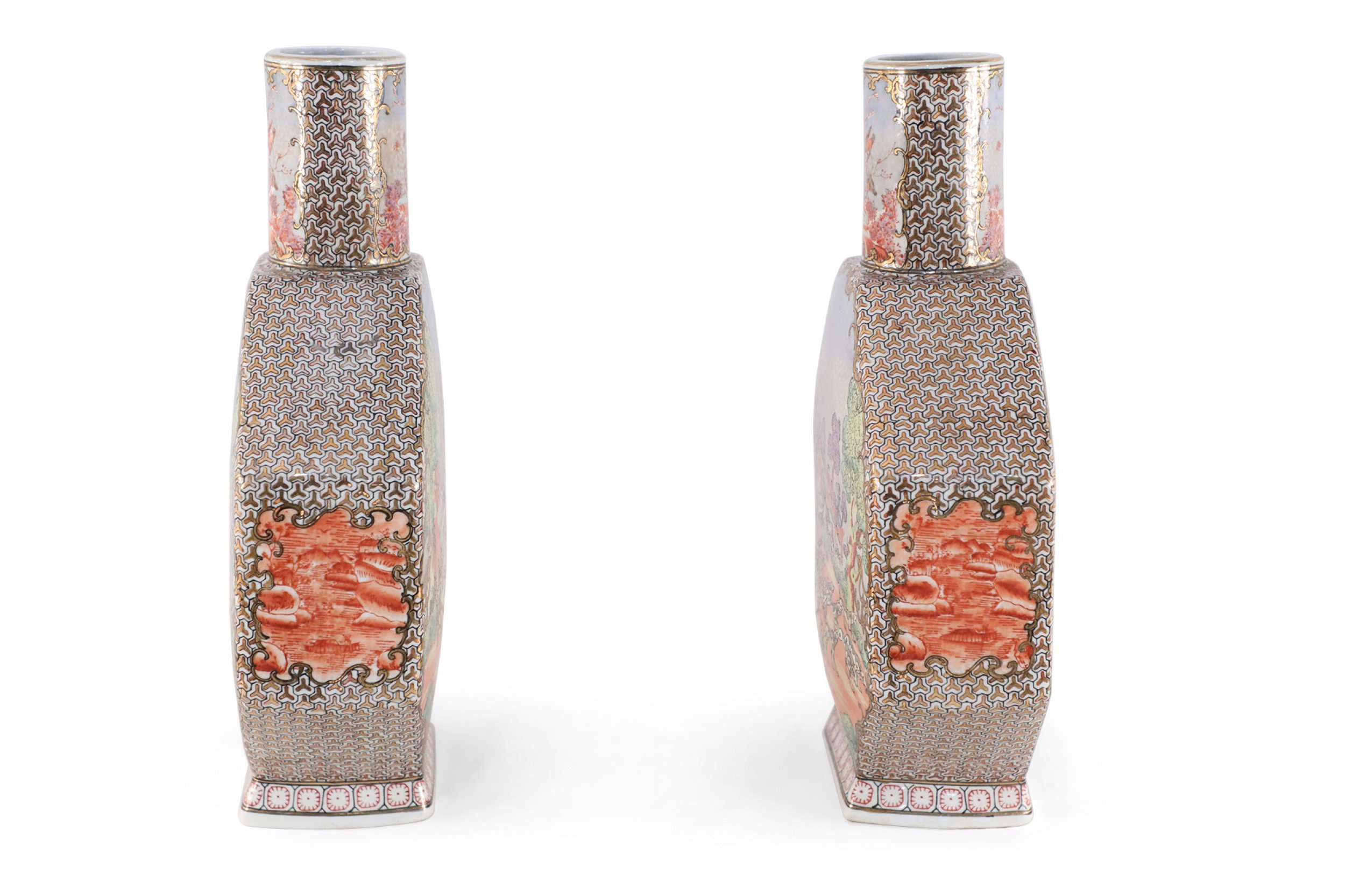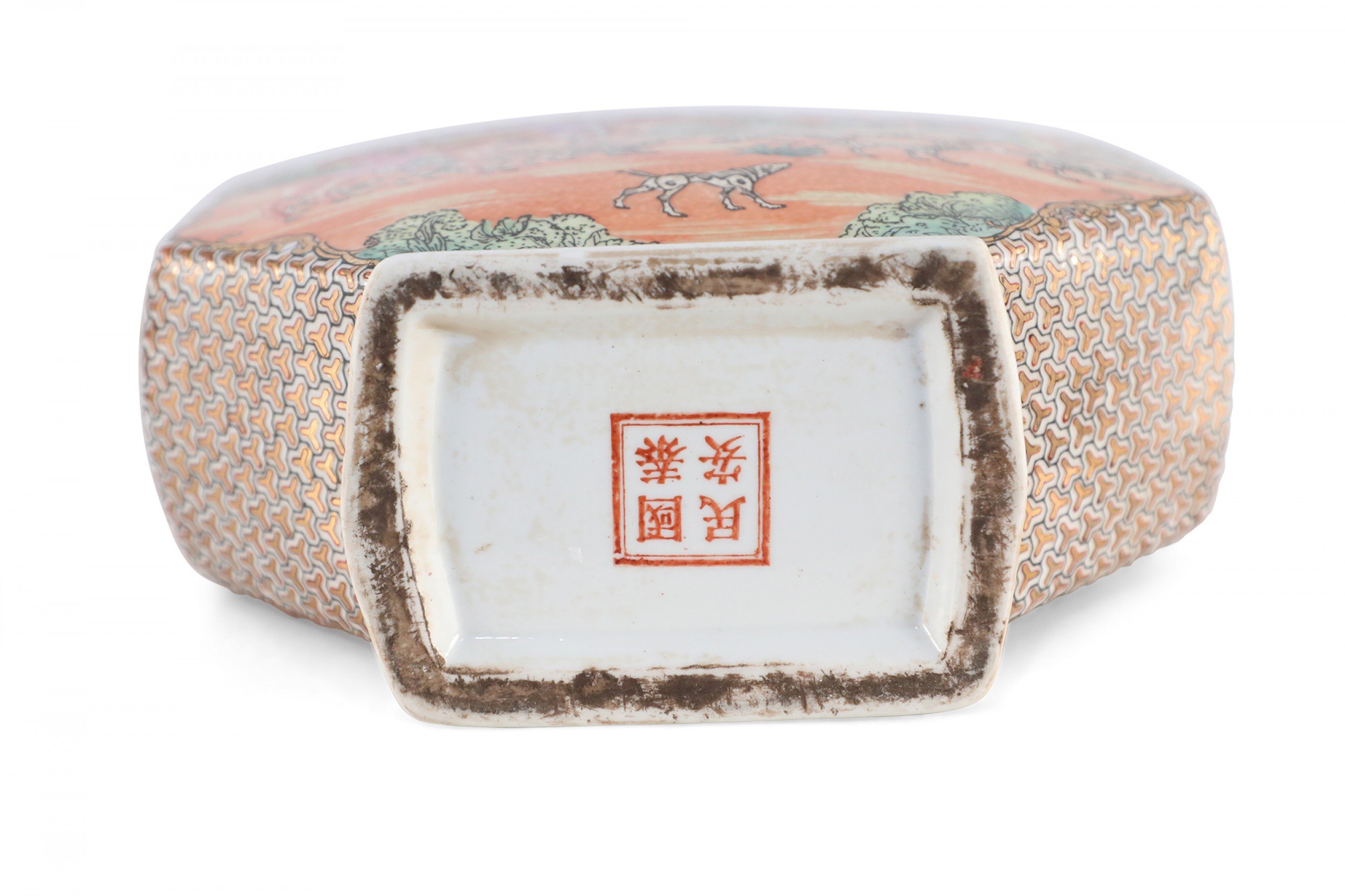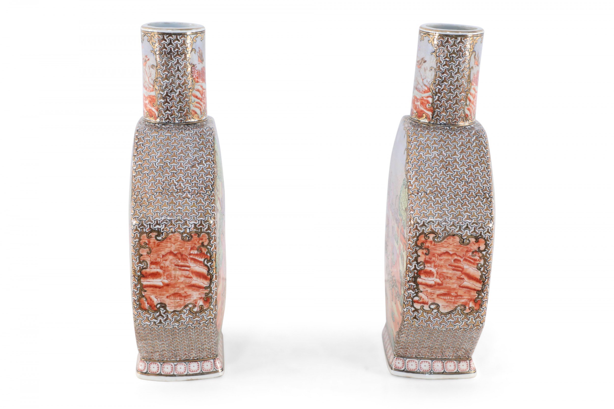 PAIR of Antique Chinese (Early 20th Century) Guangzhou painted export porcelain moonflask vases depicting richly colored dog hunt scenes on the bodies and gold patterned sides surrounding salmon-colored bucolic vignettes.(PRICED AS PAIR)(Related: NWL2152).