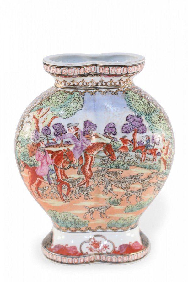 PAIR of Antique Chinese (Early 20th Century) Guangzhou painted export porcelain moonflask vases depicting richly colored dog hunt scenes on the bodies and gold patterned sides surrounding salmon-colored bucolic vignettes.(PRICED AS PAIR)(Related: NWL2152)