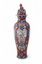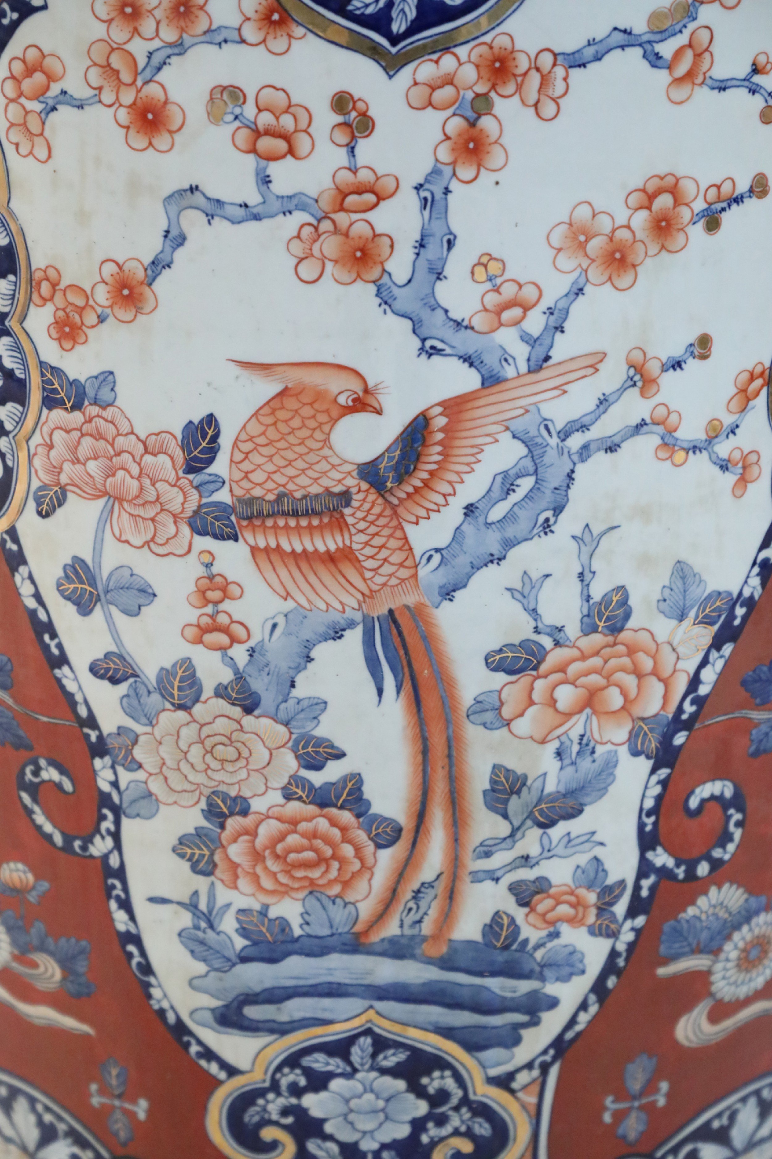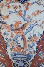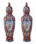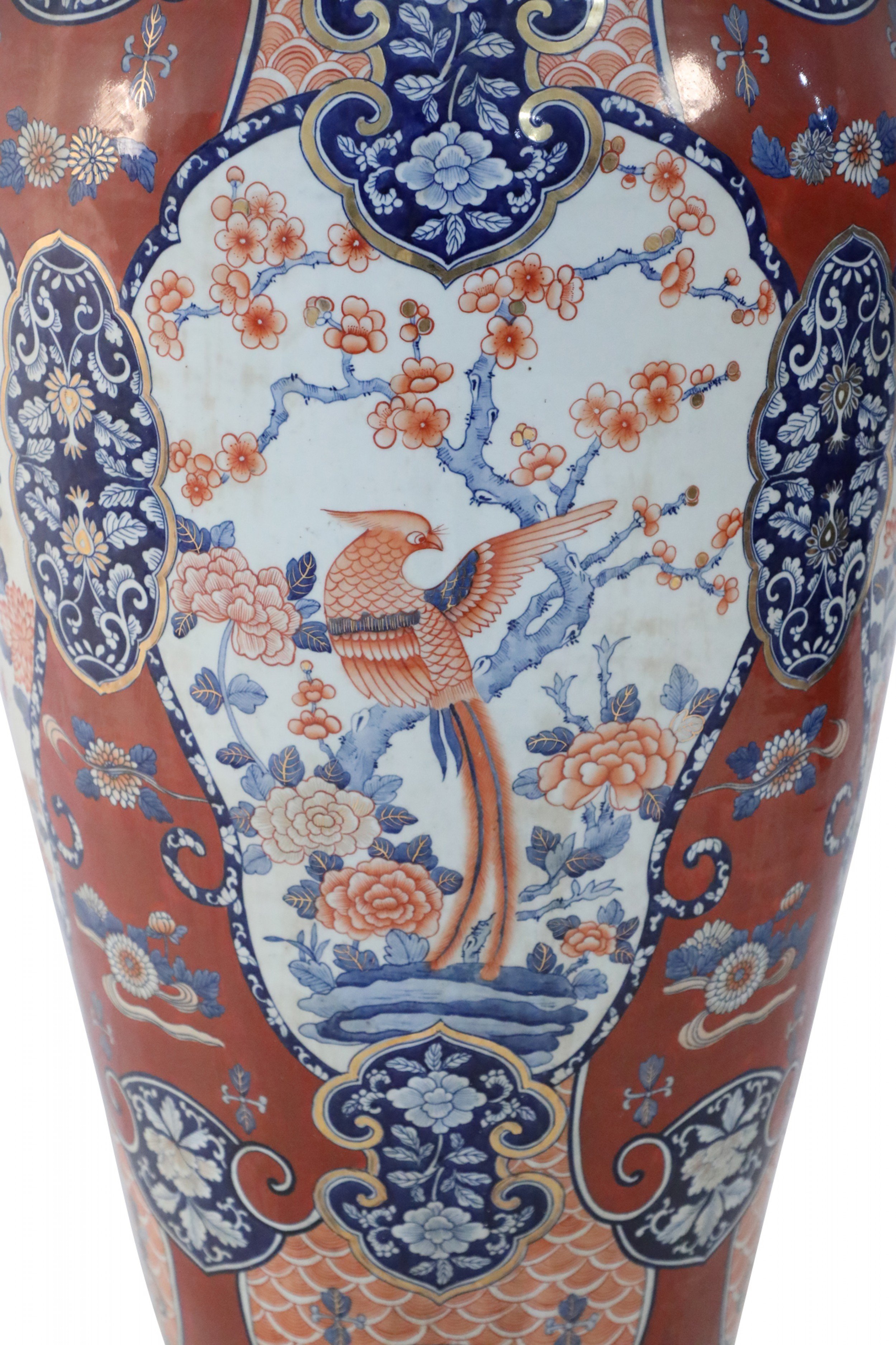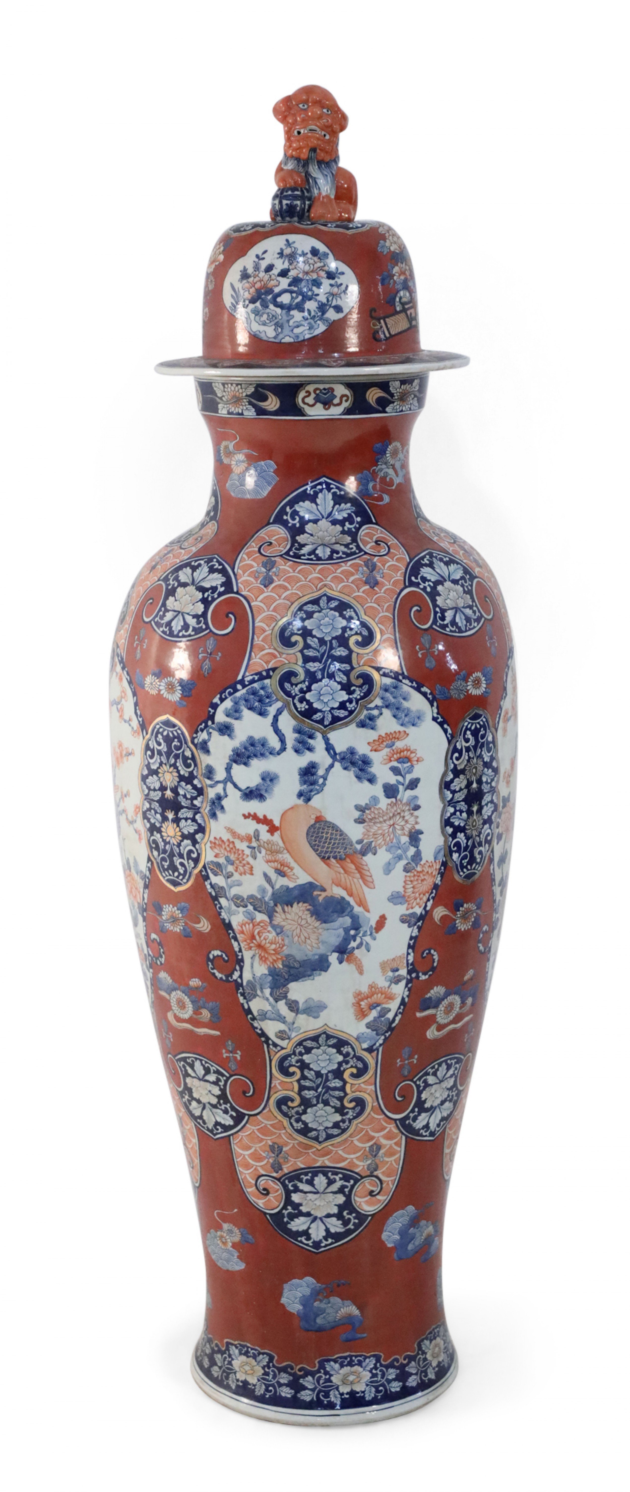 PAIR of Chinese monumental lidded porcelain floor vases celebrating Japanese Imari ware in both palette and decoration, featuring central medallions of birds perched on flowering trees, surrounded by floral designs on rust-colored grounds. Each lid is topped with a foo dog finial (PRICED AS PAIR).