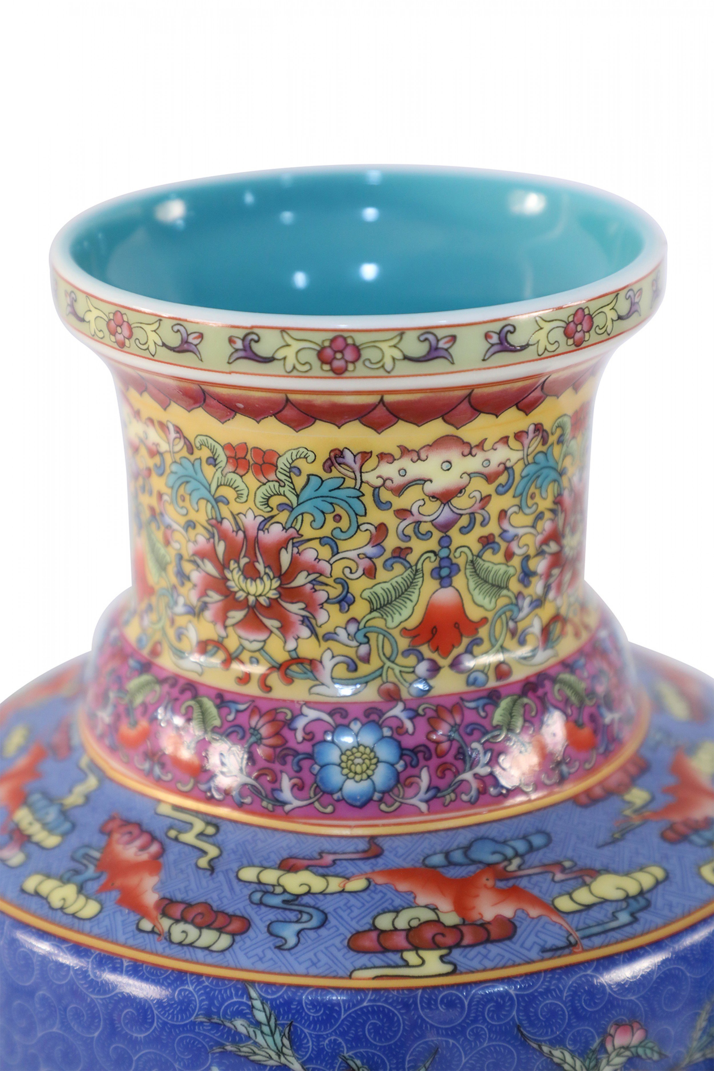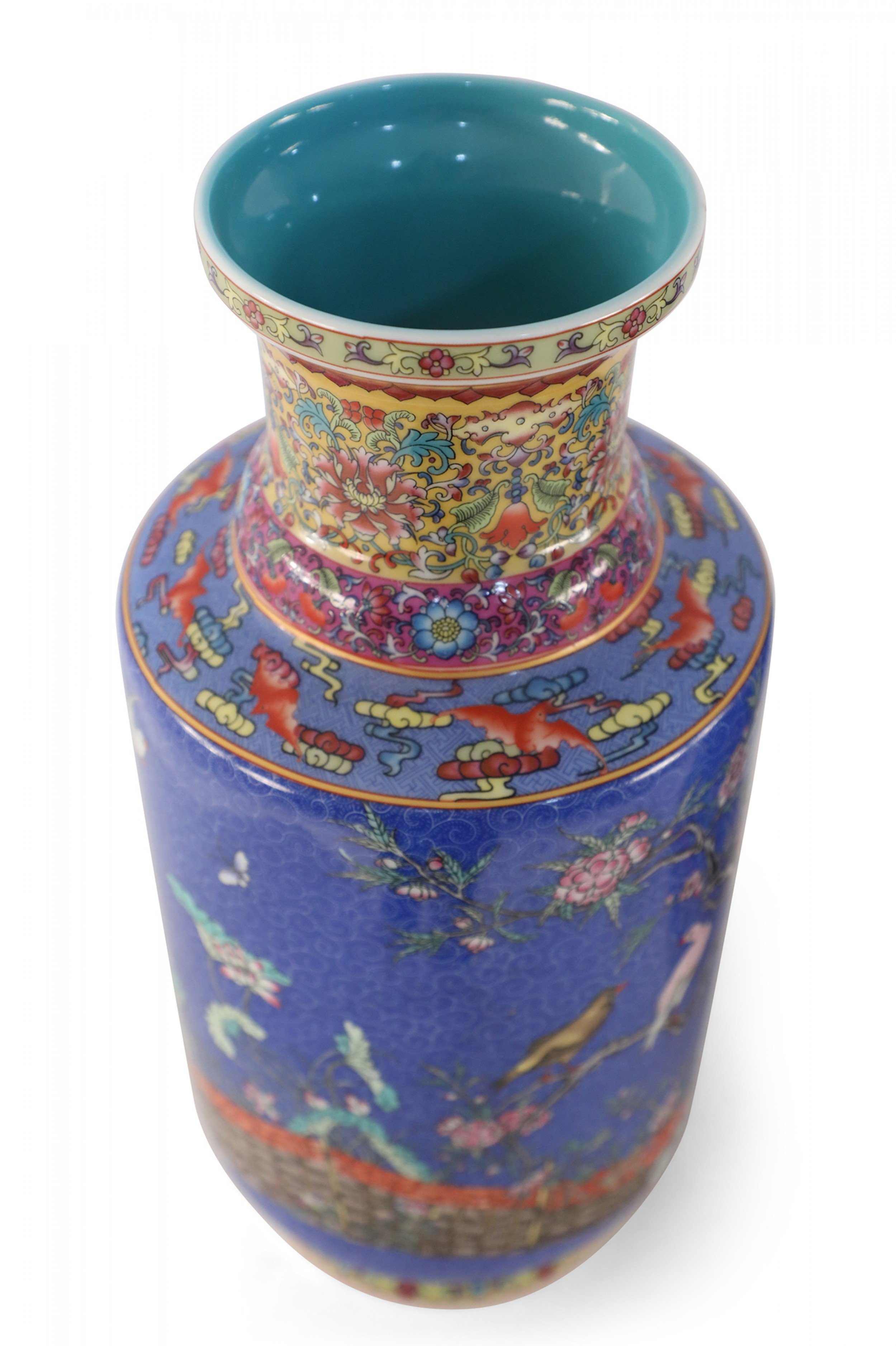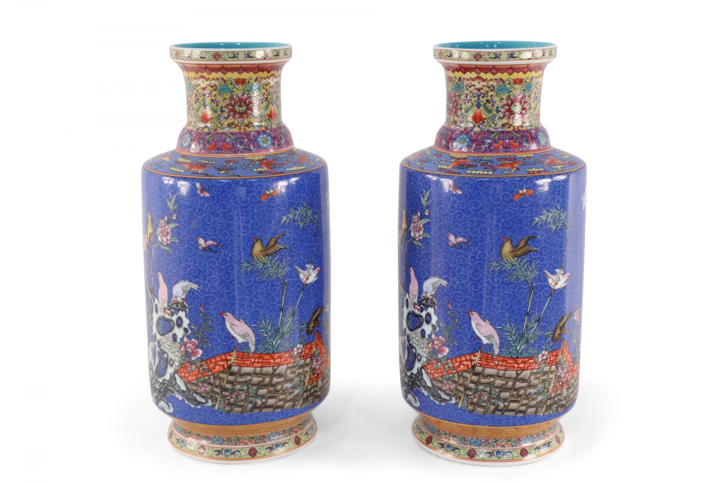 PAIR of Chinese Qing Dynasty Qianlong Period-style (Mid-20th Century) blue porcelain mallet bottles with famille floral patterns and birds consisting of nine, painted layers in homage to the positive symbolism of the number 9 in Chinese culture. (PRICED AS PAIR)