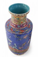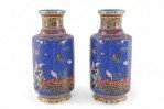 PAIR of Chinese Qing Dynasty Qianlong Period-style (Mid-20th Century) blue porcelain mallet bottles with famille floral patterns and birds consisting of nine, painted layers in homage to the positive symbolism of the number 9 in Chinese culture. (PRICED AS PAIR).