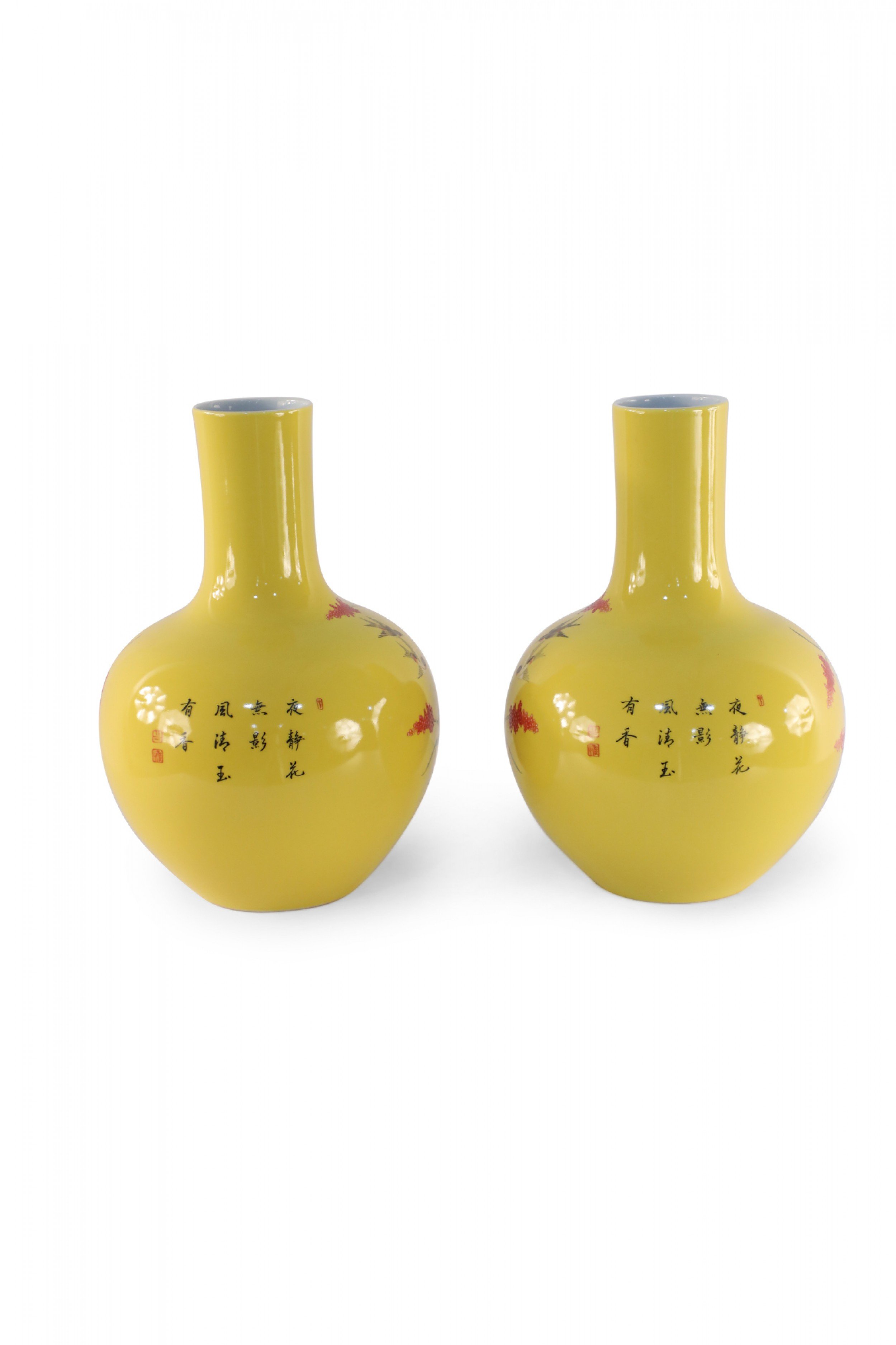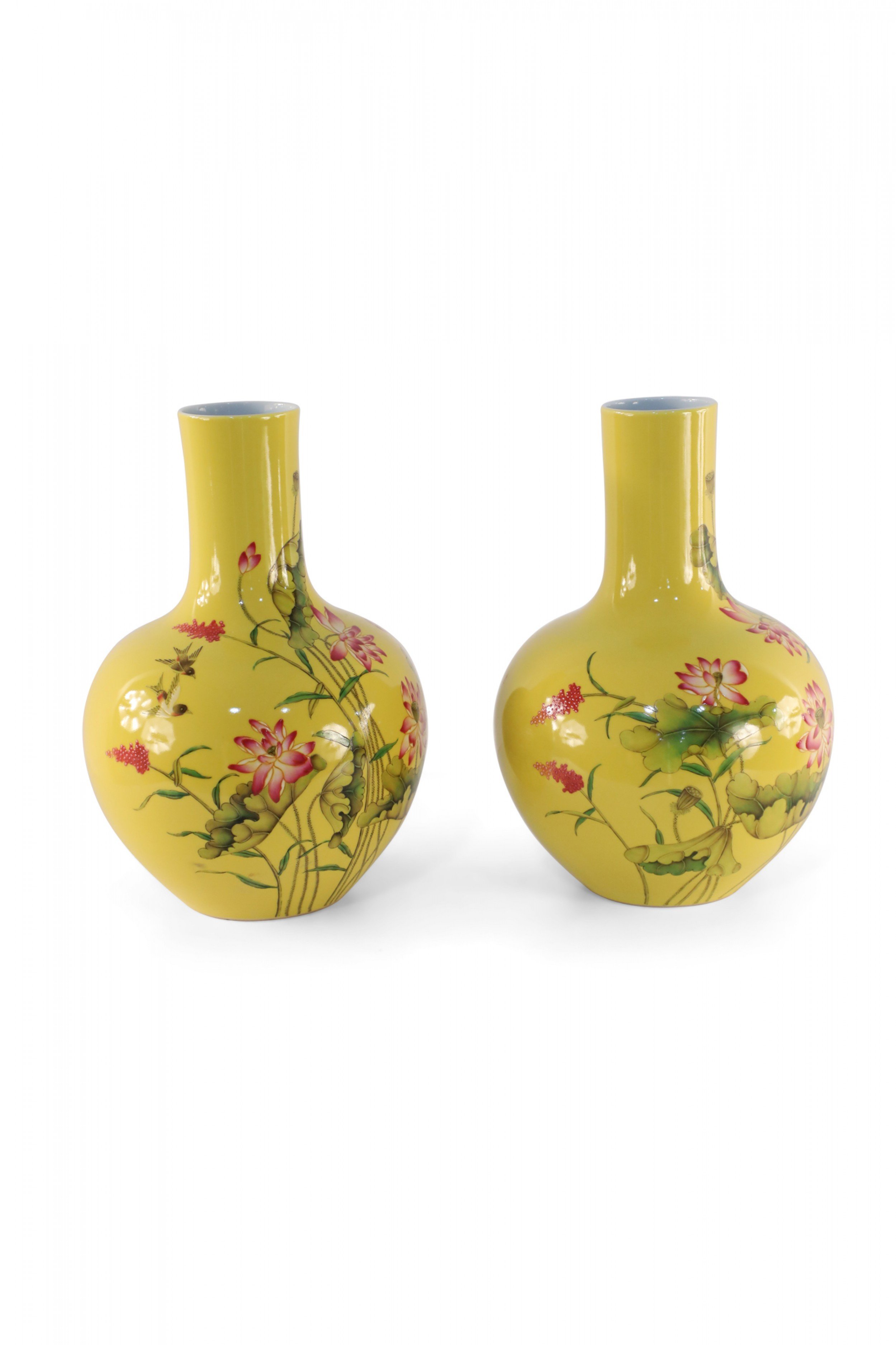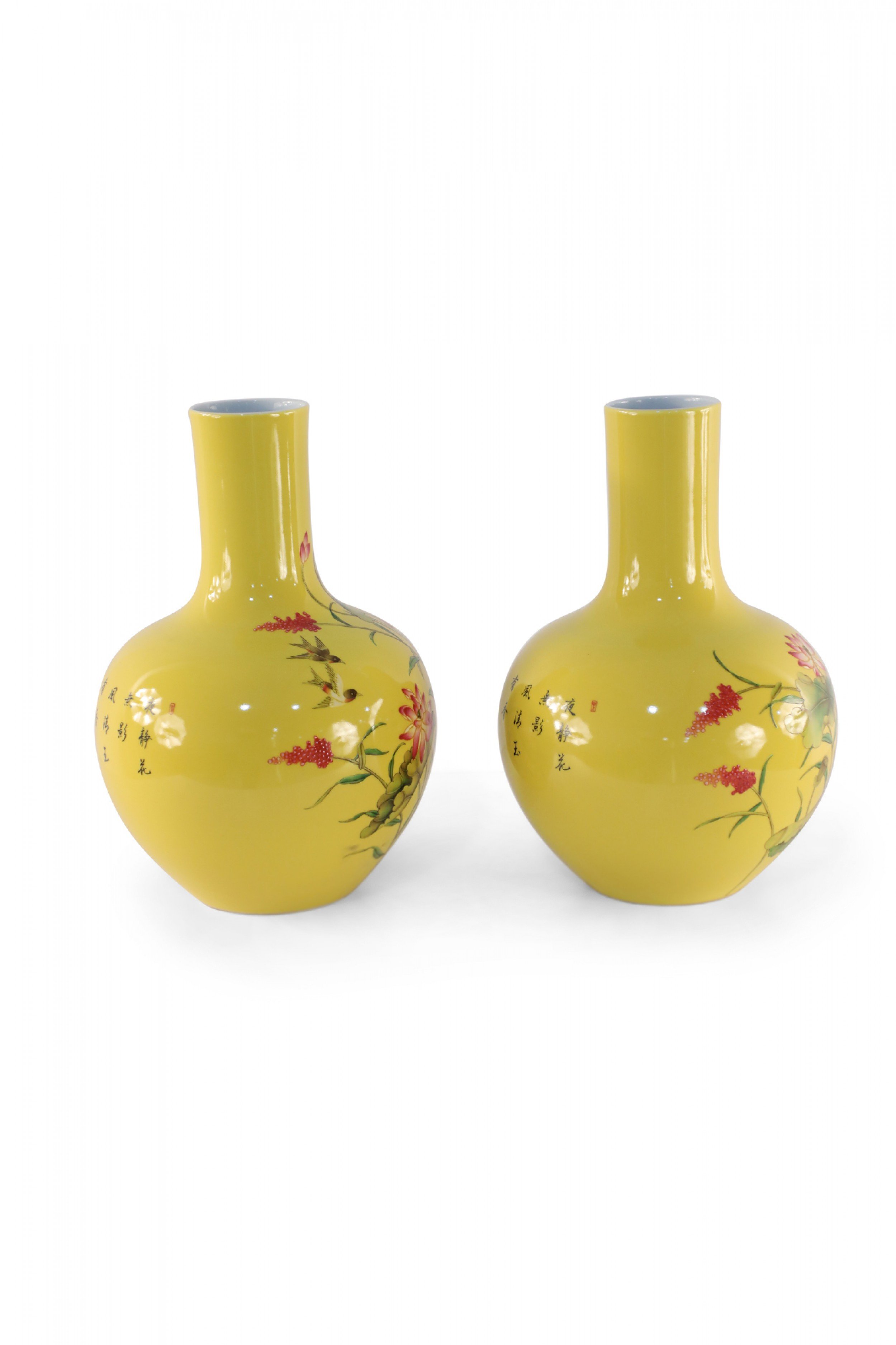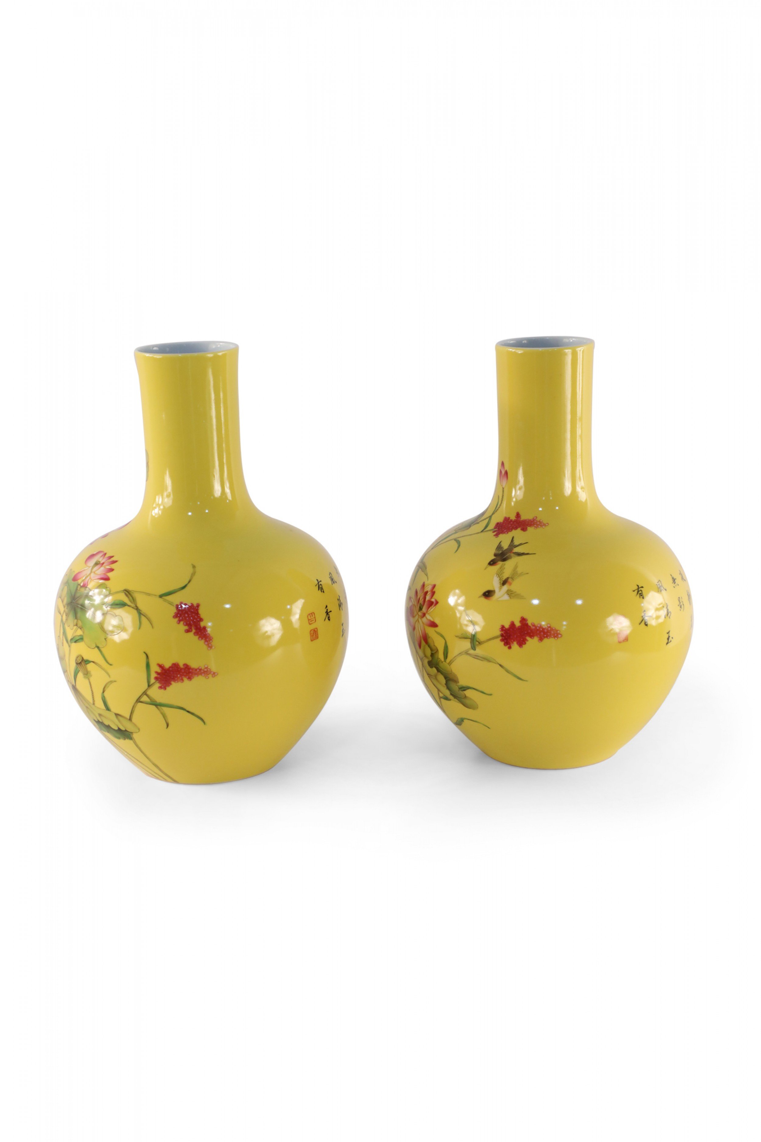 PAIR of Chinese Qing Dynasty Qianlong Period-style (early 20th Century) famille rose yellow globular porcelain vases with flying birds and green and pink floral designs that climb up the necks, with characters on the reverse sides. (mark on bottom) (PRICED AS PAIR)