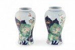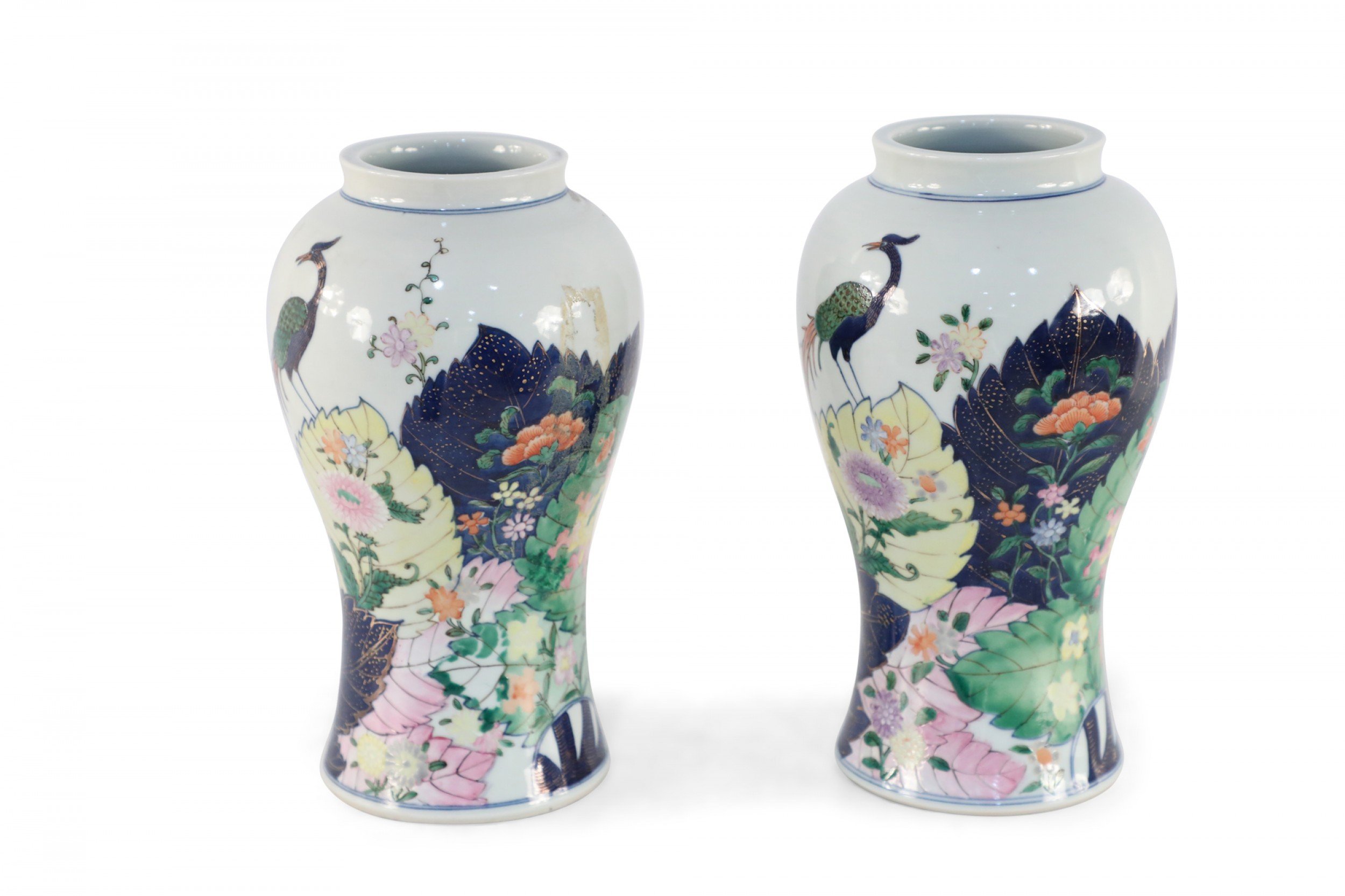 PAIR of Chinese white porcelain vases with urn-shaped forms decorated in large scale dark blue leaves outlined in gold, amid green, yellow and pink foliage and flora topped with blue peacocks (PRICED AS PAIR)(Similar piece: NWL2169)..