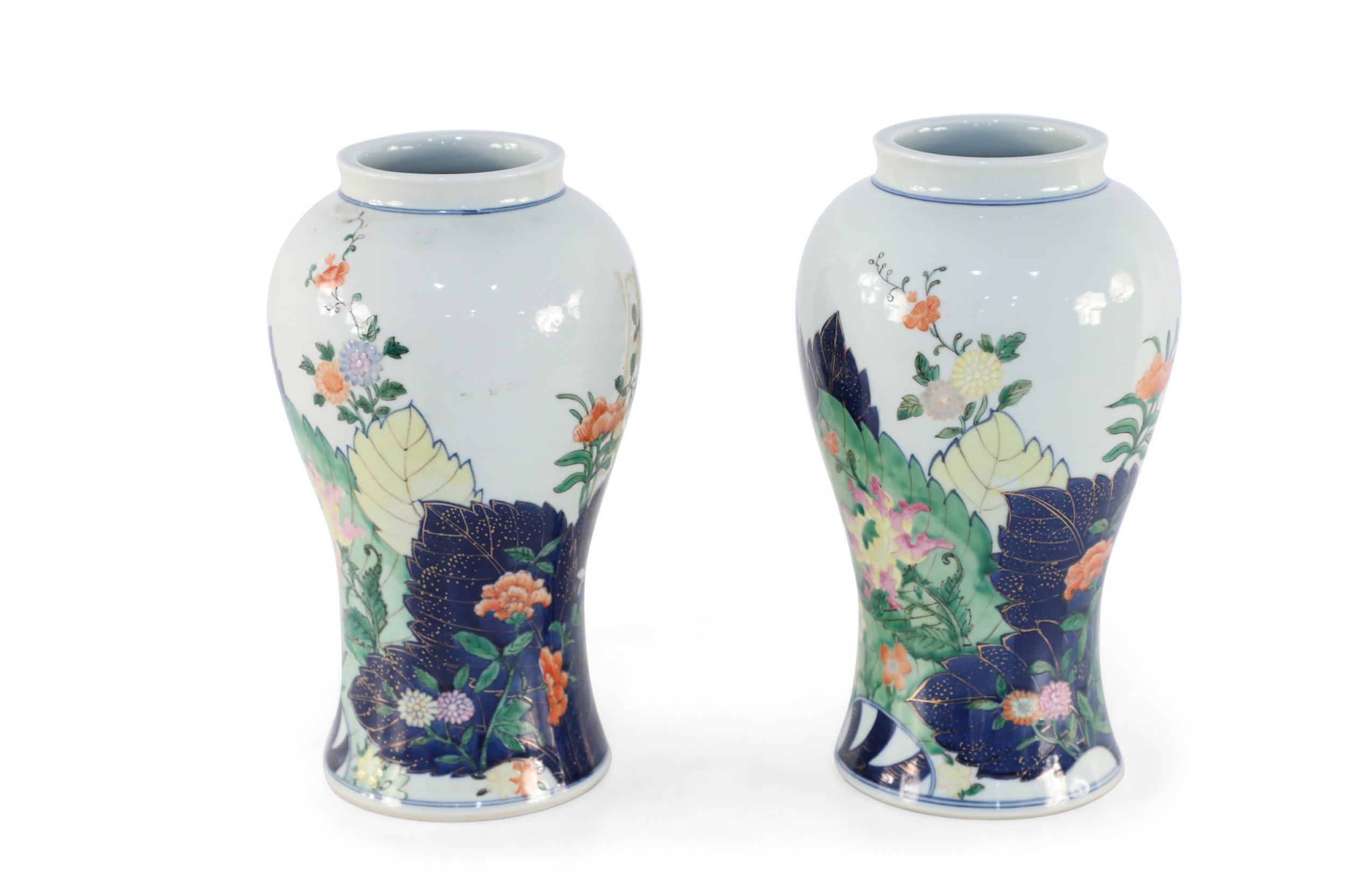 PAIR of Chinese white porcelain vases with urn-shaped forms decorated in large scale dark blue leaves outlined in gold, amid green, yellow and pink foliage and flora topped with blue peacocks (PRICED AS PAIR)(Similar piece: NWL2169).