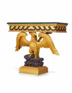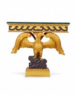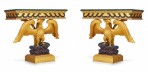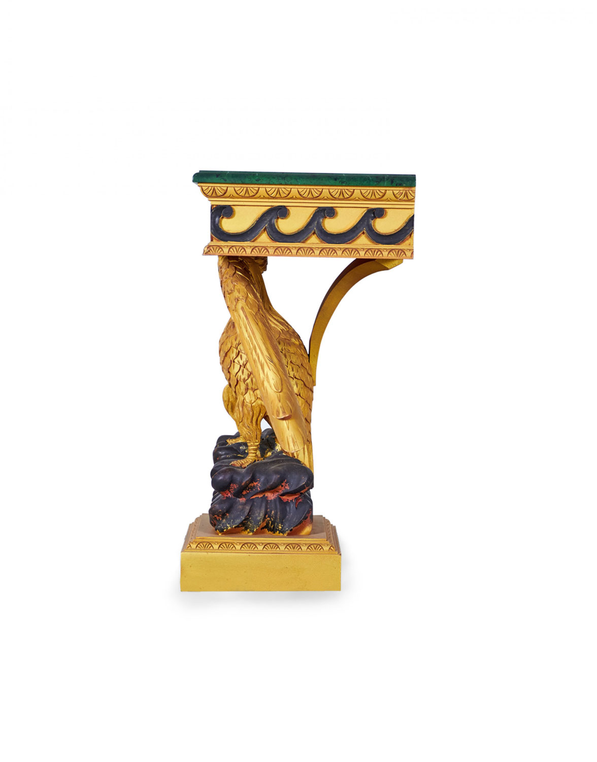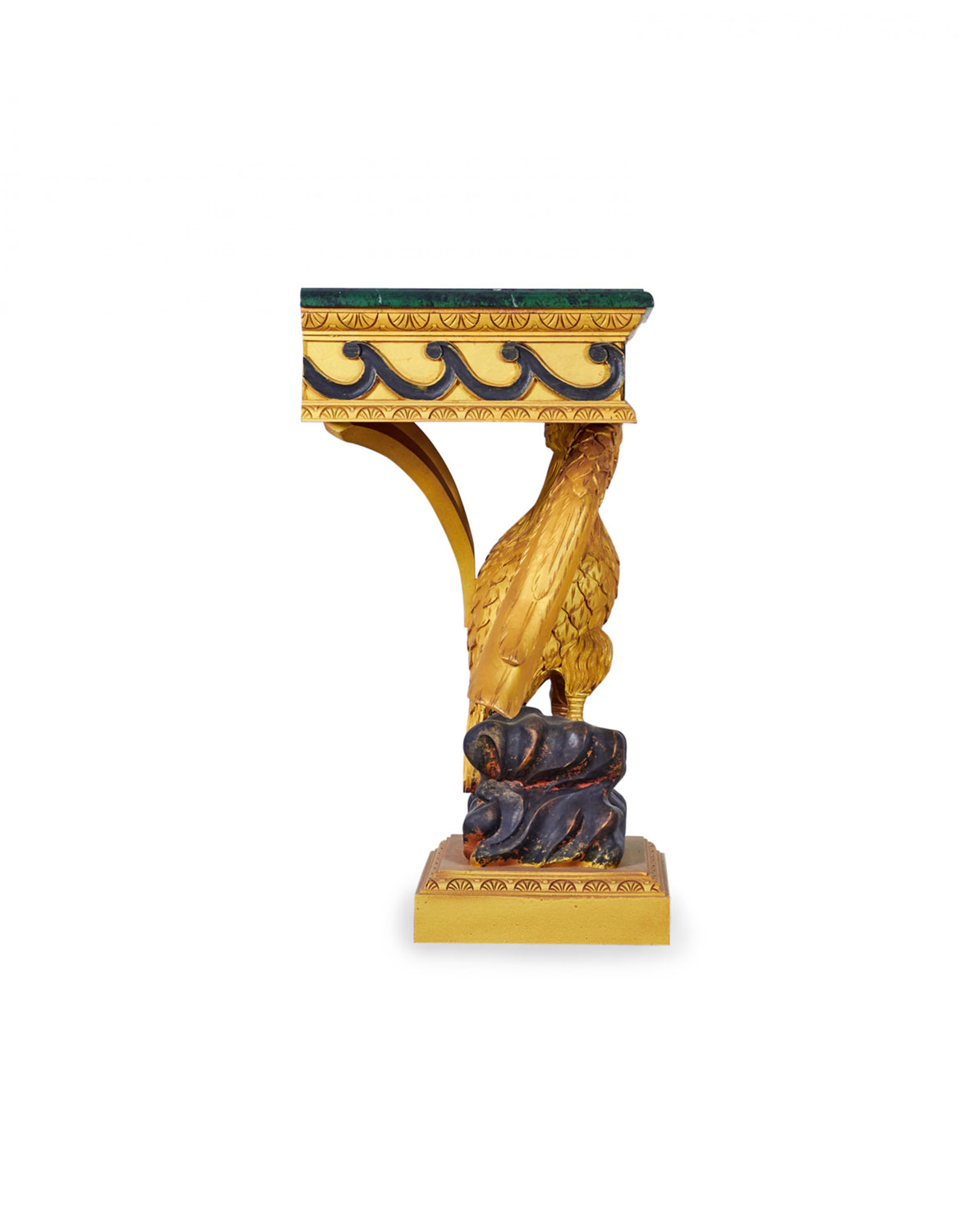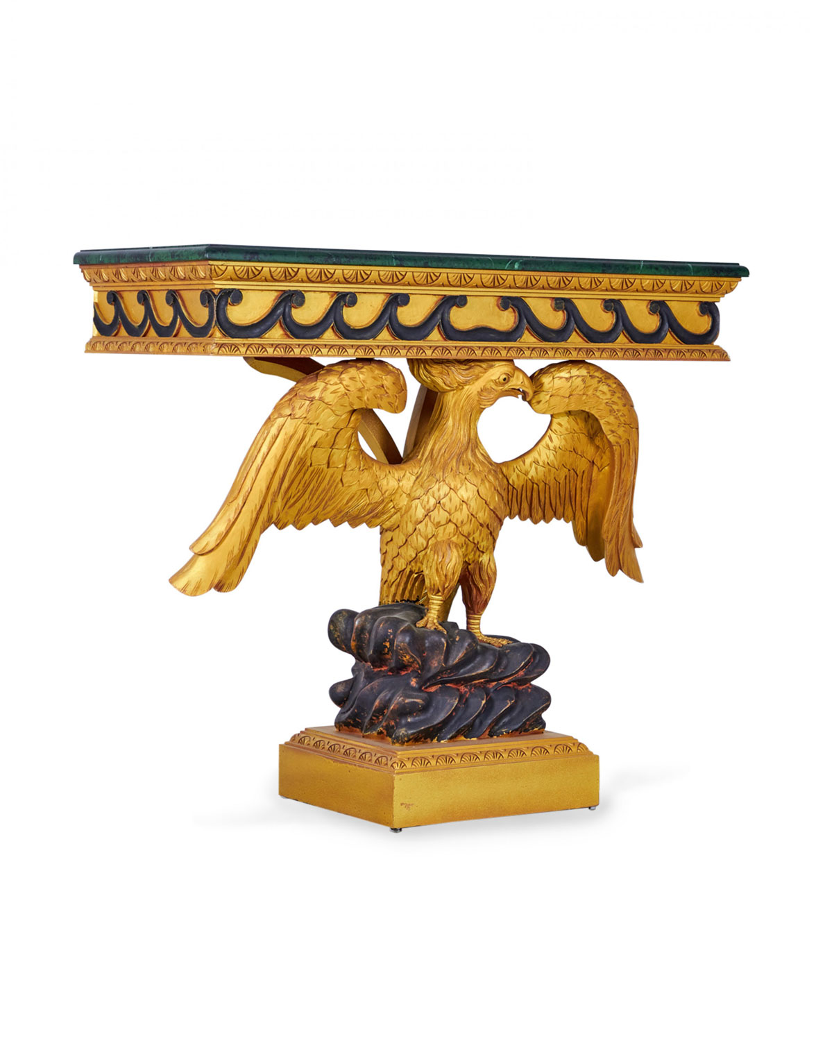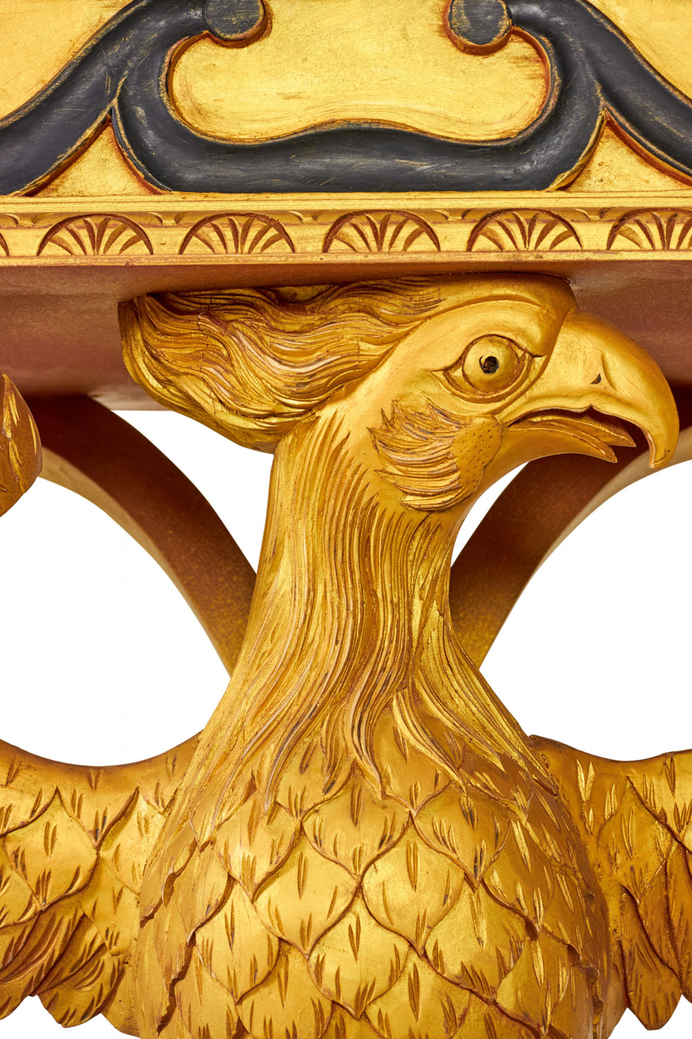 Pair of English Regency Style Gilt Eagle Base and Faux Marble Console Tables