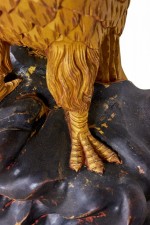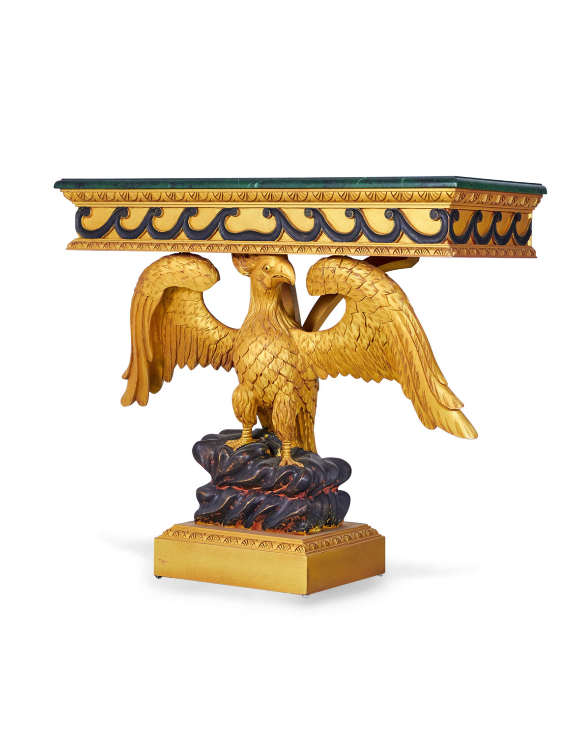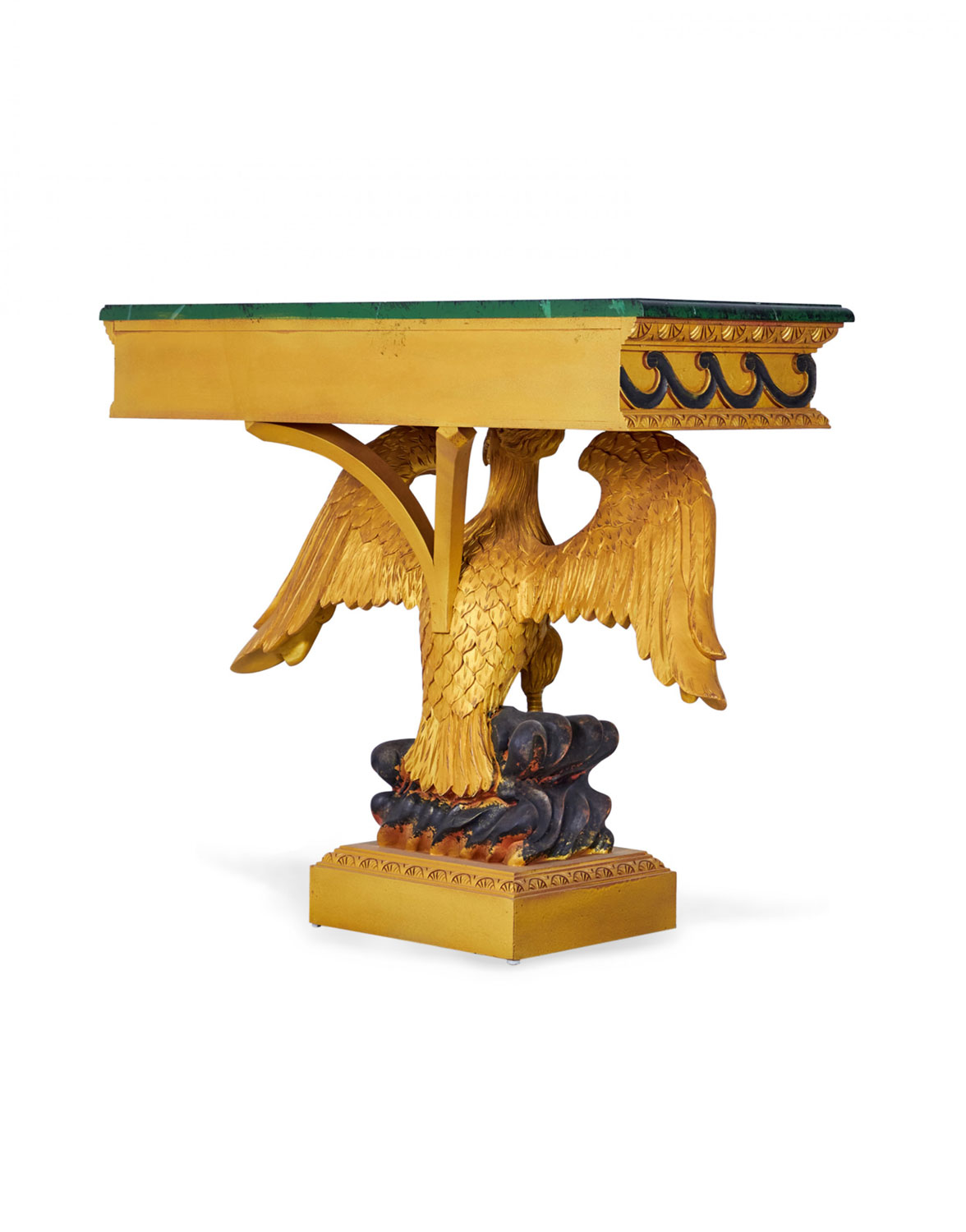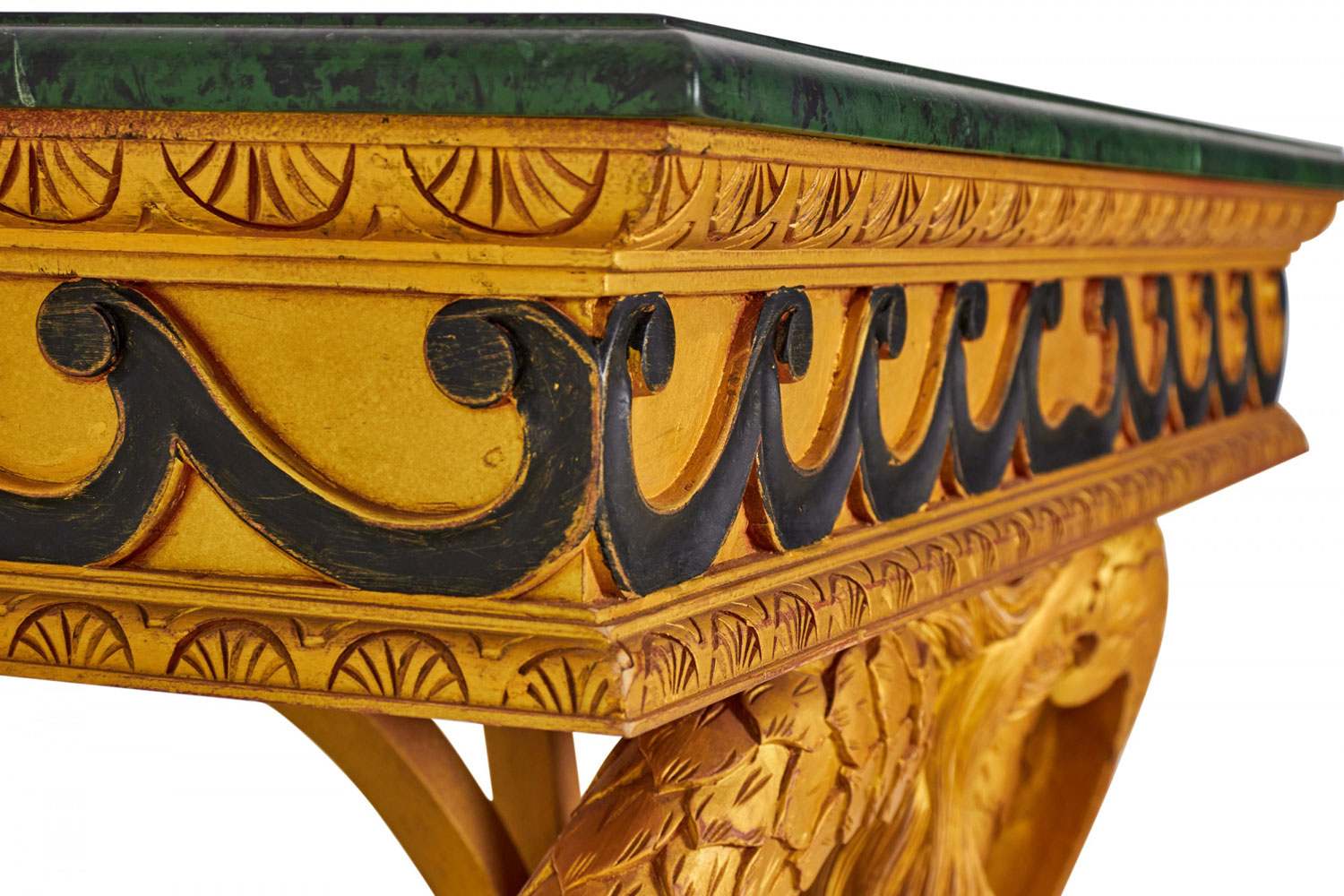 PAIR of English Regency-style console tables with painted faux green marble wooden tops resting on carved wooden gilt eagle bases. (PRICED AS PAIR)