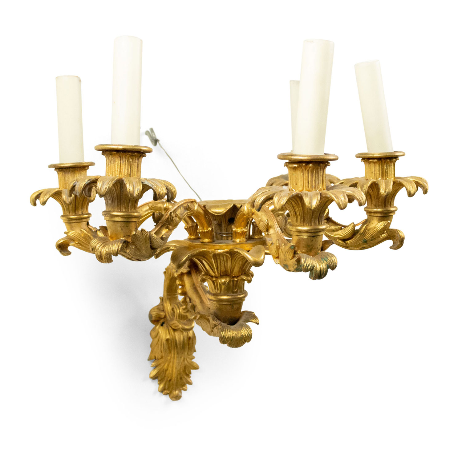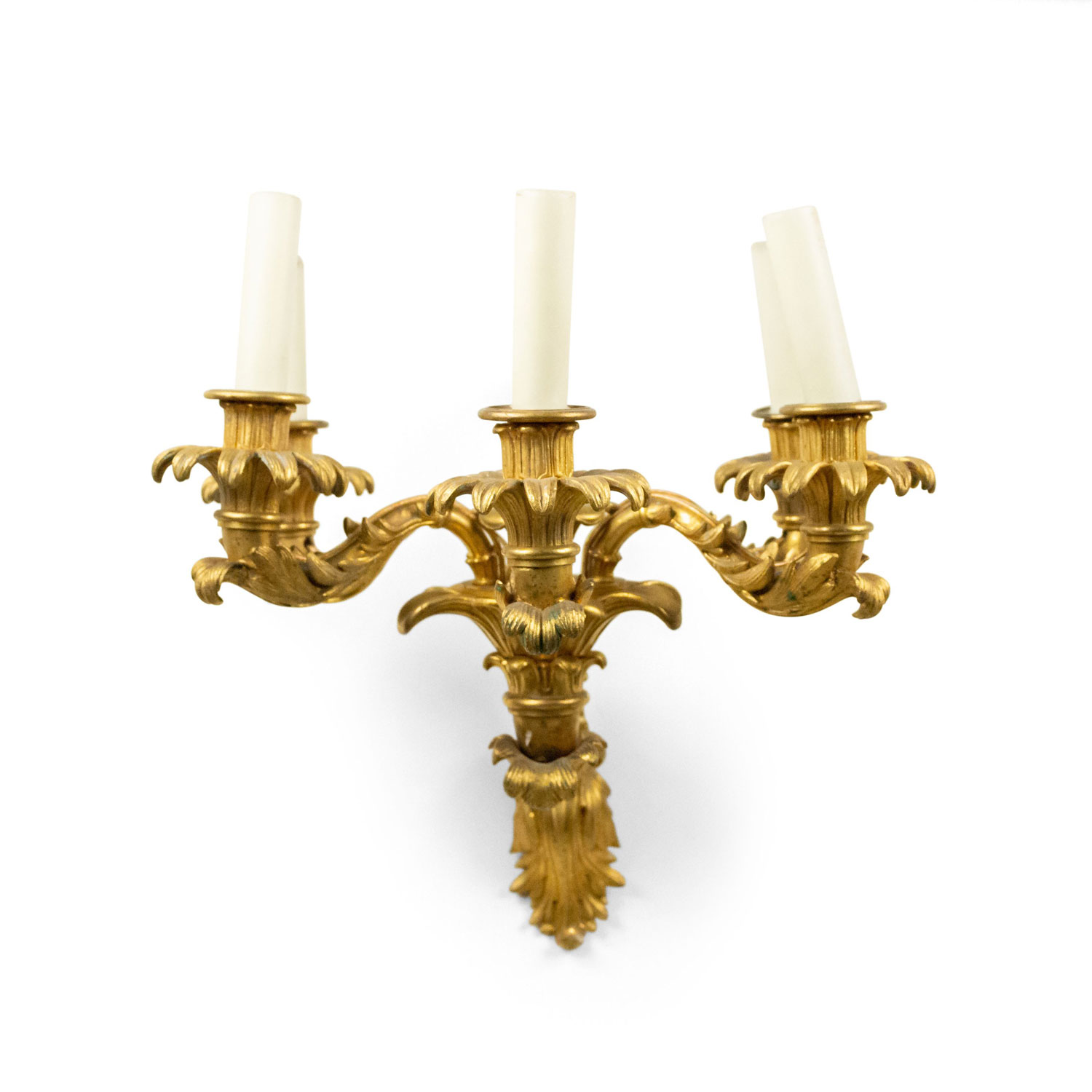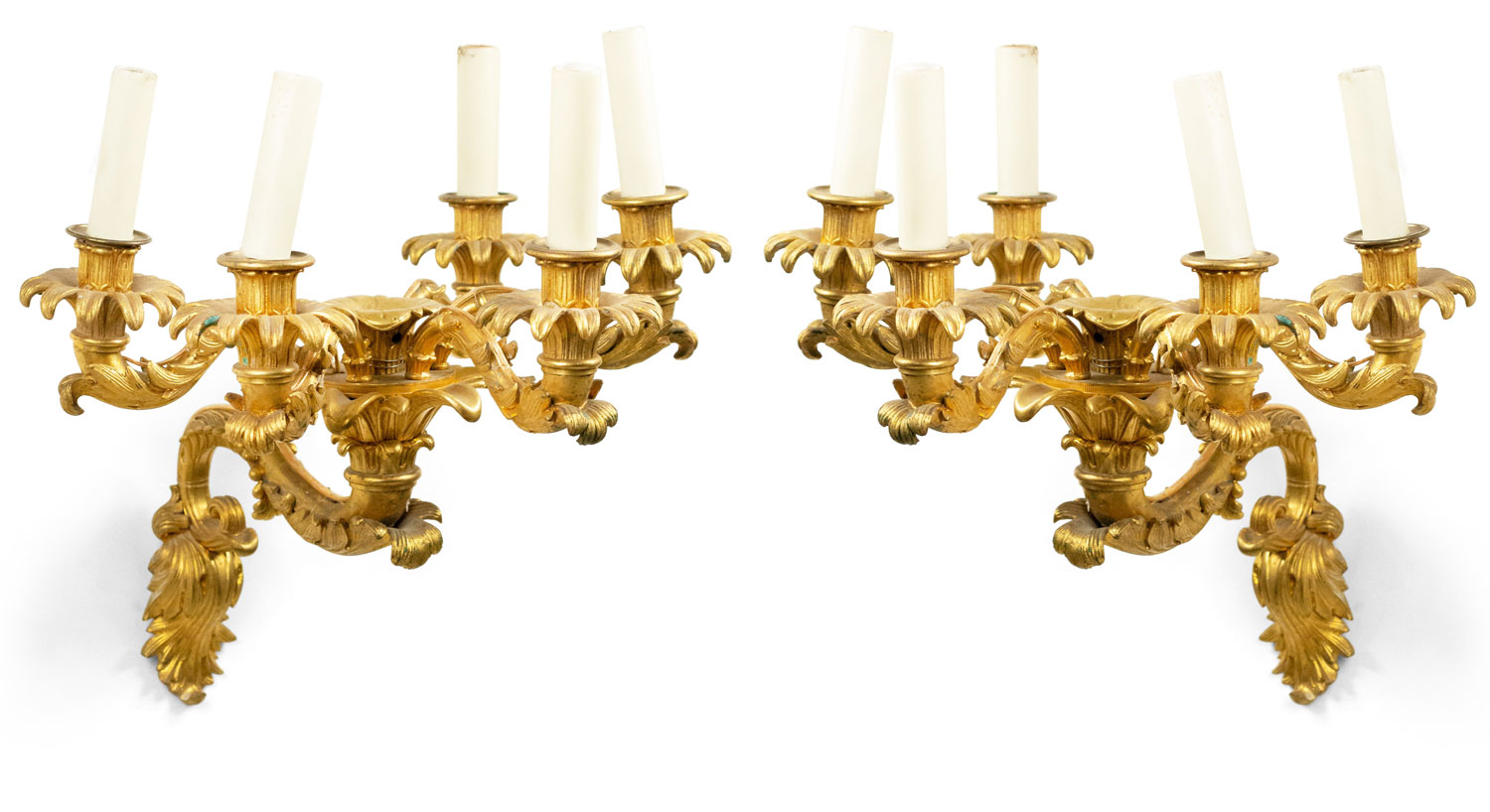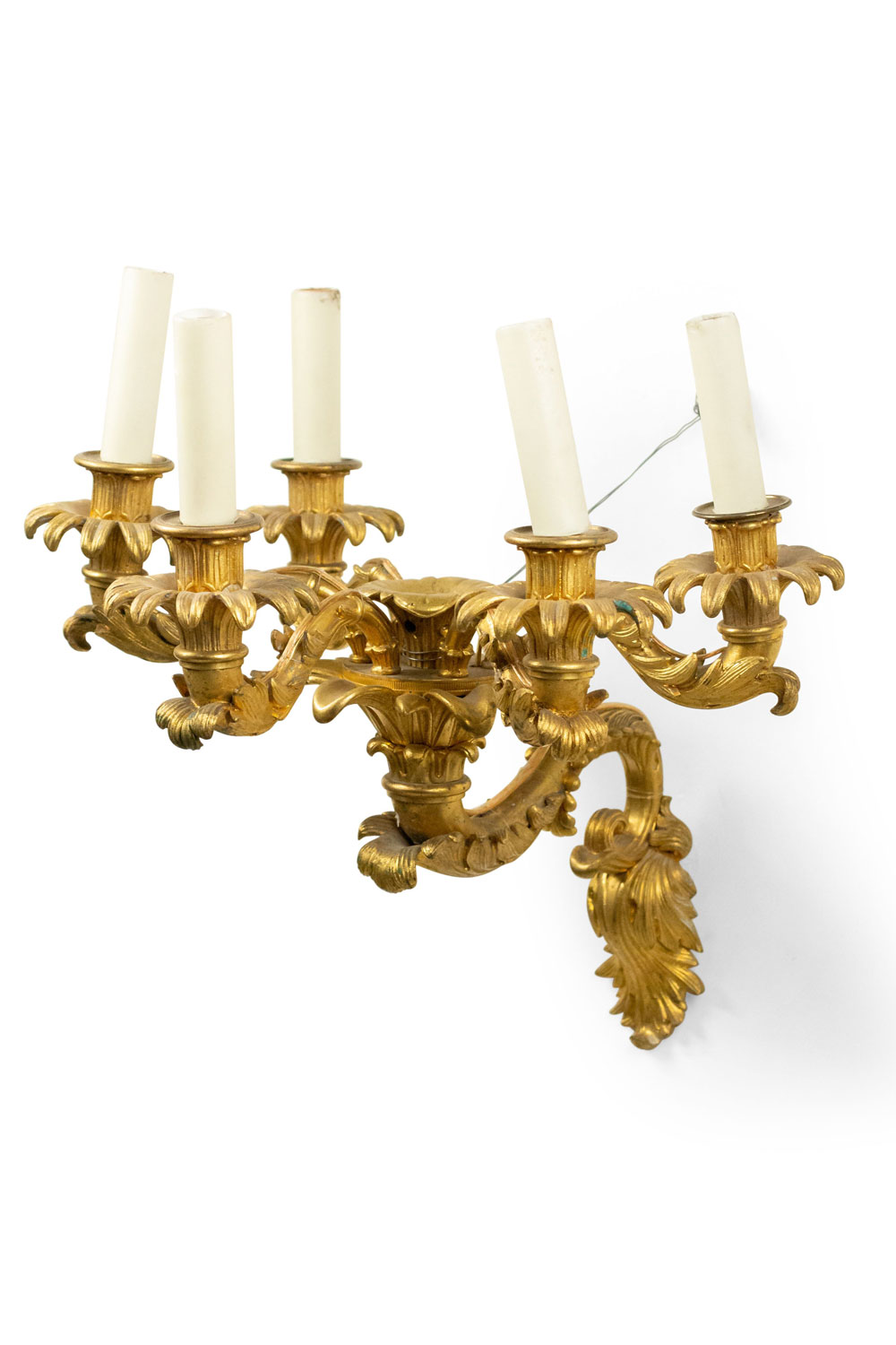 PAIR of French Charles X (circa 1835) gilt bronze wall sconces with 5 scroll arms emanating from a center light. (PRICED AS PAIR)