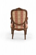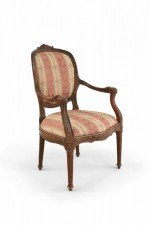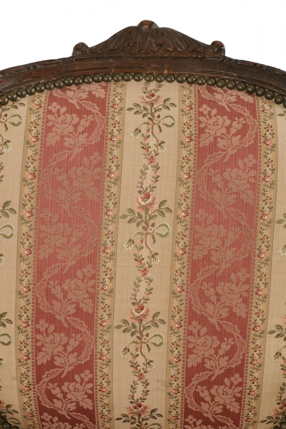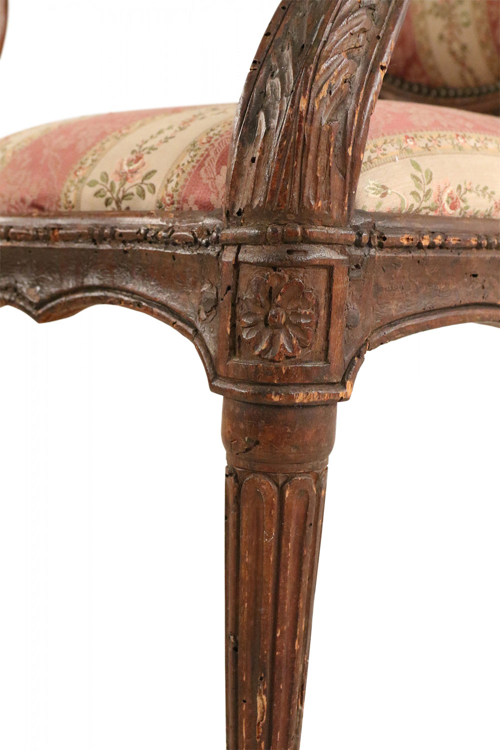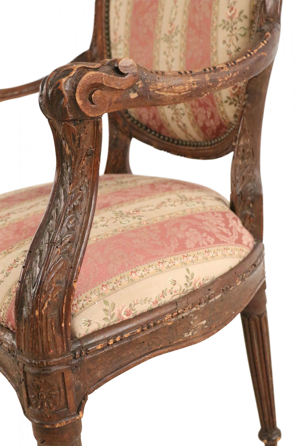 PAIR of French Louis XVI (18th Century) walnut armchairs with beige and pink stripe upholstered oval backs and seats and carved foliate details along frame supported on fluted legs. (PRICED AS PAIR)