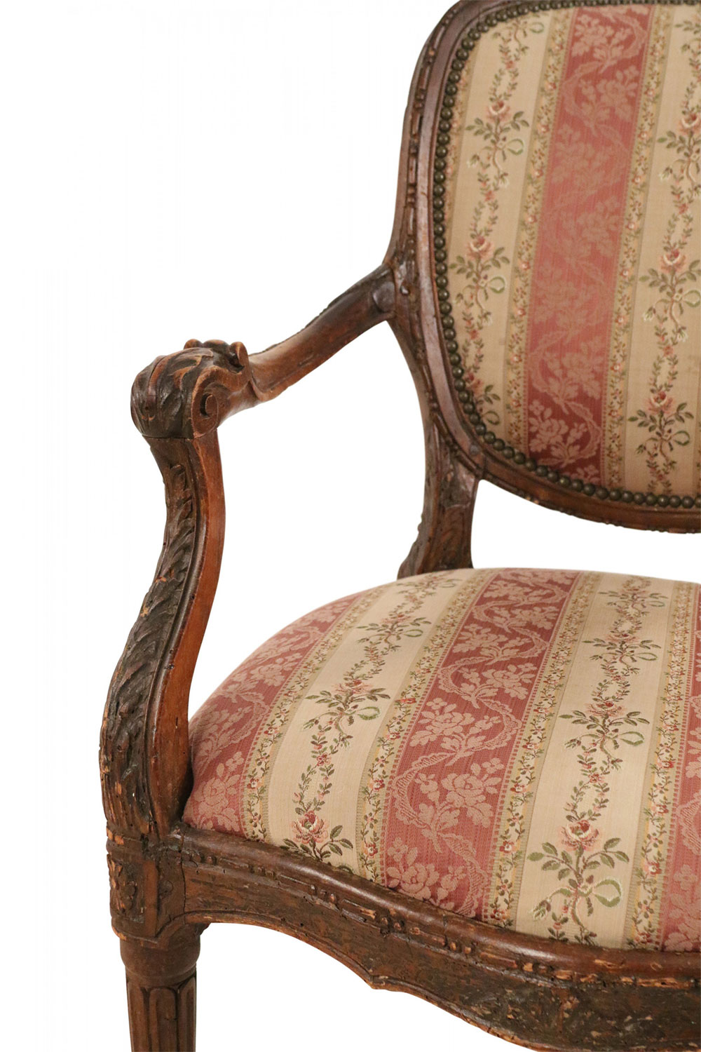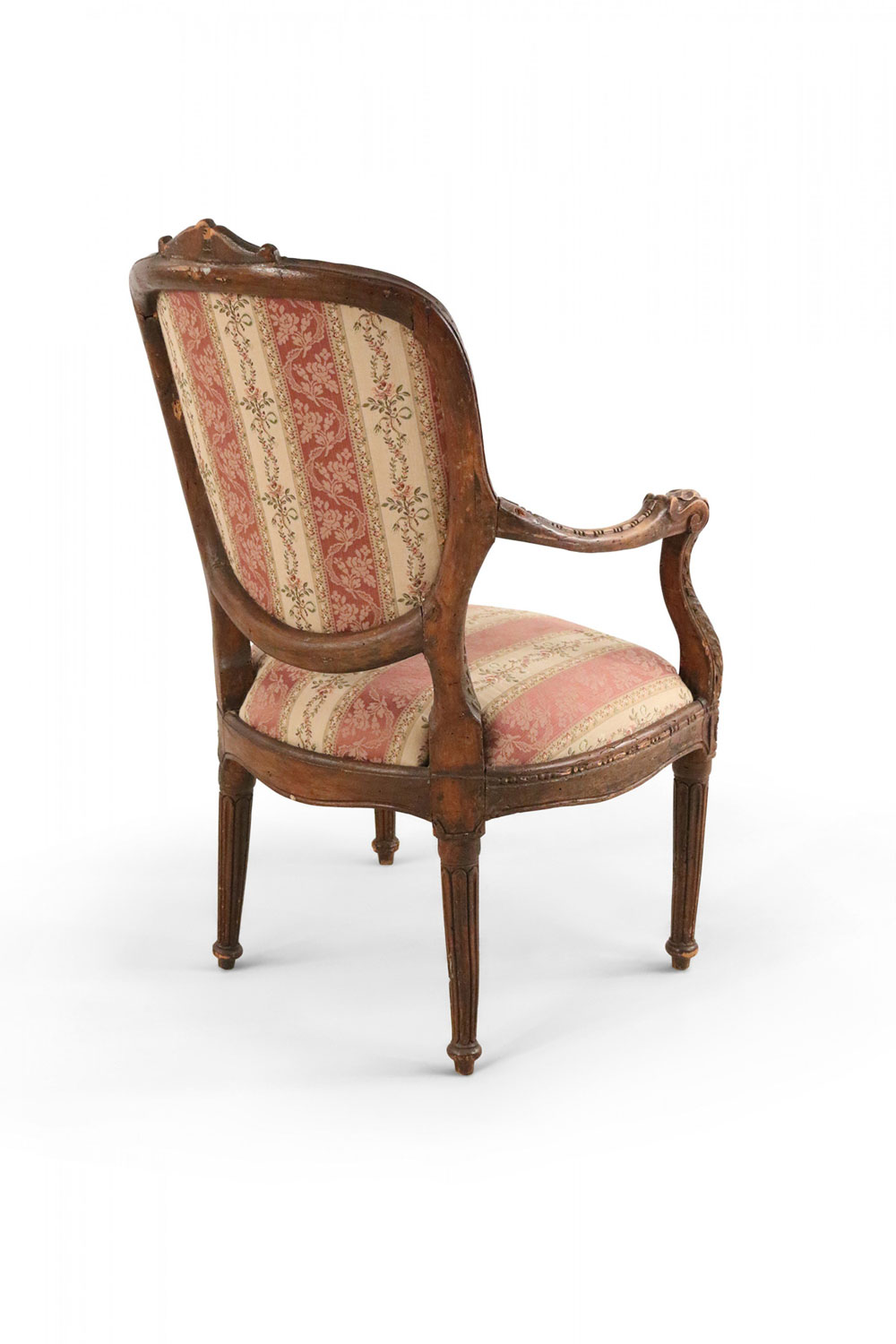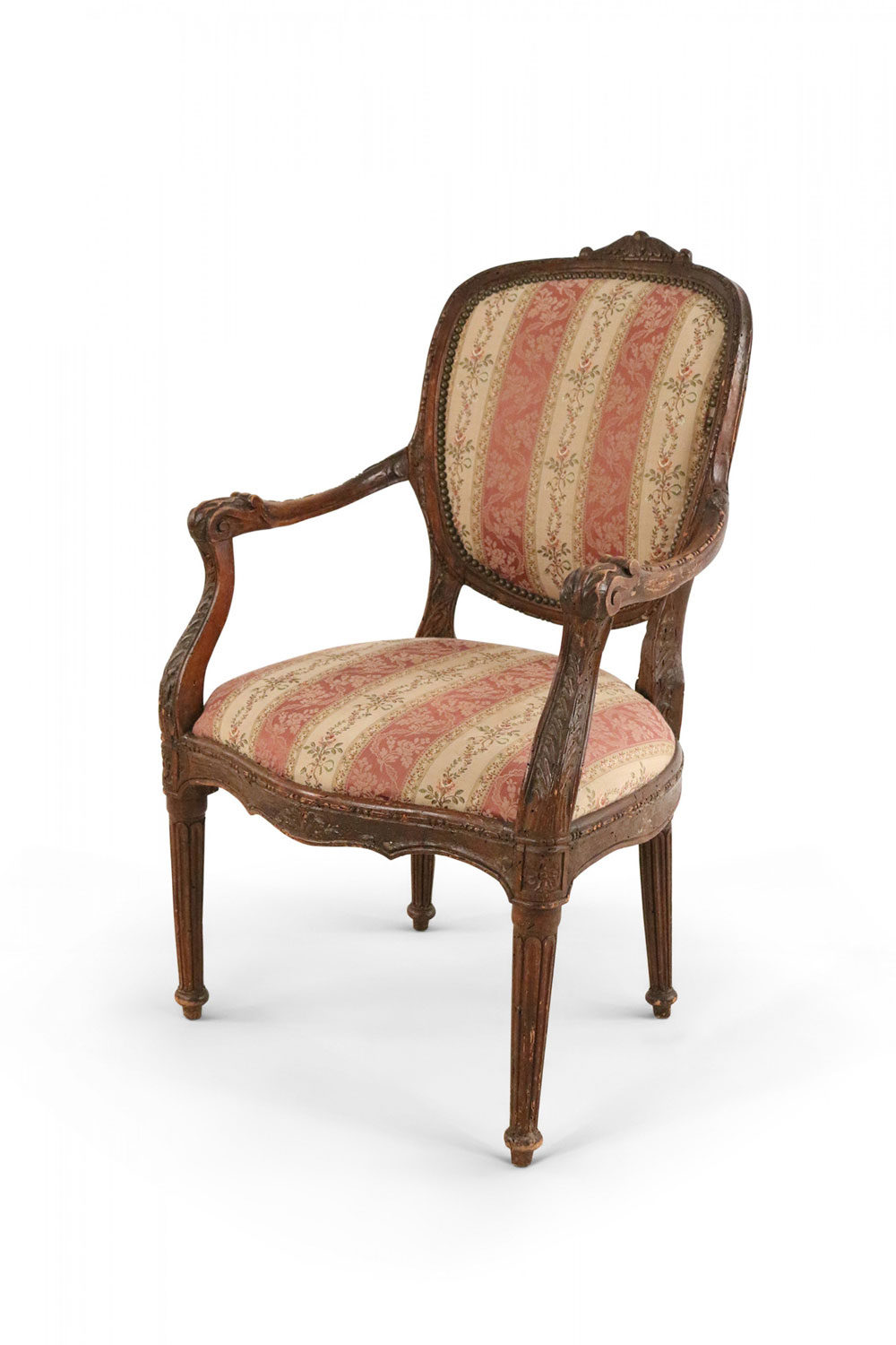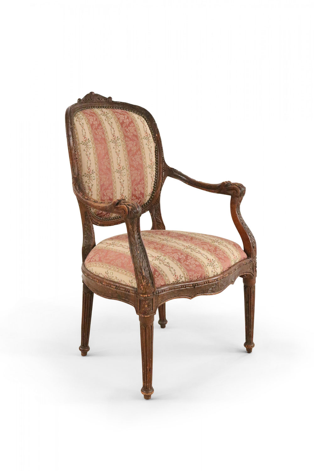 PAIR of French Louis XVI (18th Century) walnut armchairs with beige and pink stripe upholstered oval backs and seats and carved foliate details along frame supported on fluted legs. (PRICED AS PAIR).