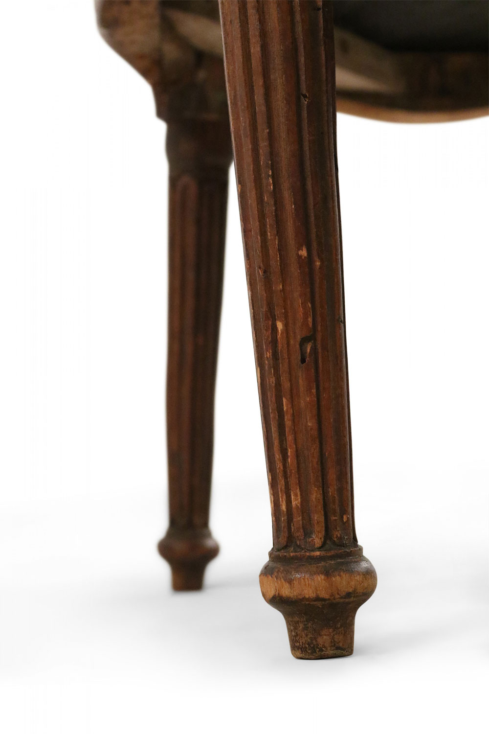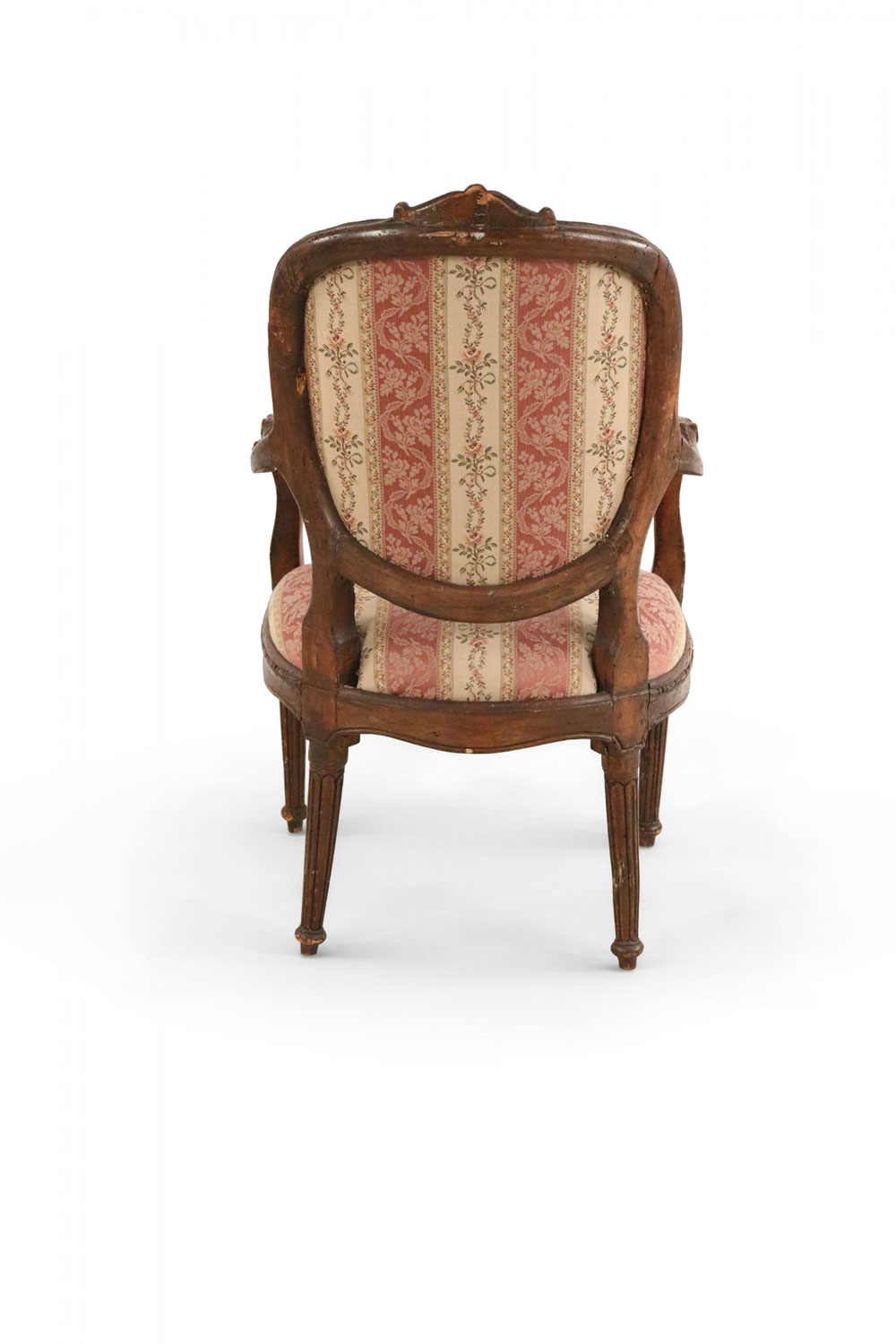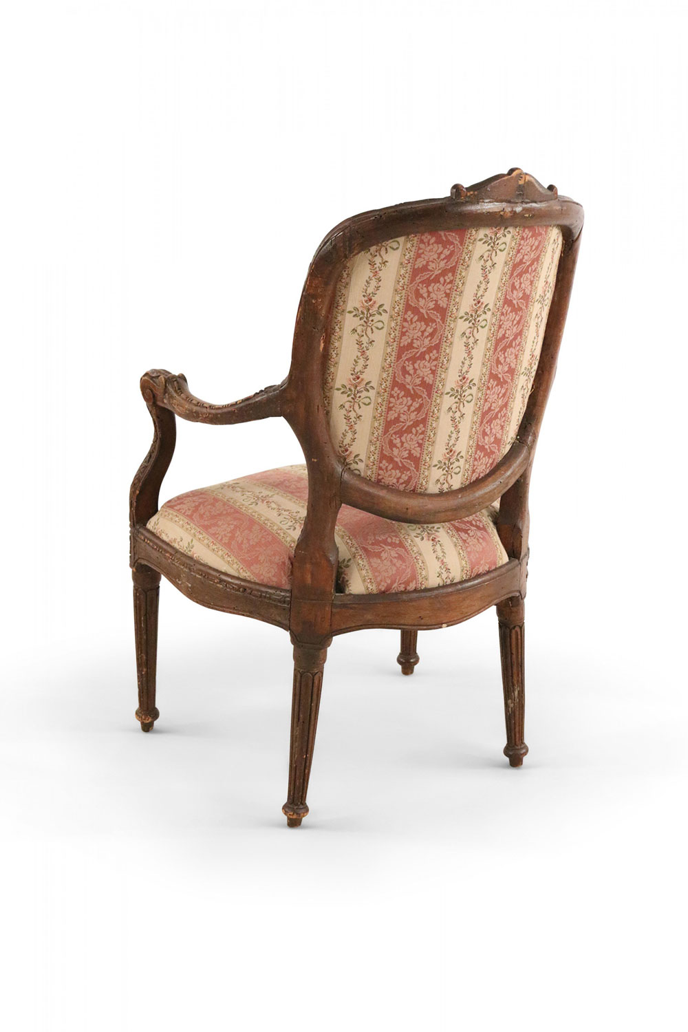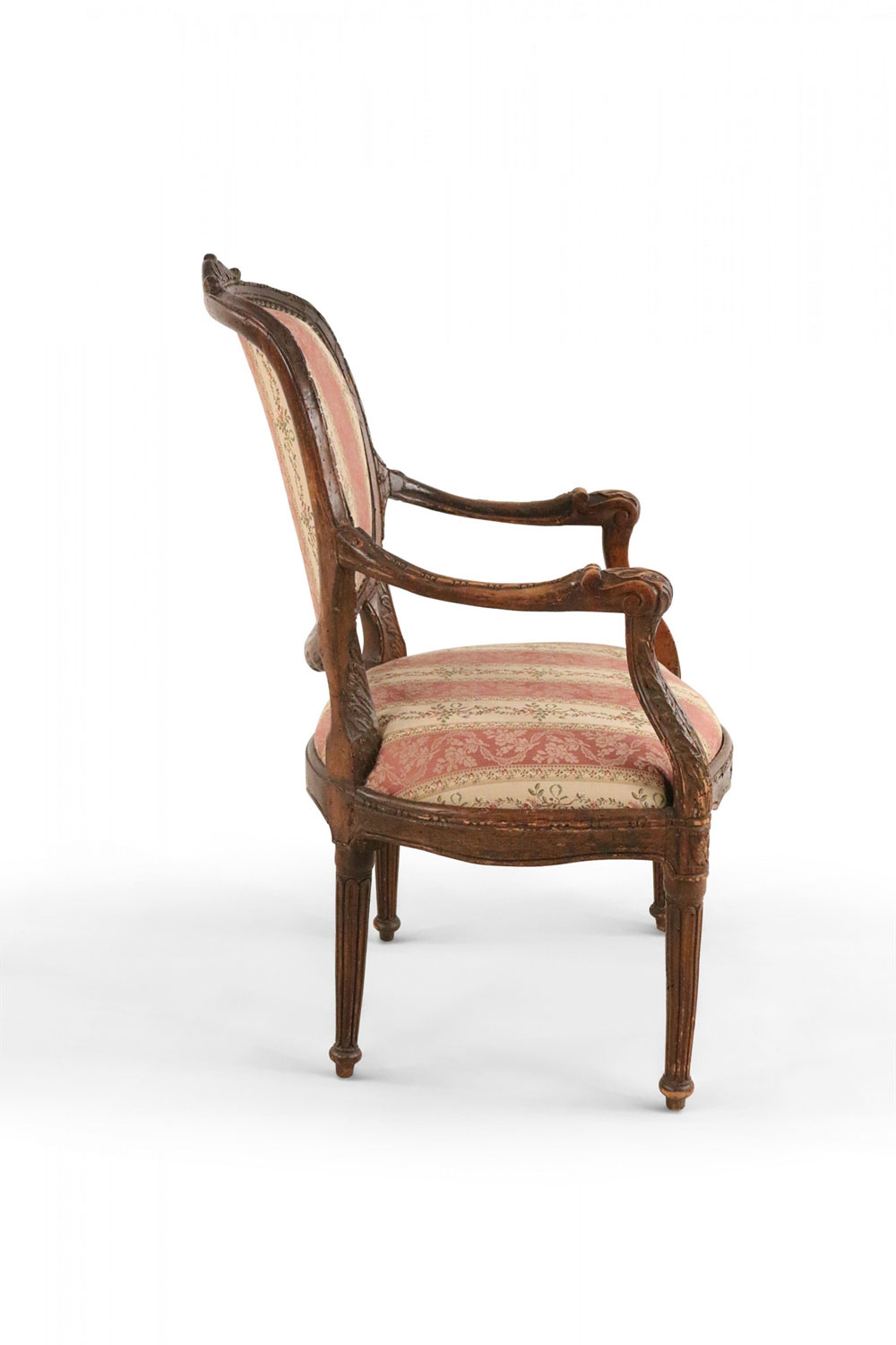 PAIR of French Louis XVI (18th Century) walnut armchairs with beige and pink stripe upholstered oval backs and seats and carved foliate details along frame supported on fluted legs. (PRICED AS PAIR).