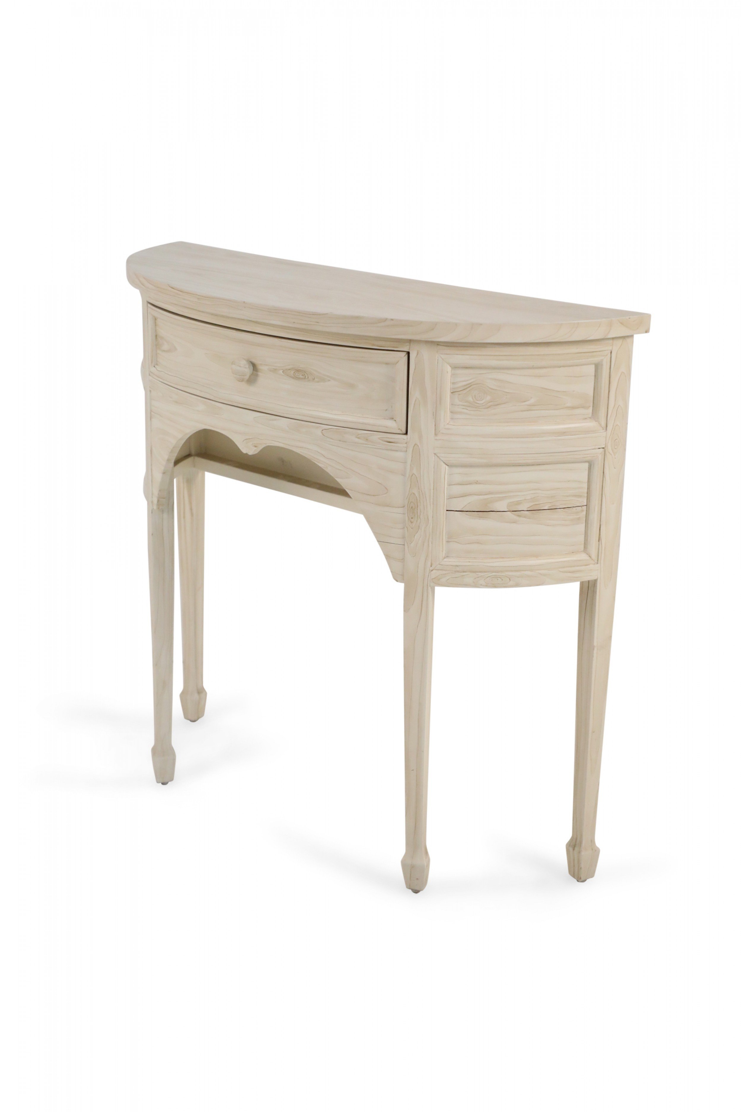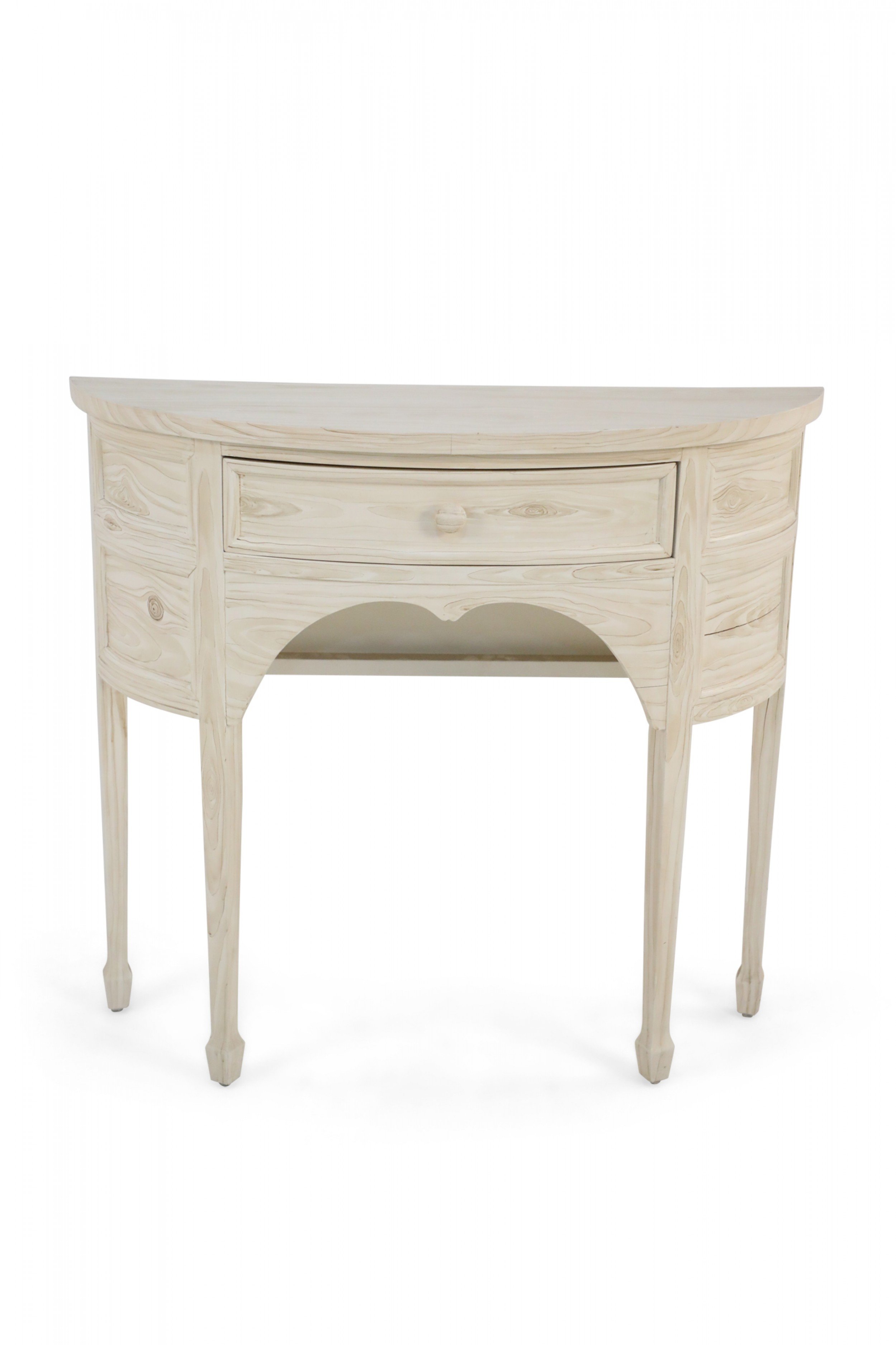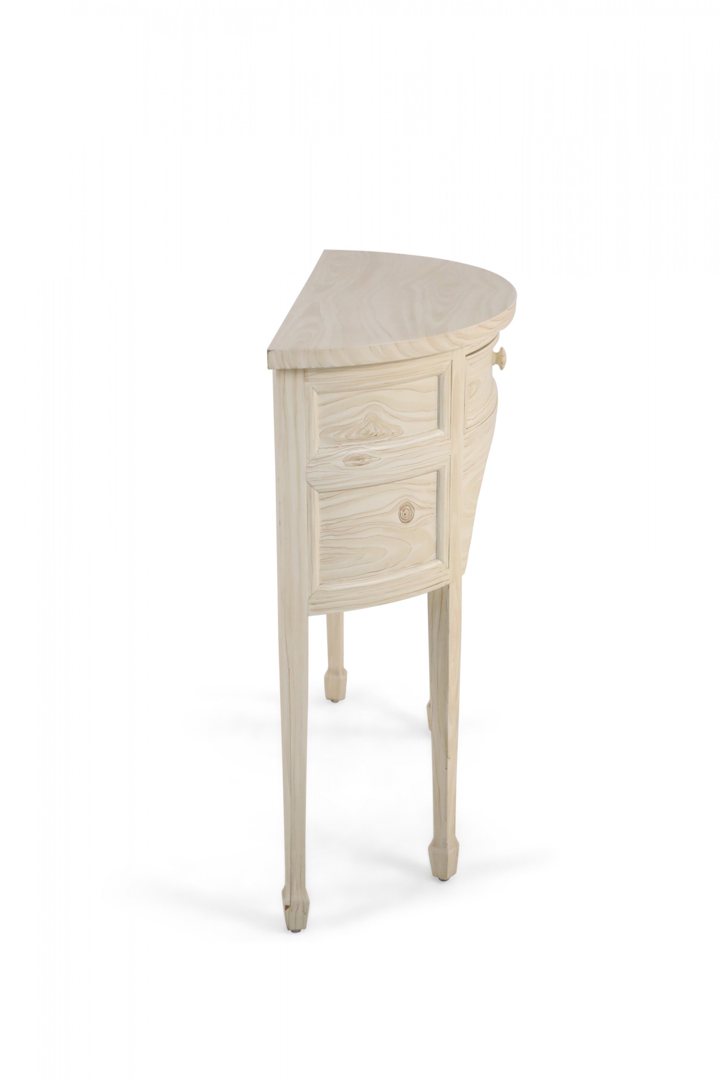 PAIR of French Provincial-style demilune console tables crafted in wood that achieves its light blonde shade through with an exaggerated faux bois finish that wraps the central drawers and side panels and extends down to four delicate legs that end in spade feet (PRICED AS PAIR)..