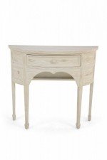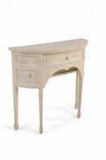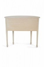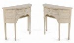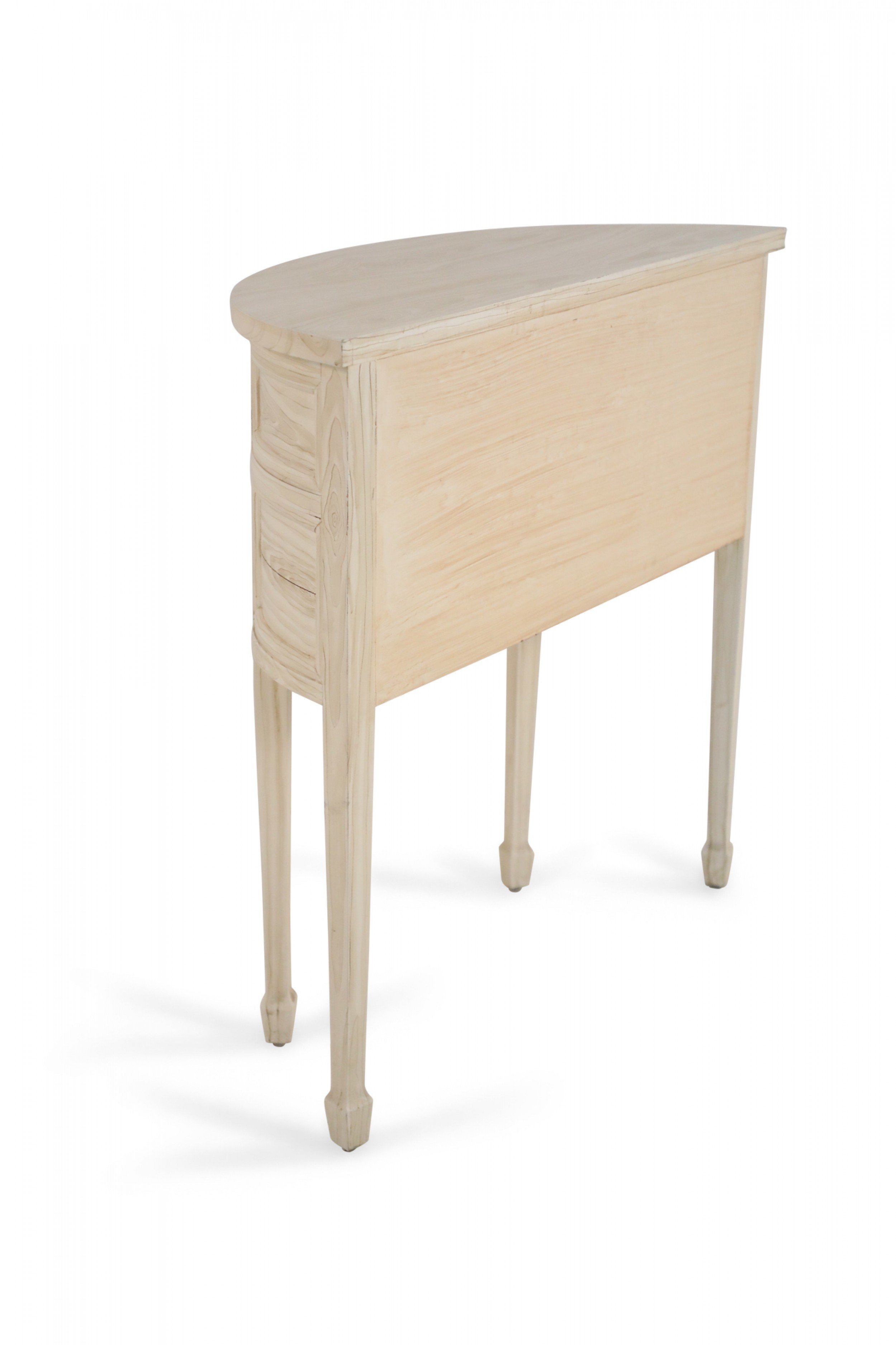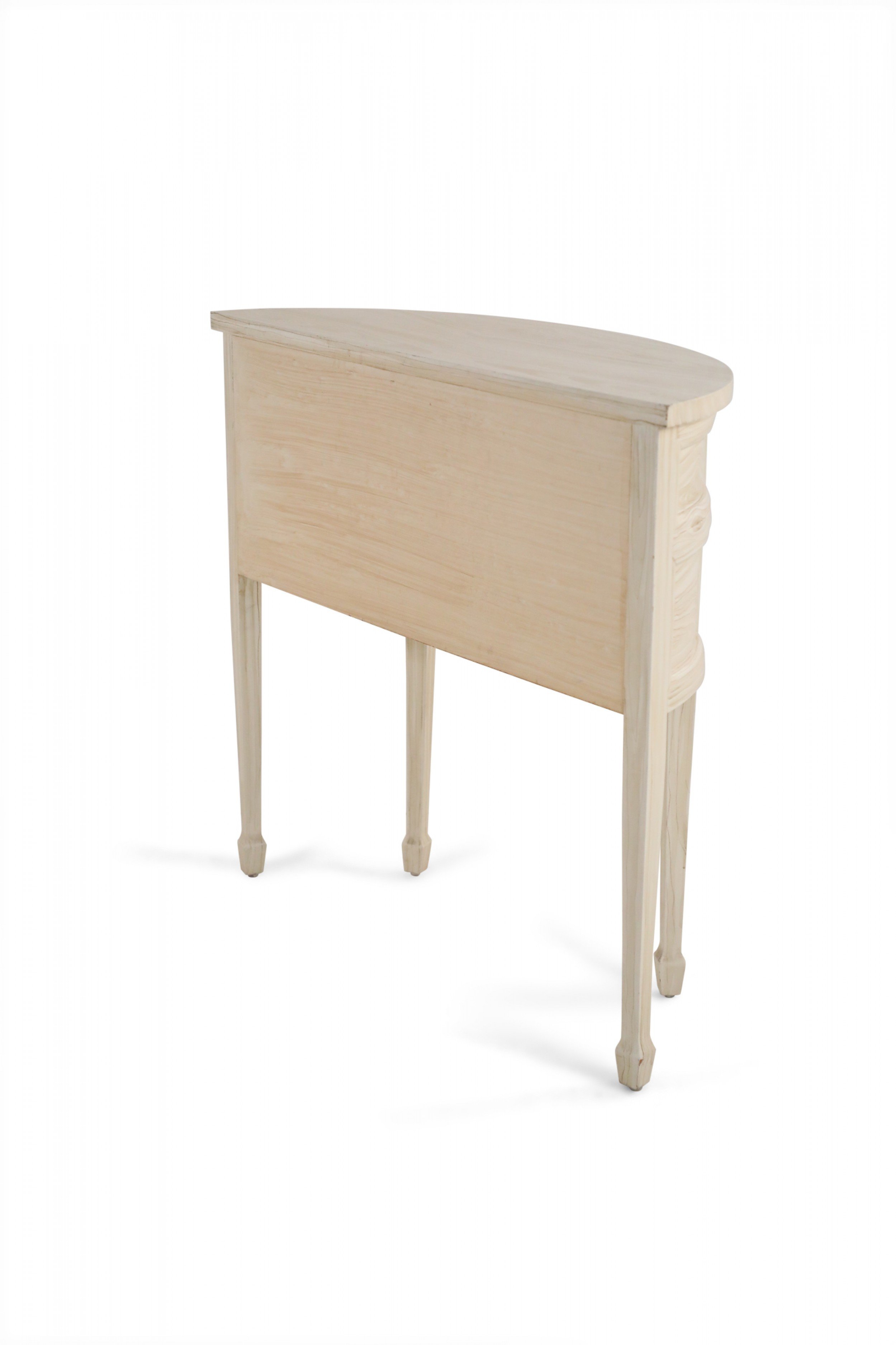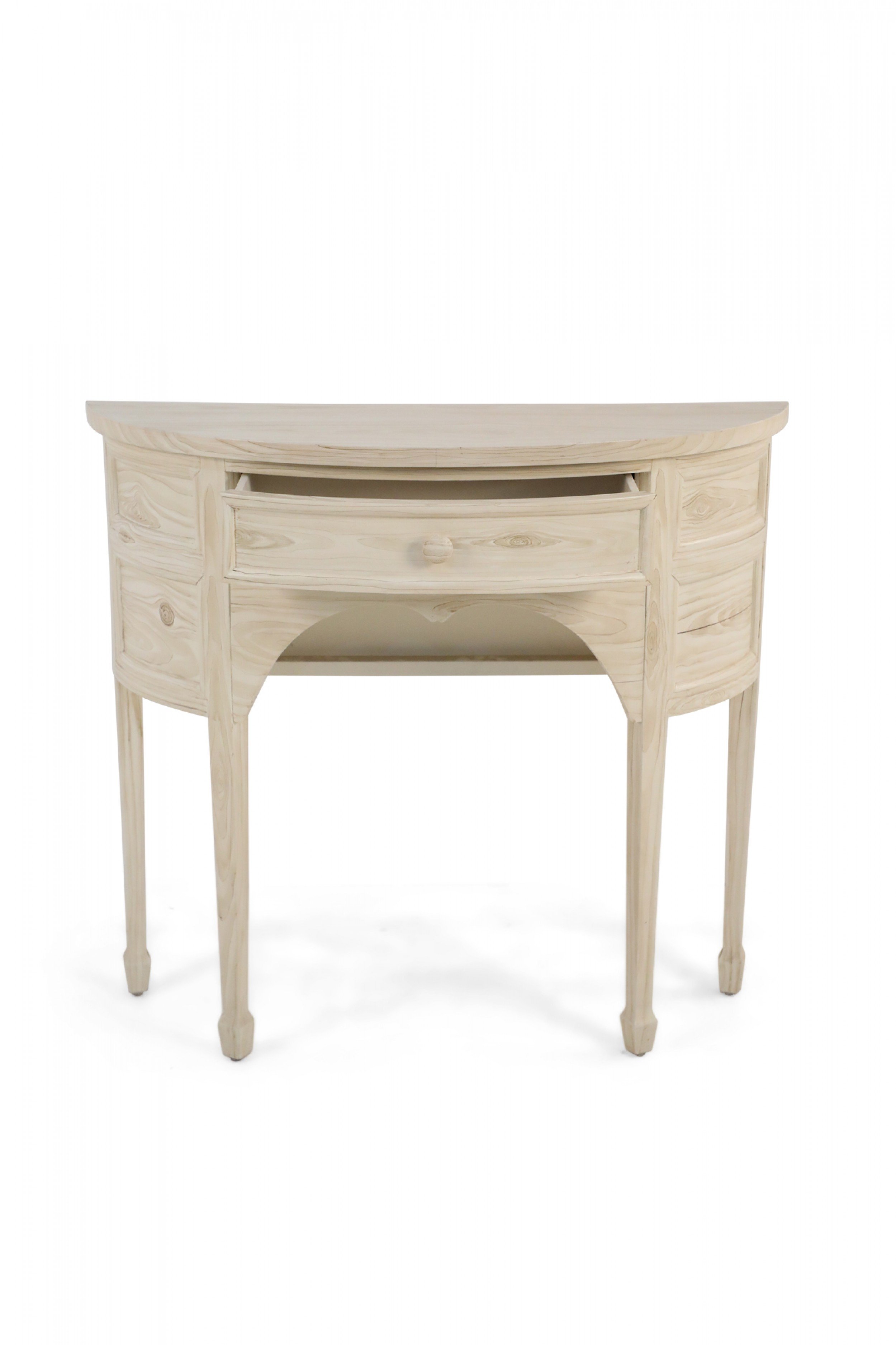 PAIR of French Provincial-style demilune console tables crafted in wood that achieves its light blonde shade through with an exaggerated faux bois finish that wraps the central drawers and side panels and extends down to four delicate legs that end in spade feet (PRICED AS PAIR)..