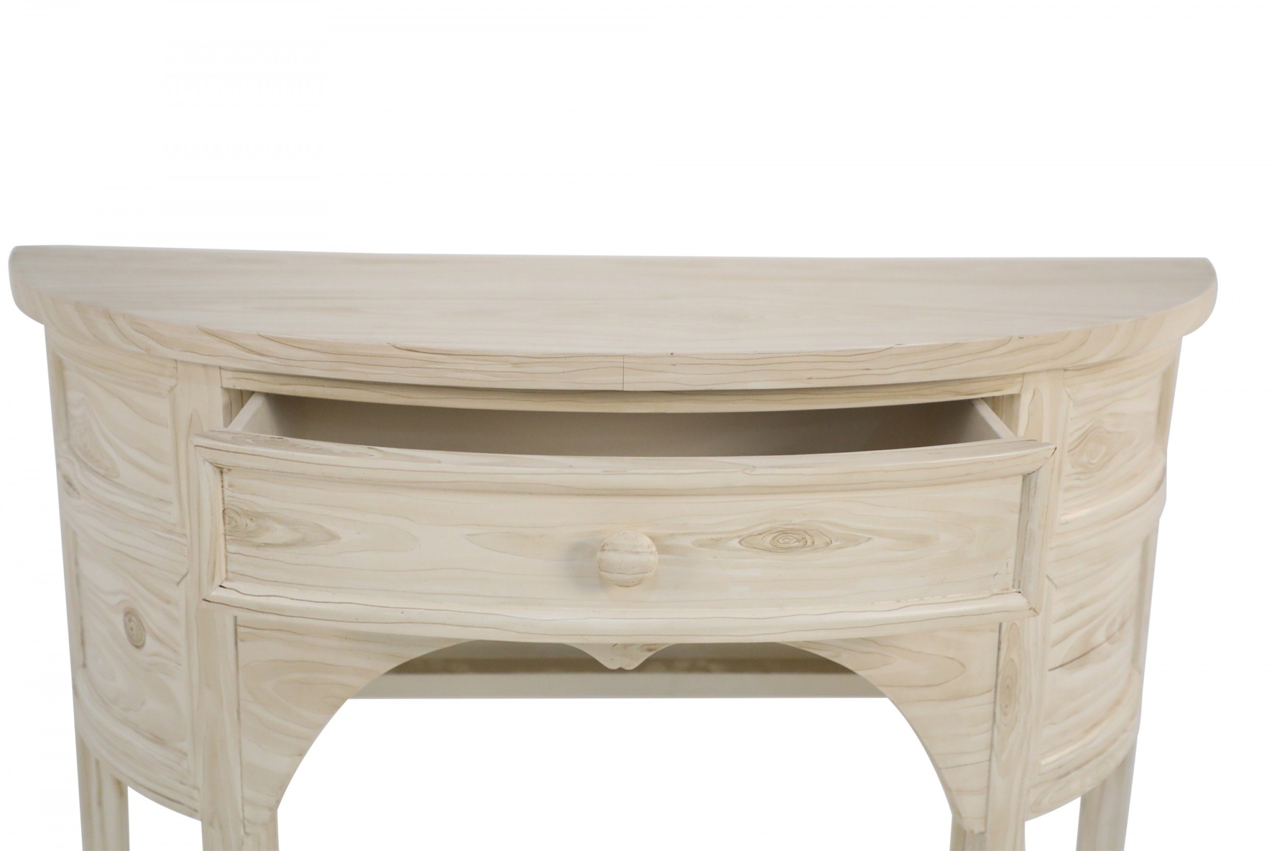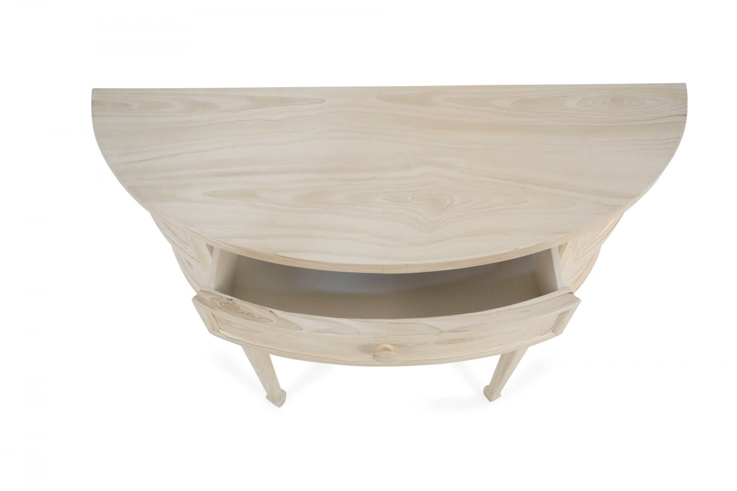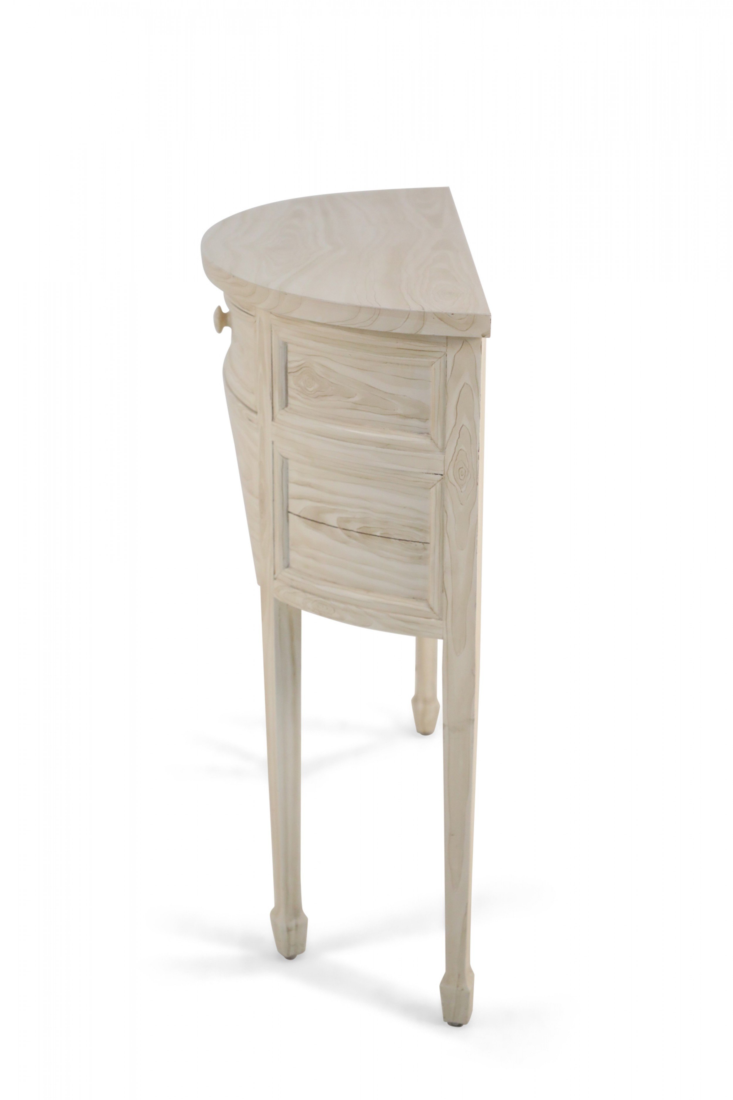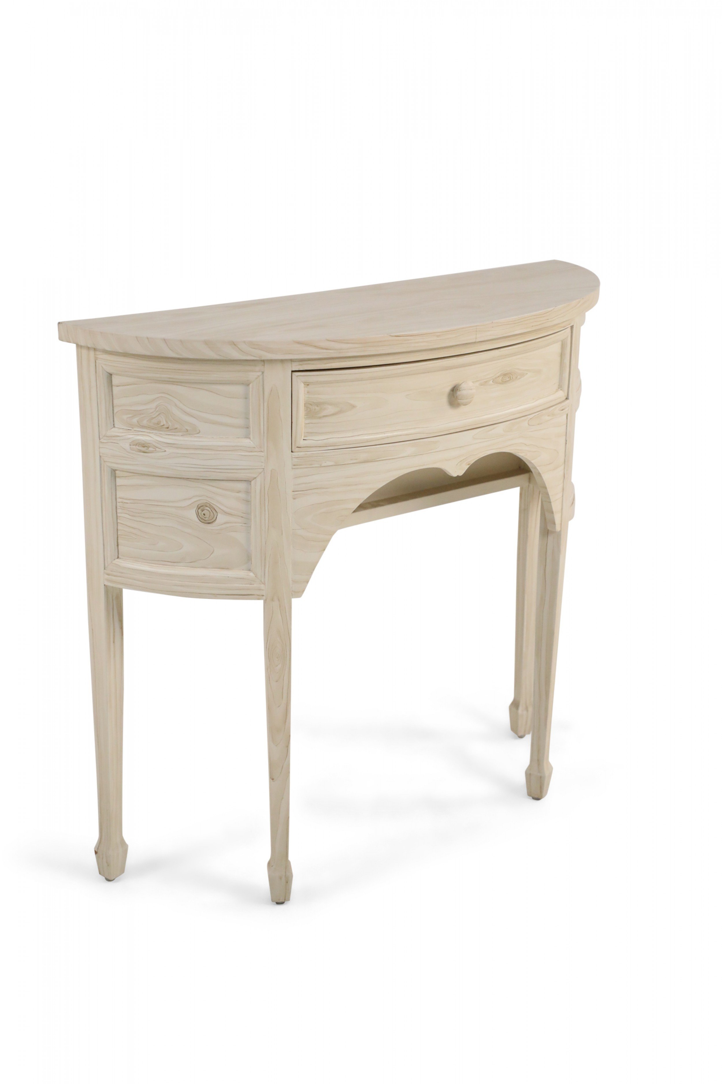 PAIR of French Provincial-style demilune console tables crafted in wood that achieves its light blonde shade through with an exaggerated faux bois finish that wraps the central drawers and side panels and extends down to four delicate legs that end in spade feet (PRICED AS PAIR).