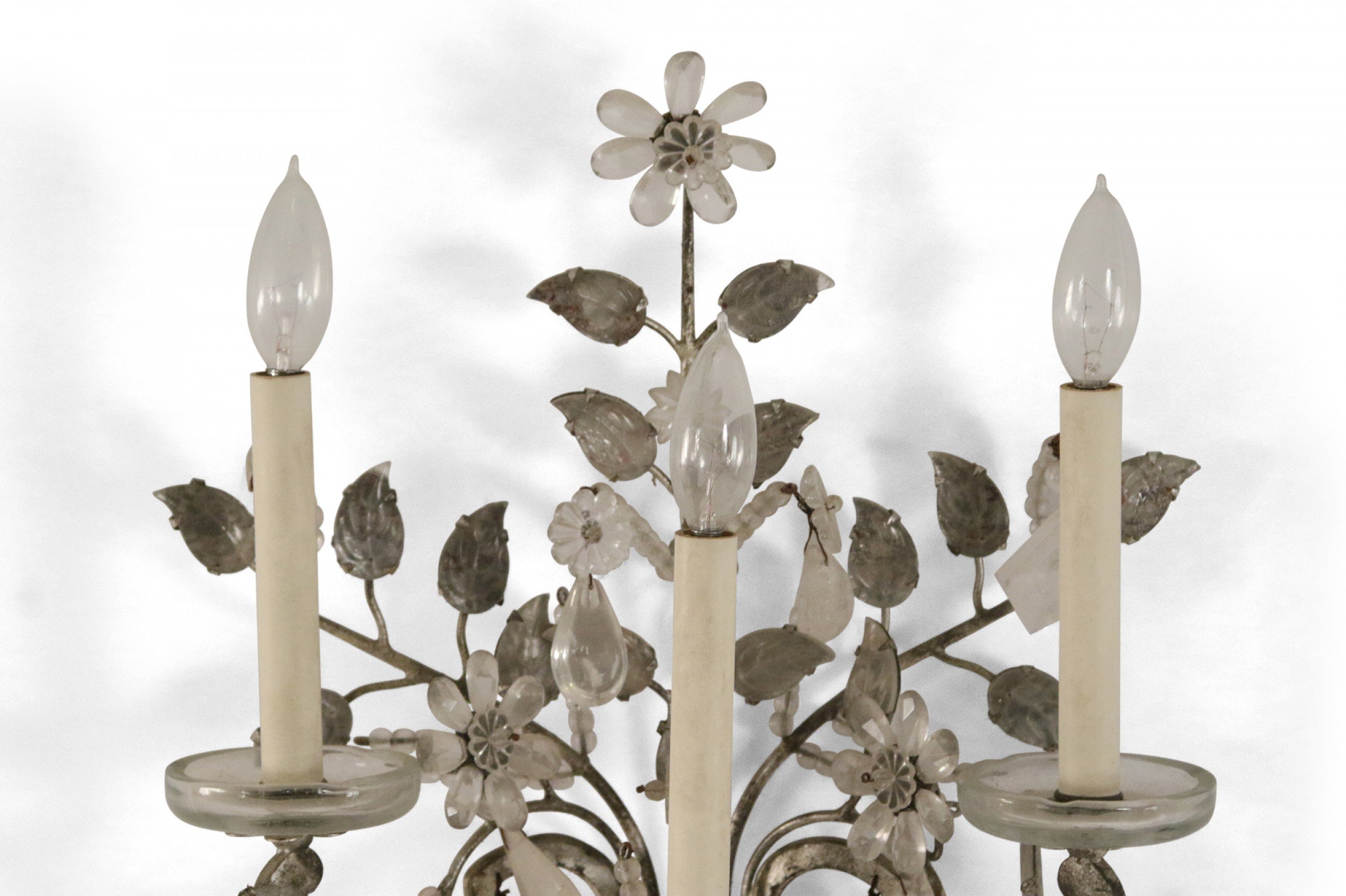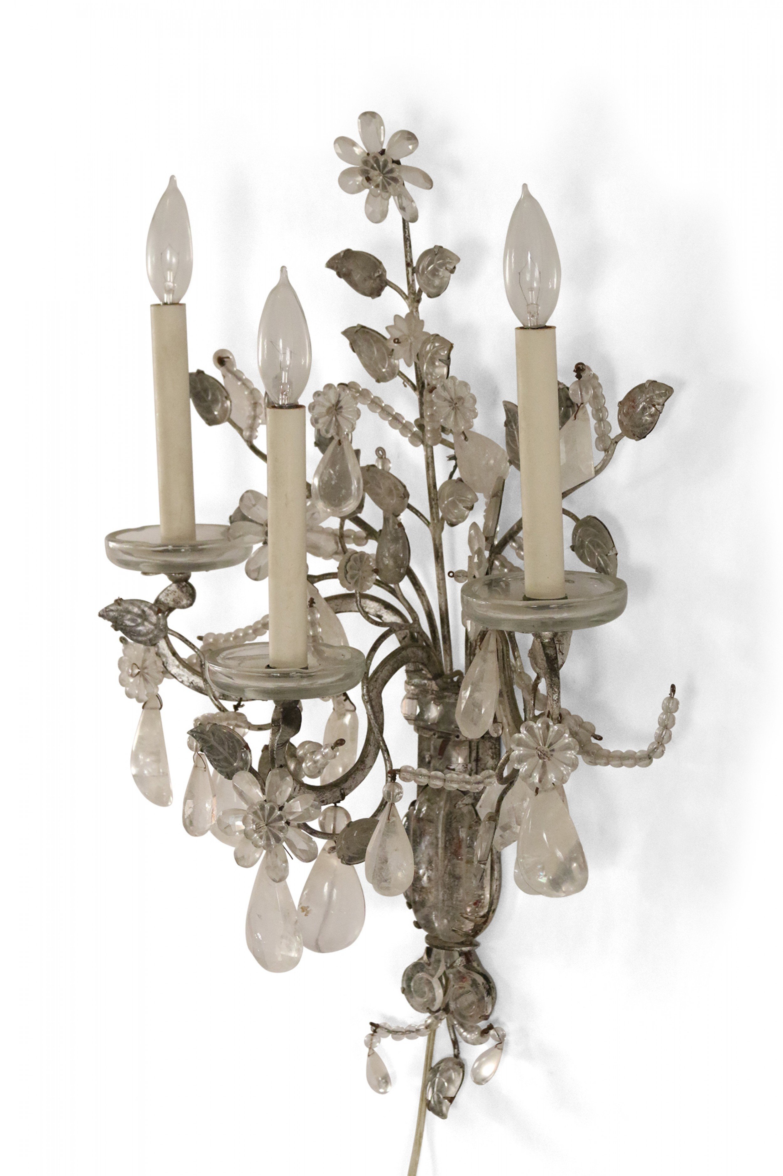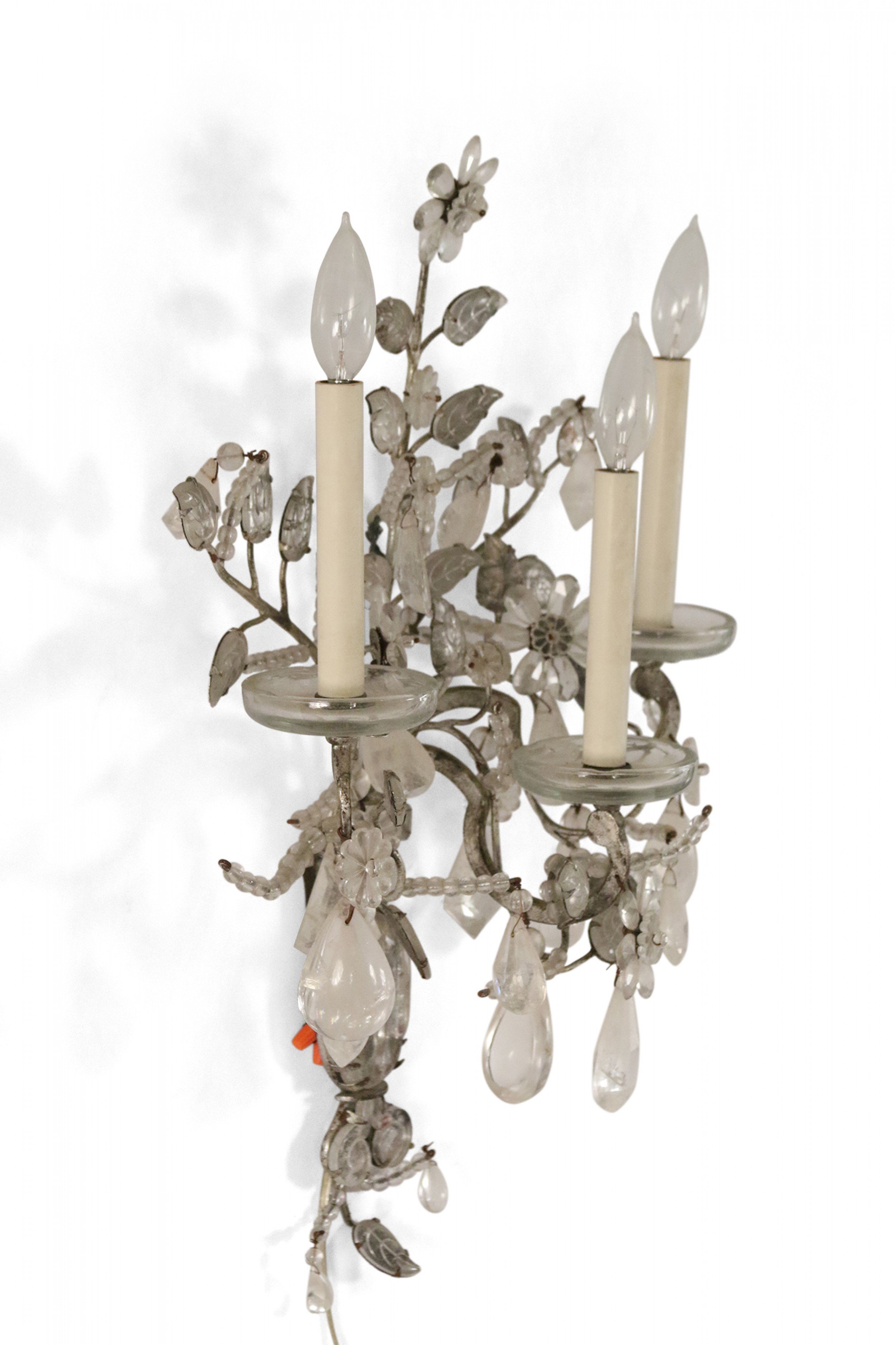 PAIR of French Victorian-style metal 3-light (electrified) wall sconces with rock crystal leaf design, and decorative teardrops (PRICED AS PAIR).