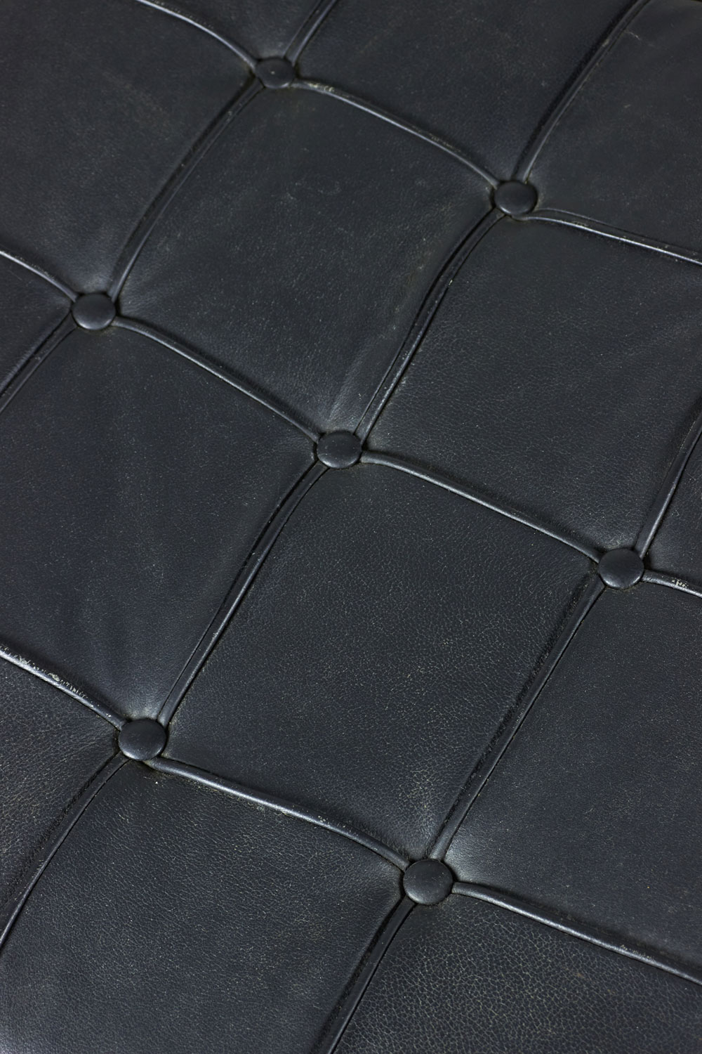 PAIR of American Mid-Century International Style (circa 1950) 'Barcelona' ottomans / benches with square tufted black leather tops supported by polished chrome bases. (PRICED AS PAIR) (manner of MIES VAN DER ROHE FOR KNOLL INTERNATIONAL)