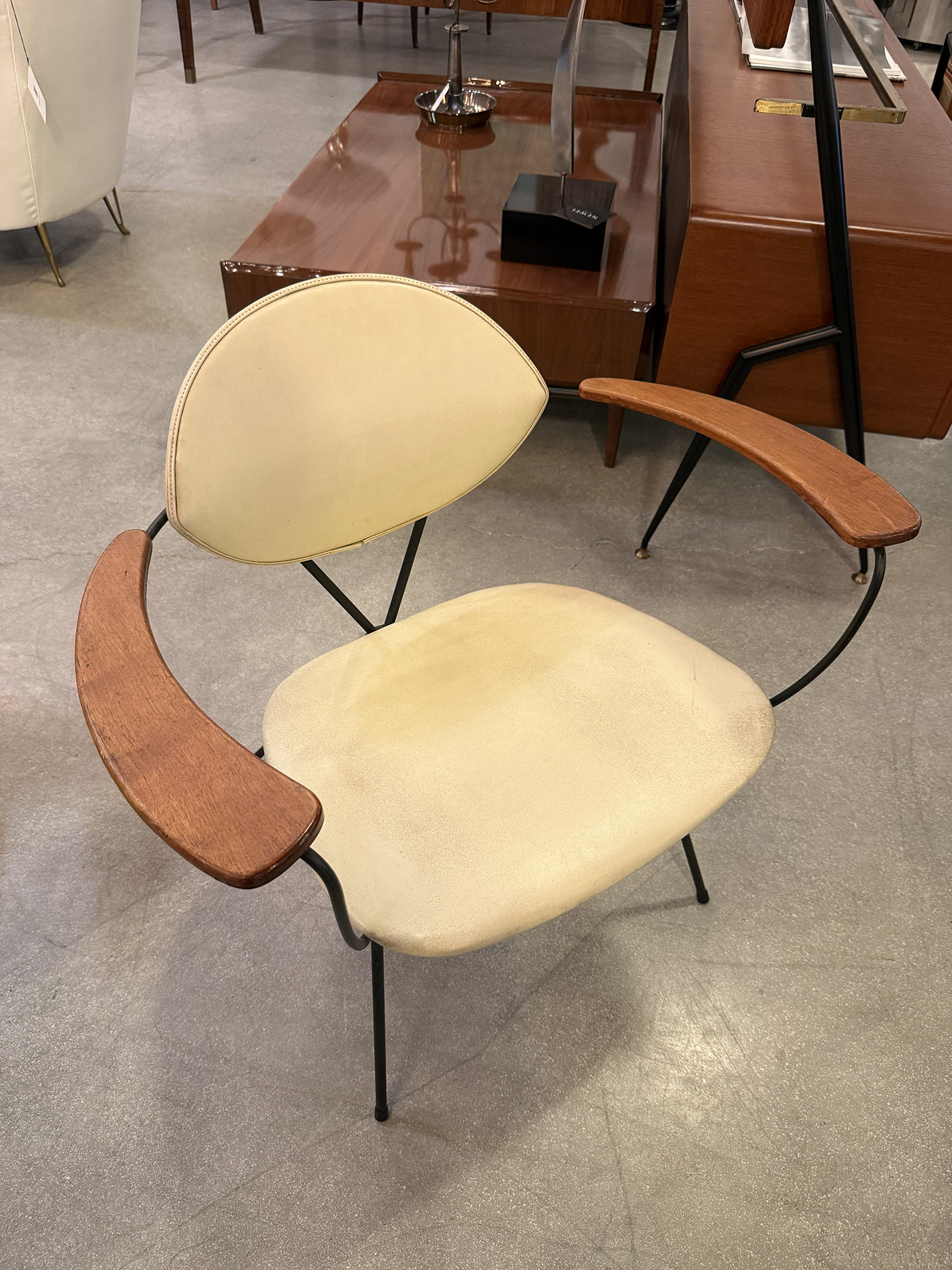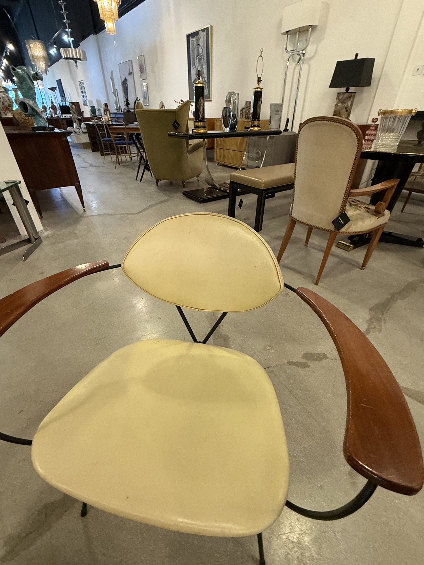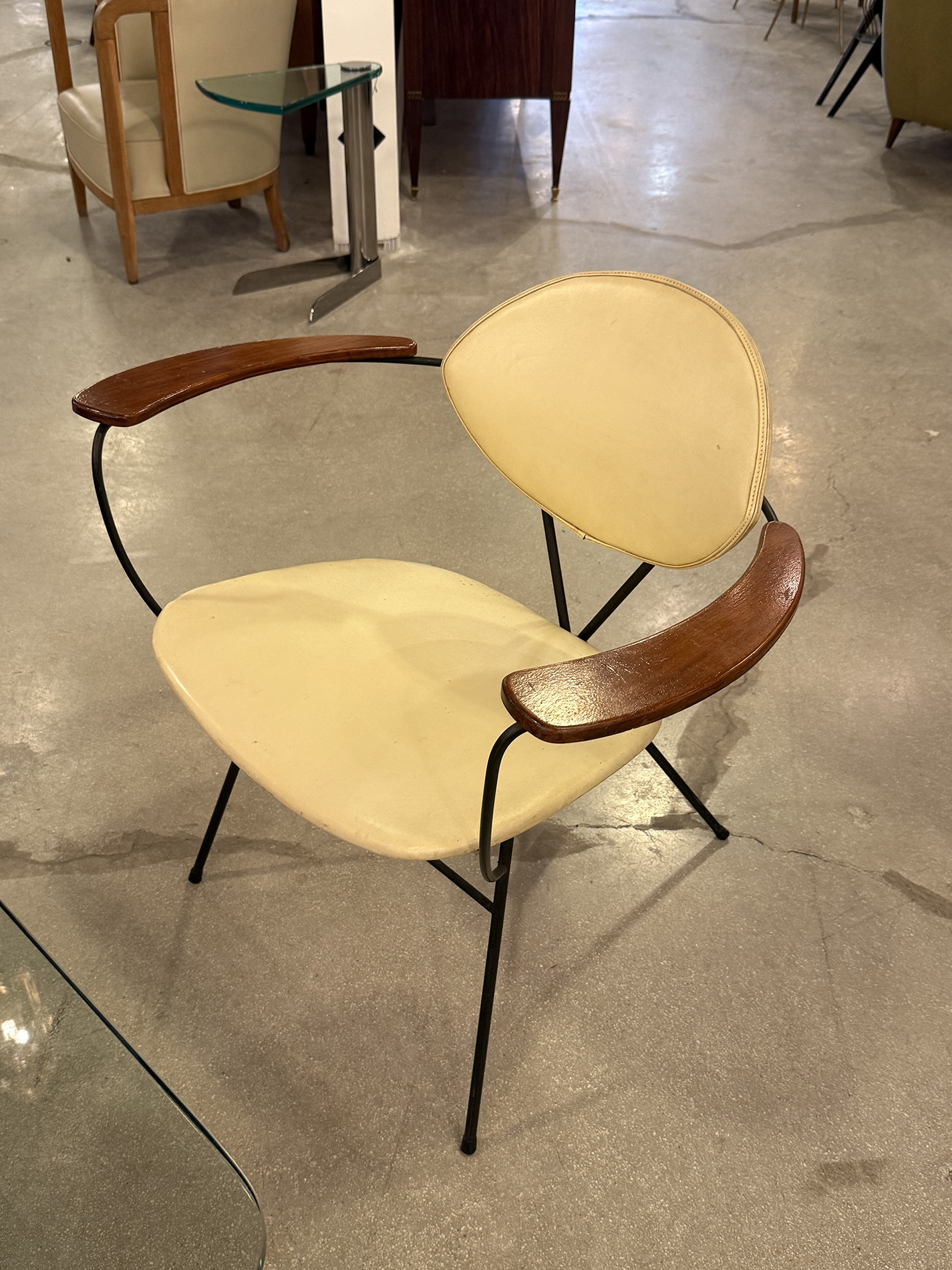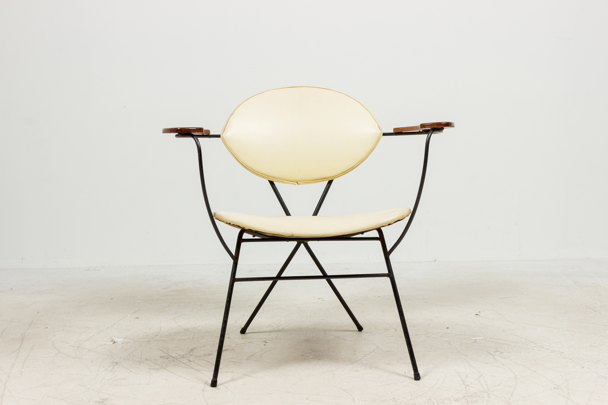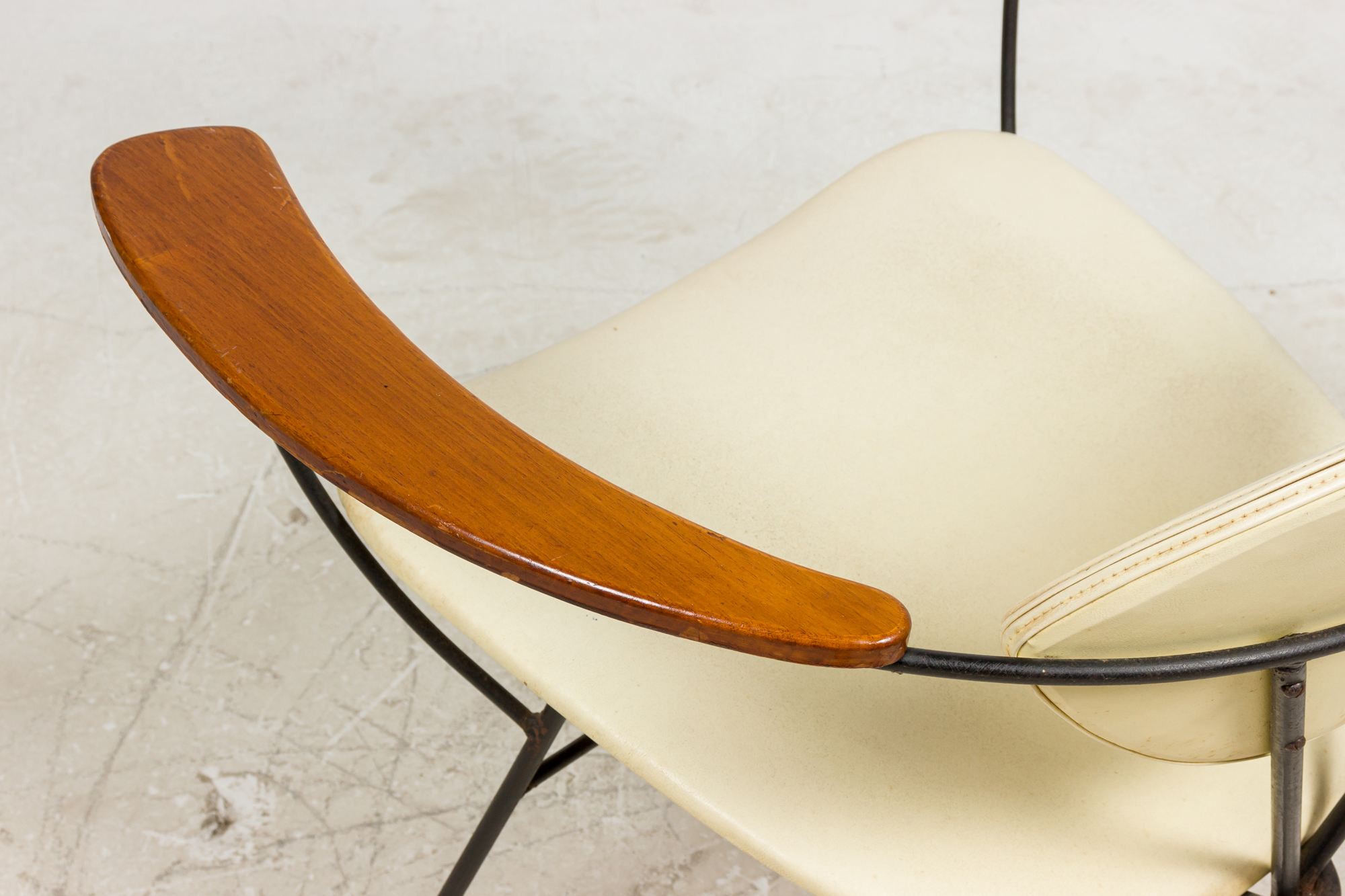PAIR of American Mid-Century lounge armchairs with wrought iron frames and wooden armrests, upholstered in beige vinyl. (JOSEPH CICCHELLI FOR REILLY-WOLFF ASSOCIATES)(PRICED AS PAIR)