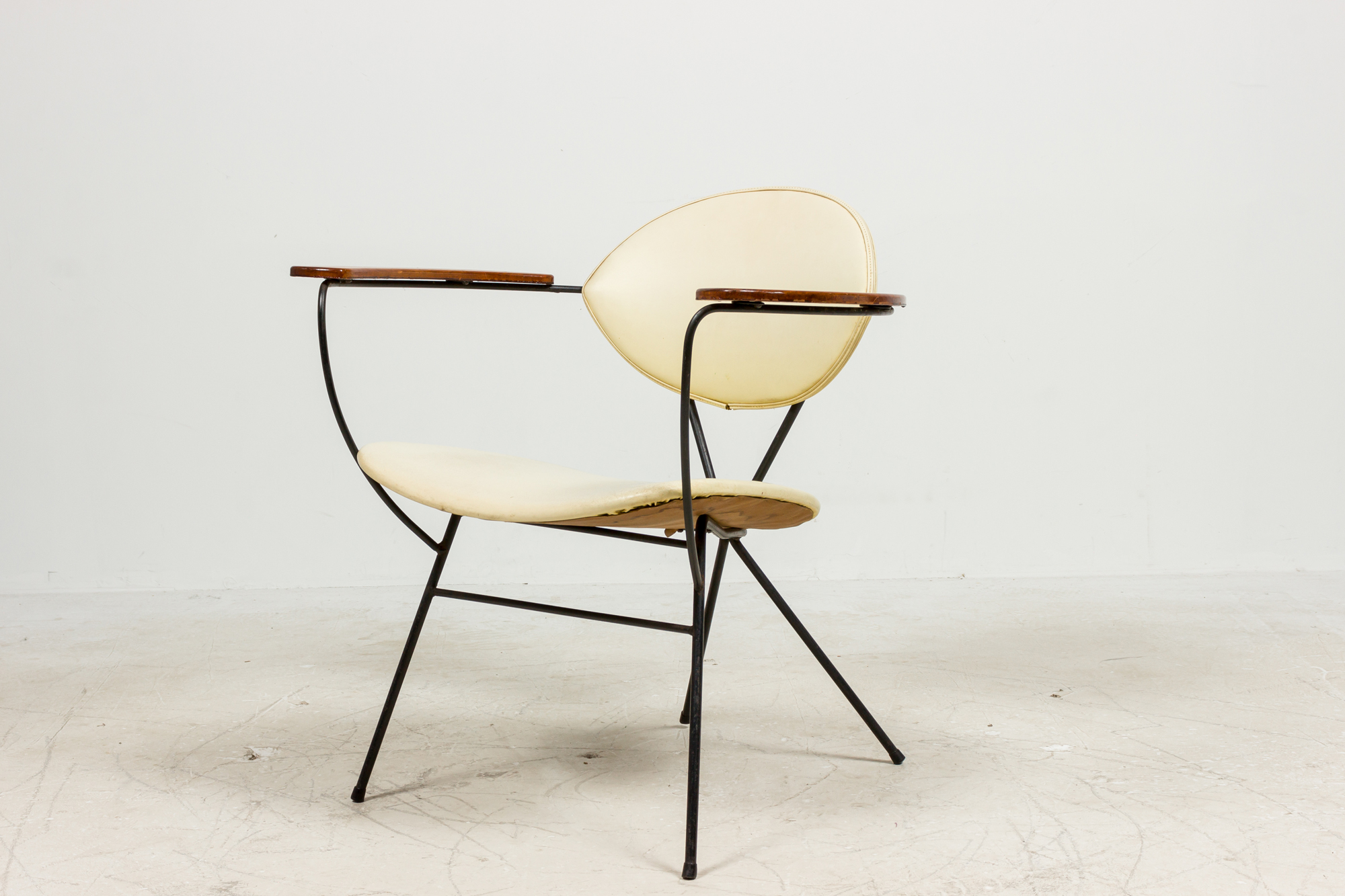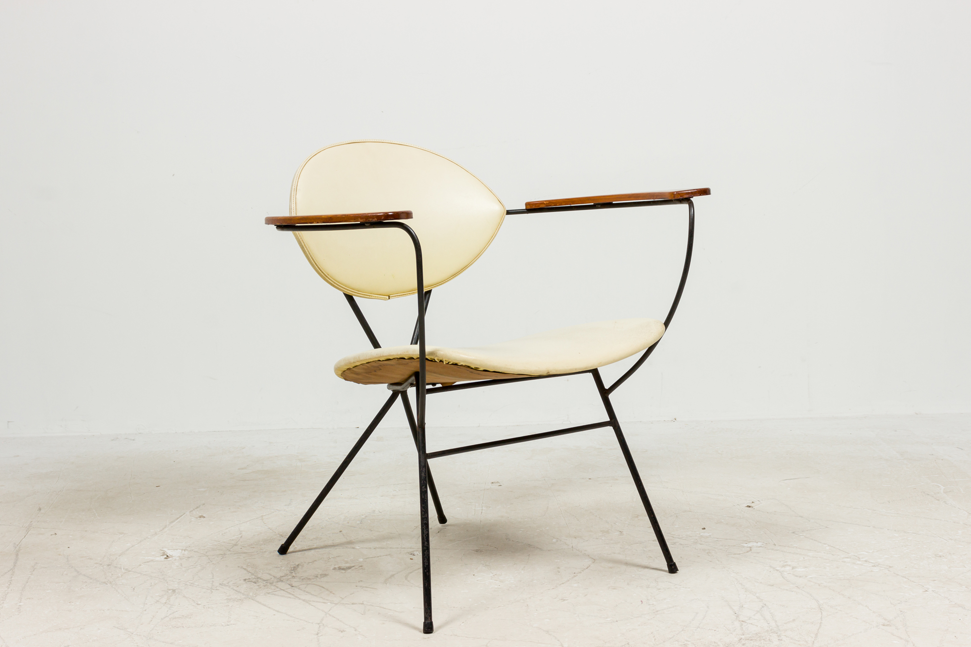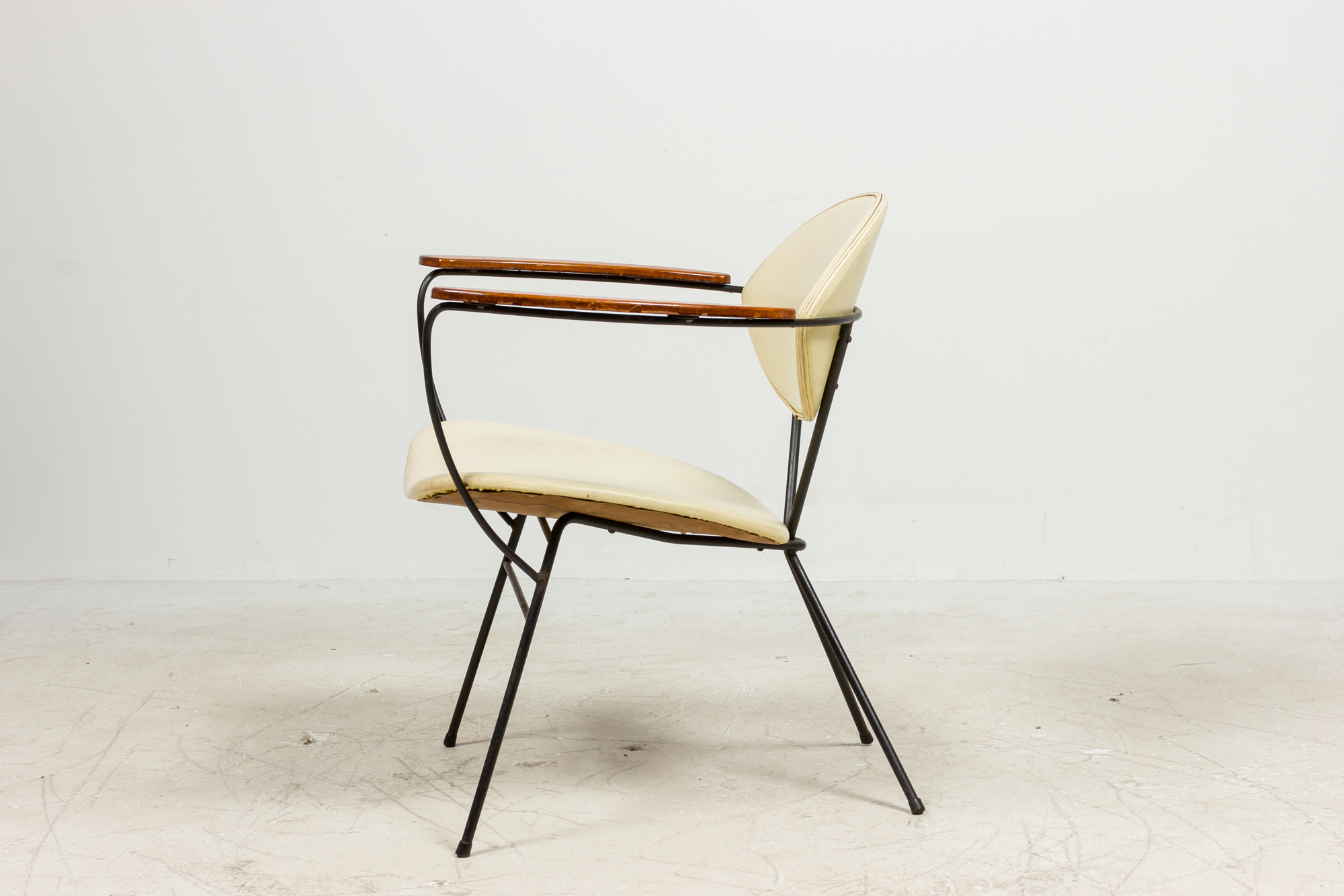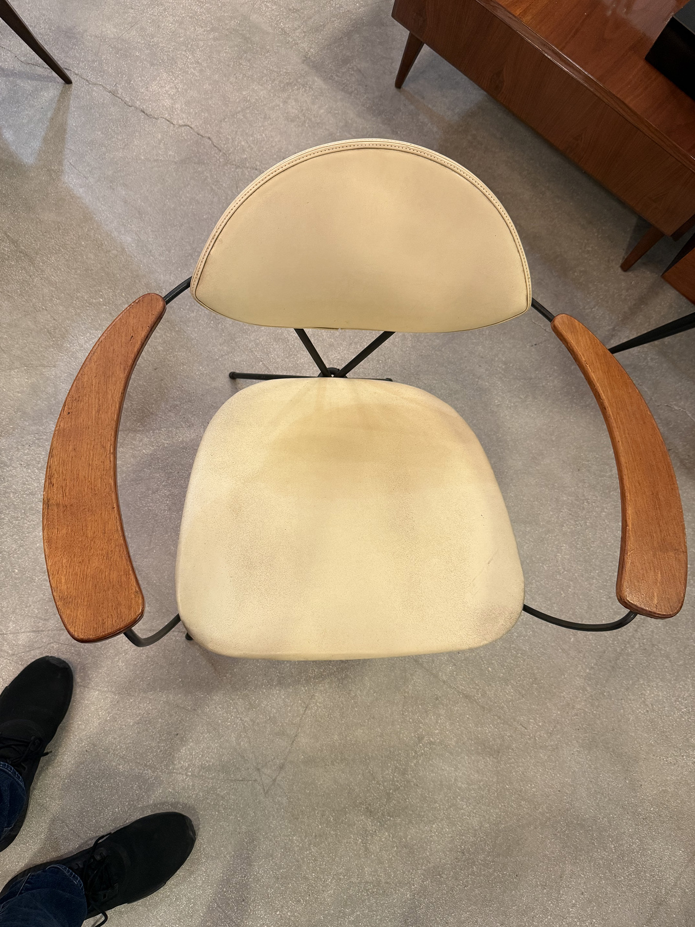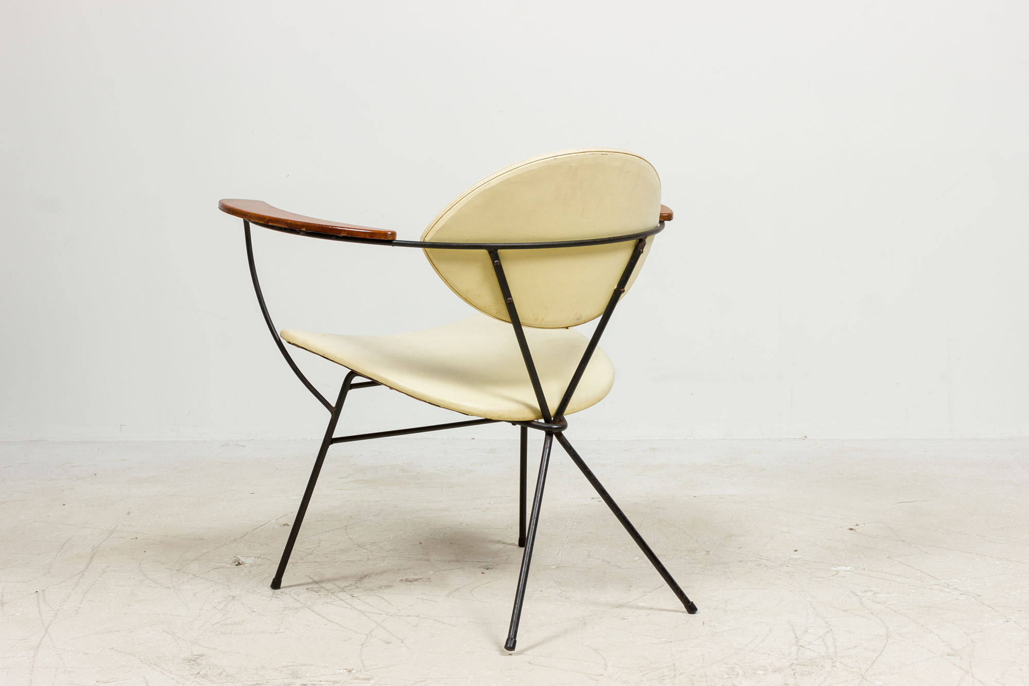 PAIR of American Mid-Century lounge armchairs with wrought iron frames and wooden armrests, upholstered in beige vinyl. (JOSEPH CICCHELLI FOR REILLY-WOLFF ASSOCIATES)(PRICED AS PAIR)
