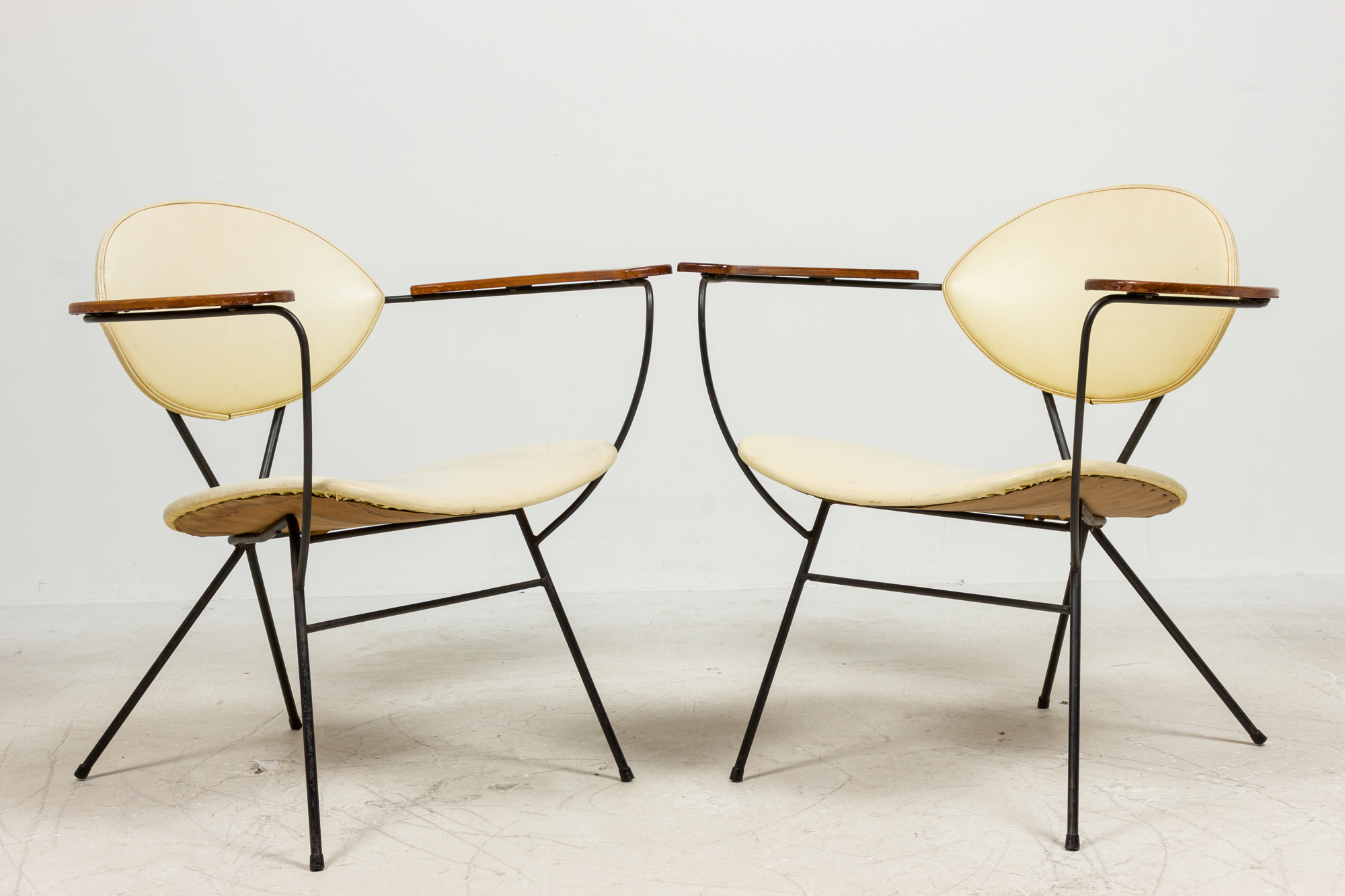 PAIR of American Mid-Century lounge armchairs with wrought iron frames and wooden armrests, upholstered in beige vinyl. (JOSEPH CICCHELLI FOR REILLY-WOLFF ASSOCIATES)(PRICED AS PAIR).