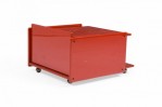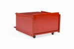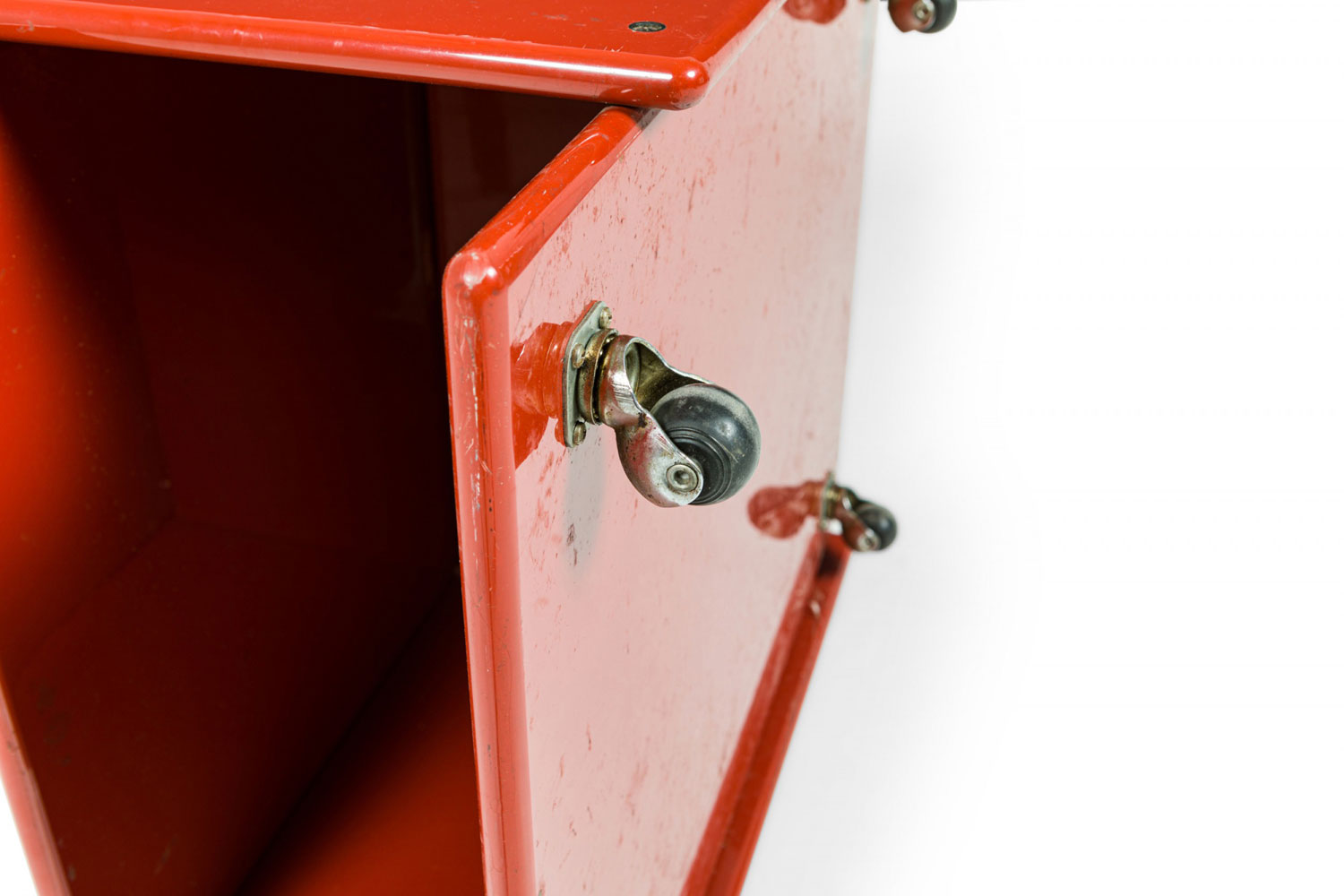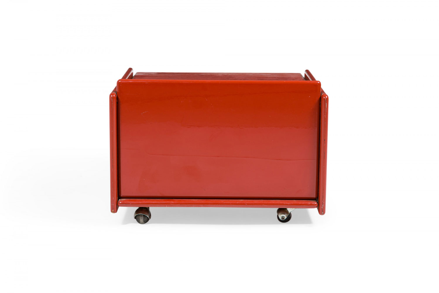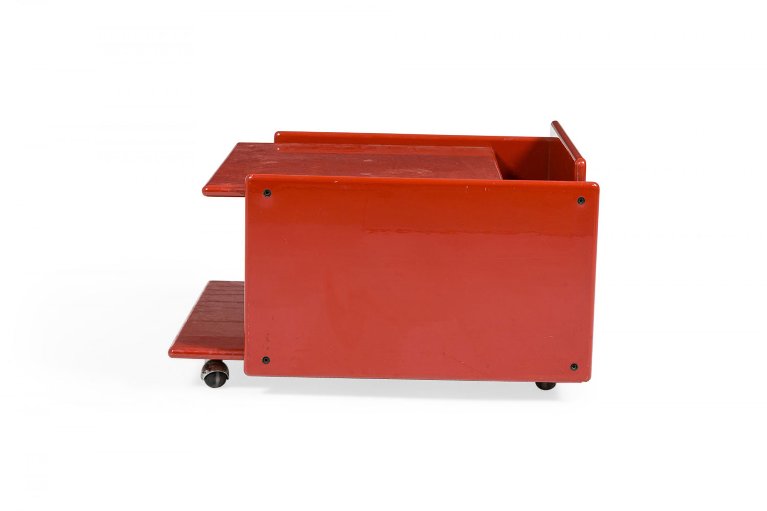 PAIR of Japanese Mid-Century rolling occasional / bedside tables in cinnabar lacquer with a low staggered profile with an open interior compartment, resting on four black casters. (KAZUHIDE TAKAHAMA FOR GAVINA SpA)(PRICED AS PAIR)