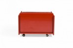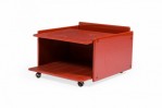 PAIR of Japanese Mid-Century rolling occasional / bedside tables in cinnabar lacquer with a low staggered profile with an open interior compartment, resting on four black casters. (KAZUHIDE TAKAHAMA FOR GAVINA SpA)(PRICED AS PAIR).