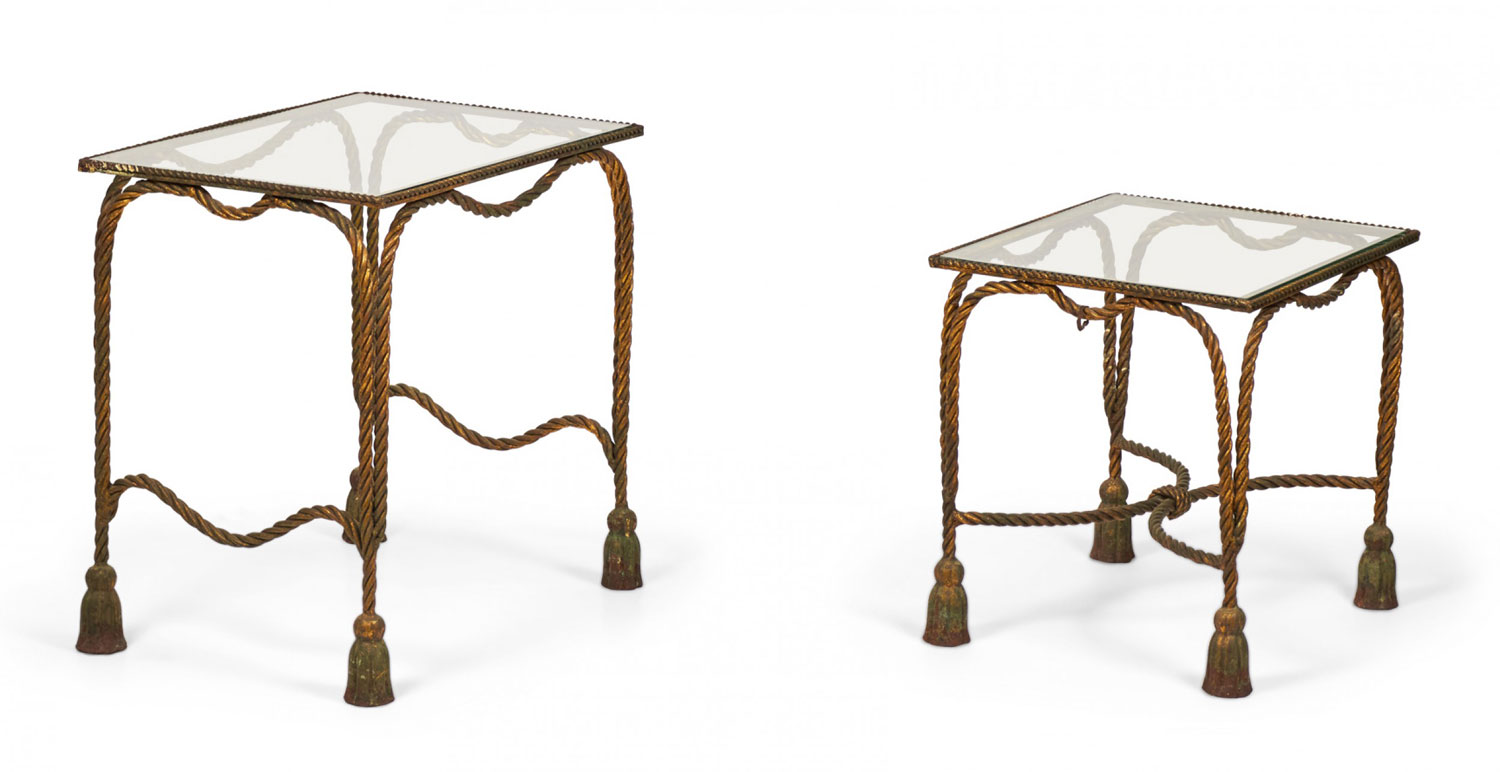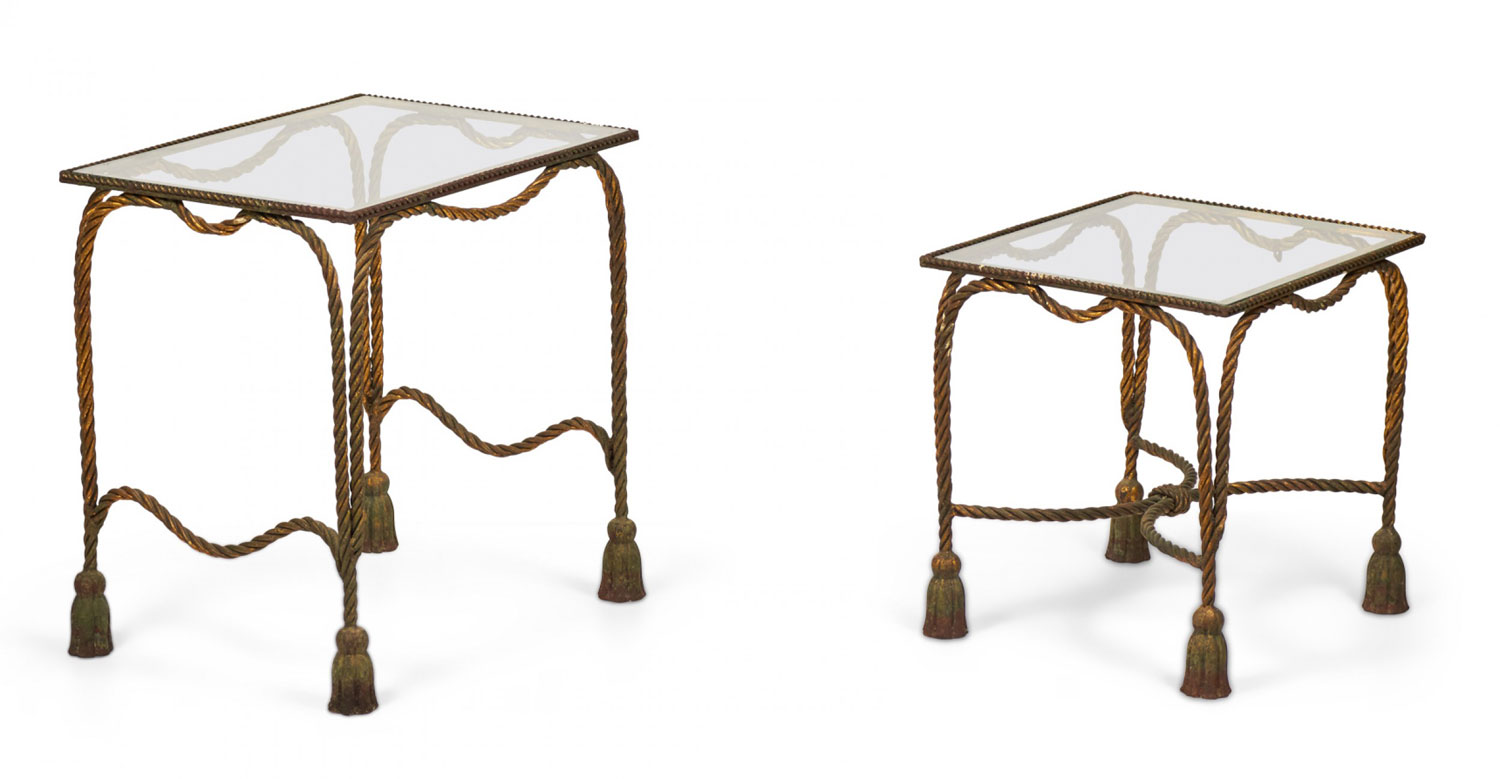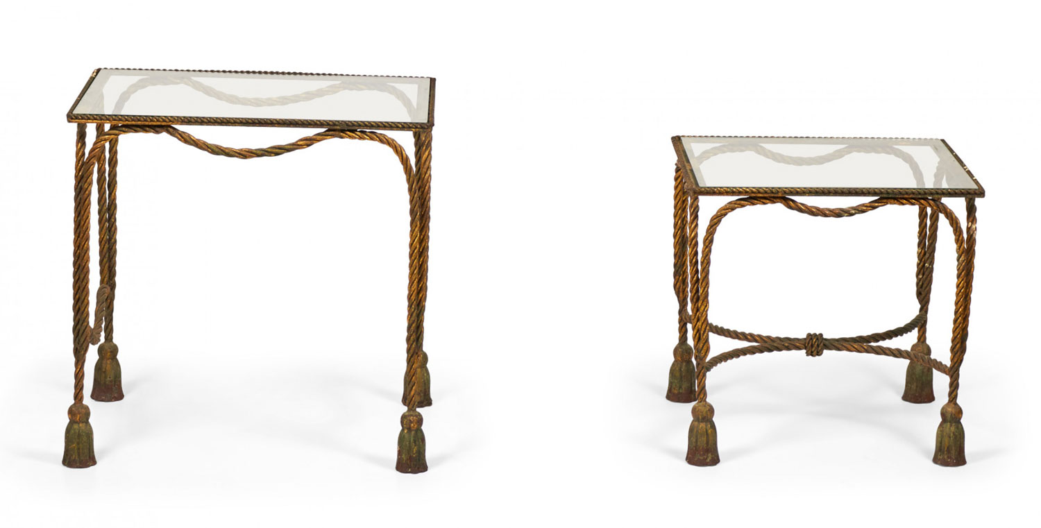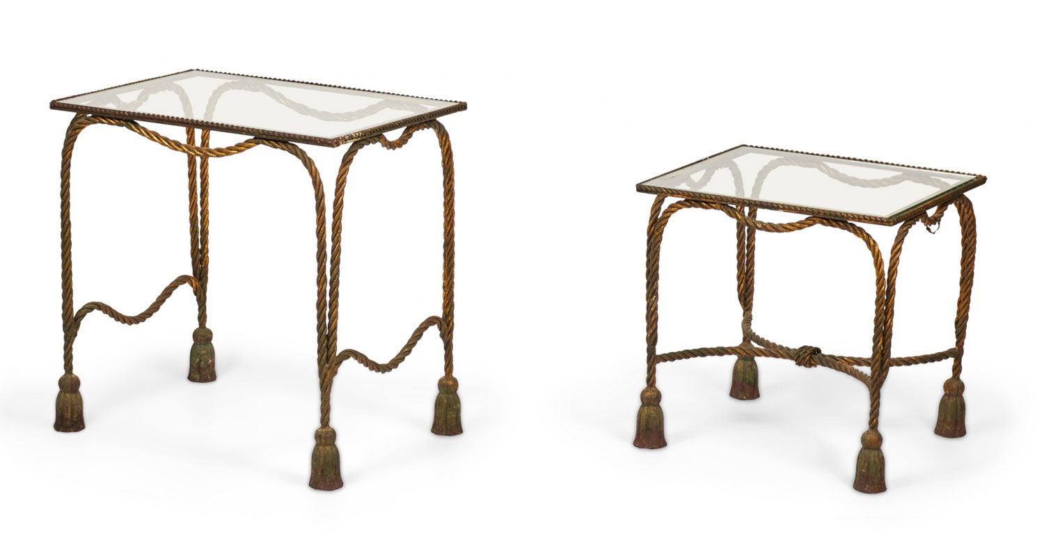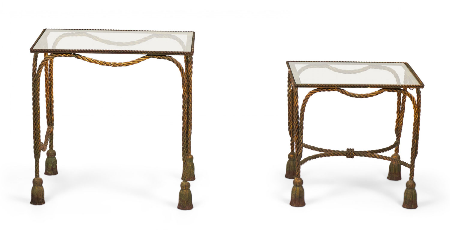 Italian Baroque-Style Mid-Century (circa 1950) Rope and Tassel nesting tables with gilt iron frames and clear glass table tops. (two tables, PRICED AS SET) (PALLADIO, ITALY).
