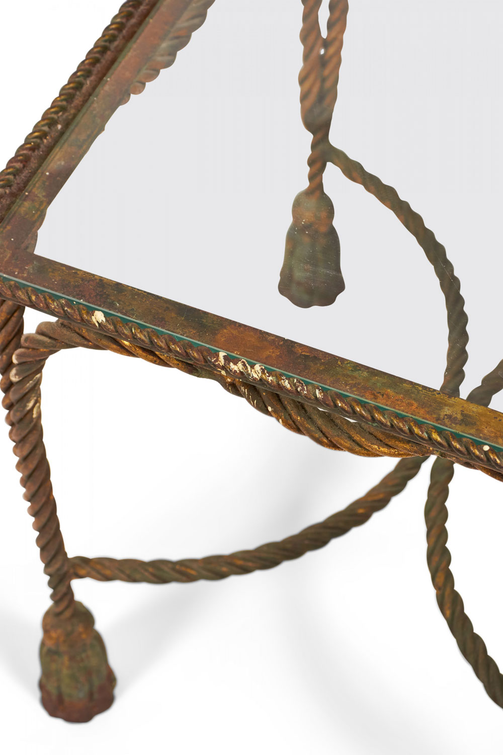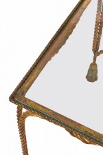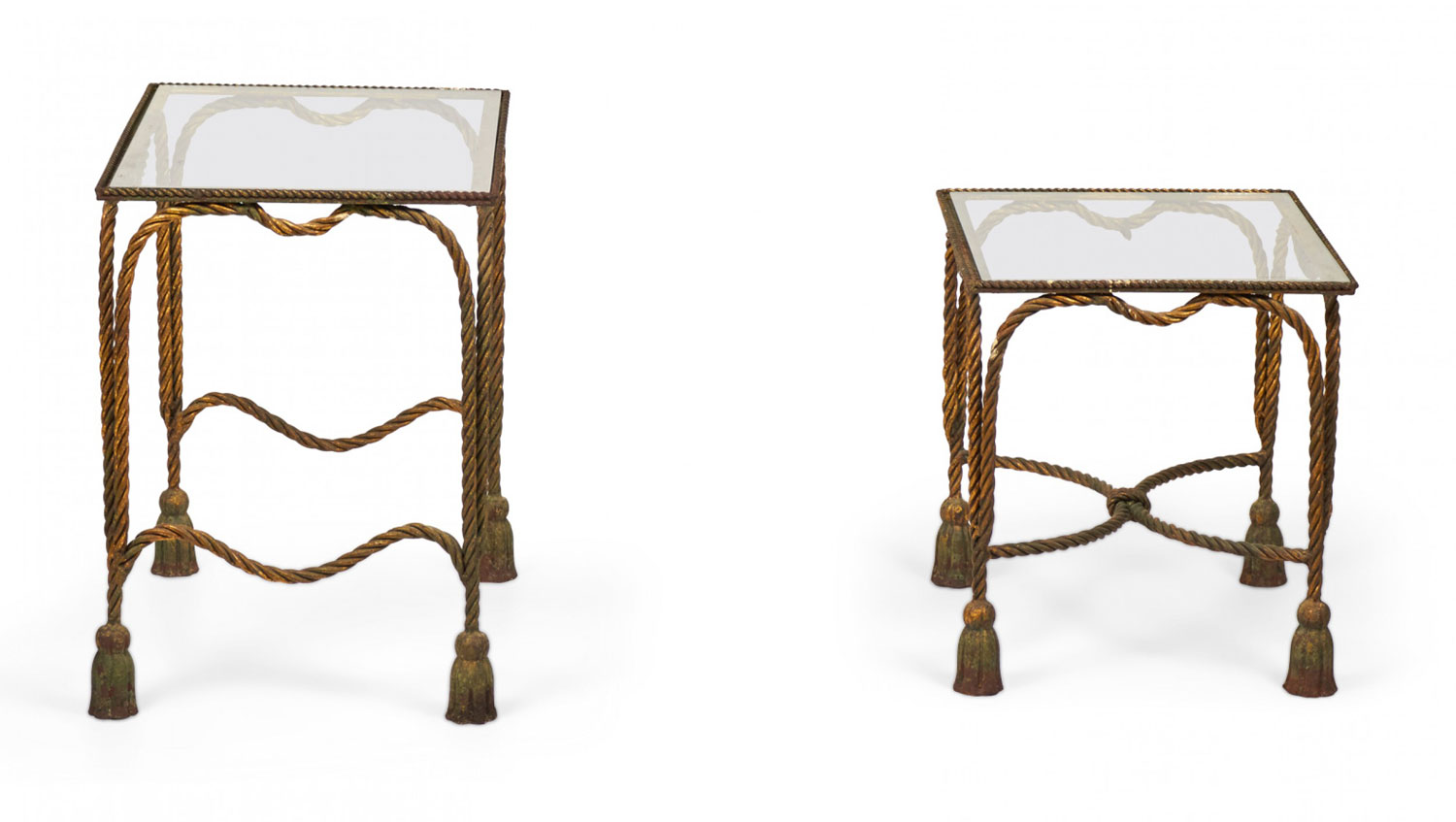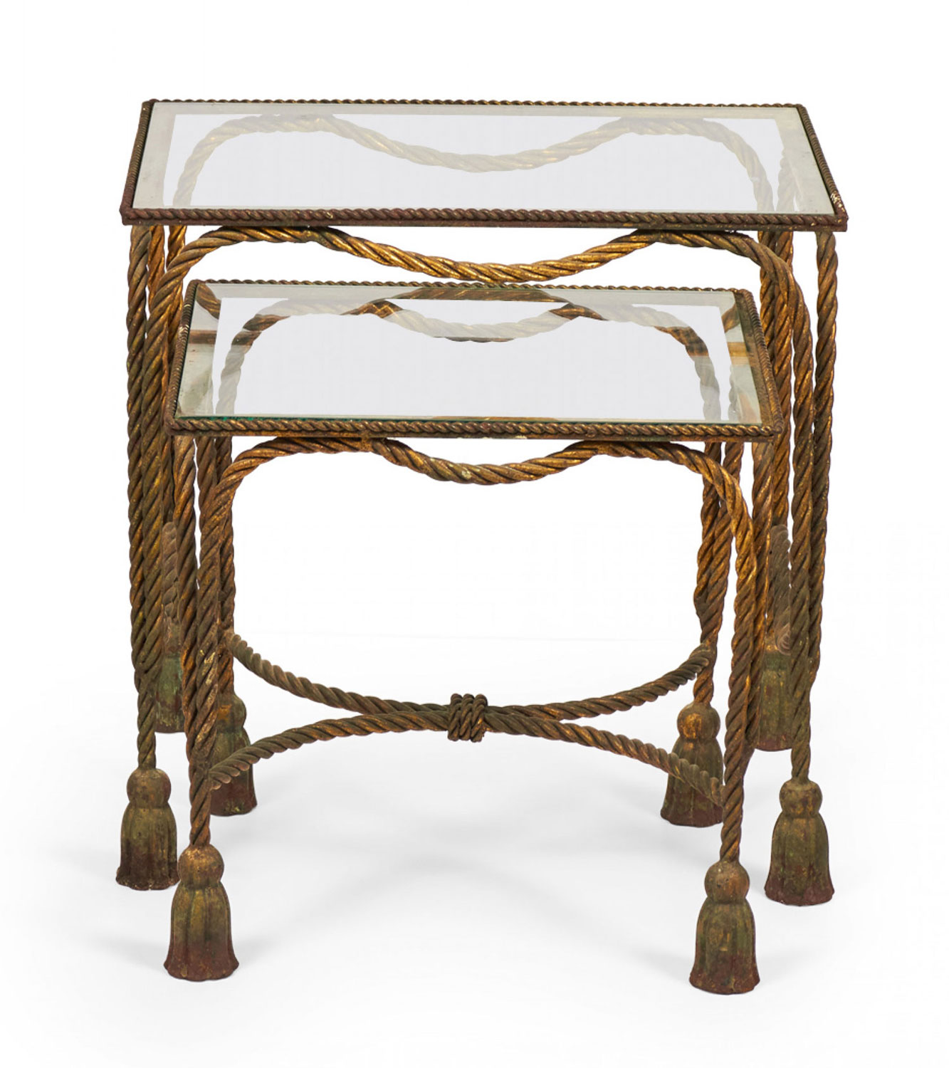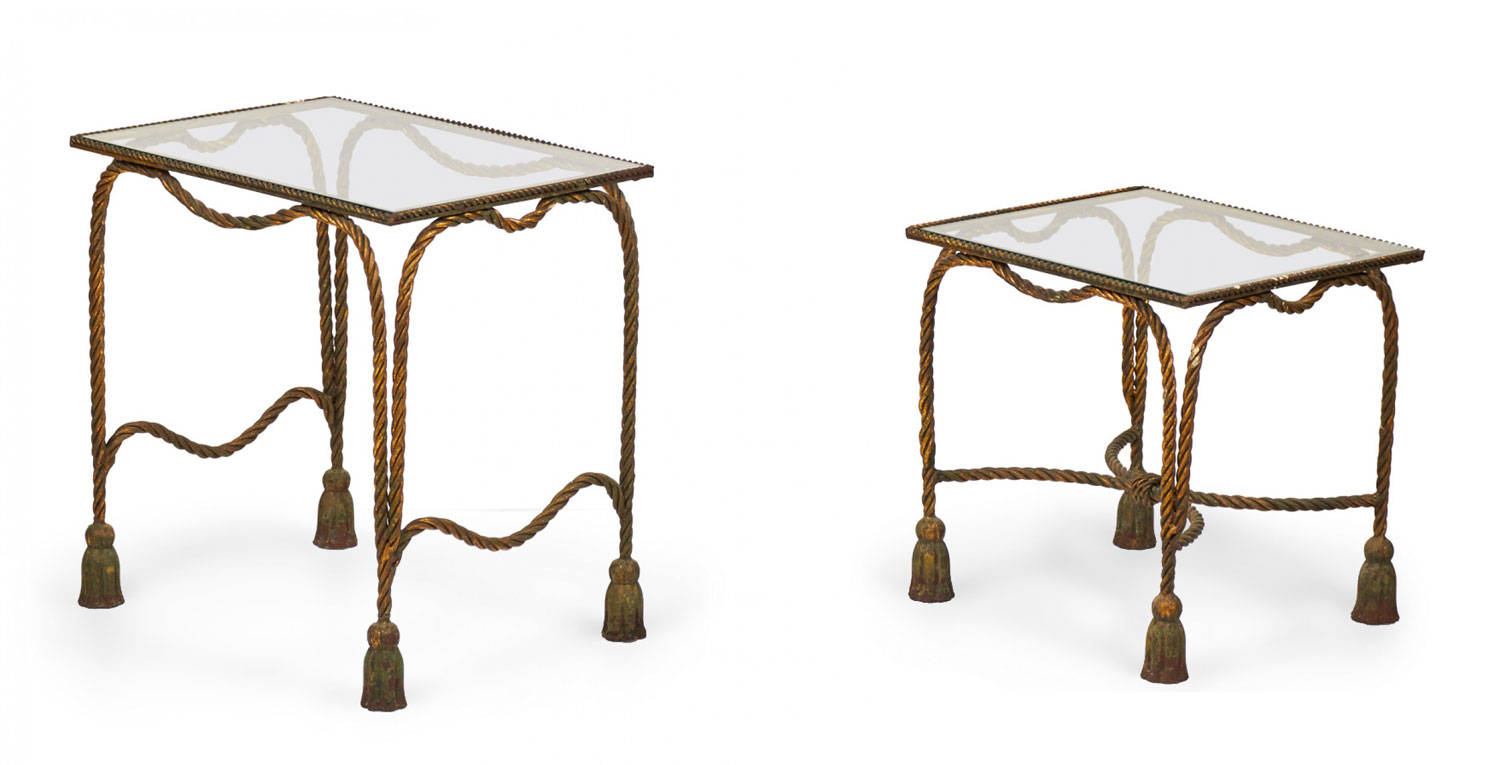 Italian Baroque-Style Mid-Century (circa 1950) Rope and Tassel nesting tables with gilt iron frames and clear glass table tops. (two tables, PRICED AS SET) (PALLADIO, ITALY).