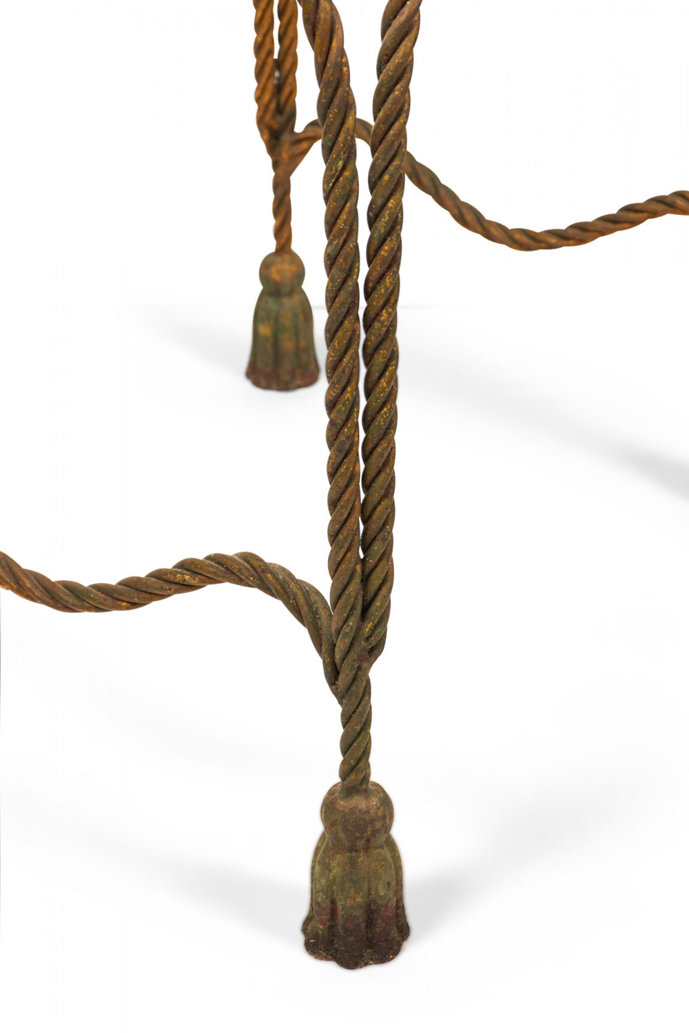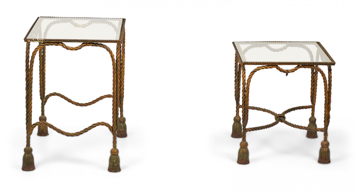 Italian Baroque-Style Mid-Century (circa 1950) Rope and Tassel nesting tables with gilt iron frames and clear glass table tops. (two tables, PRICED AS SET) (PALLADIO, ITALY)
