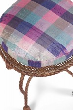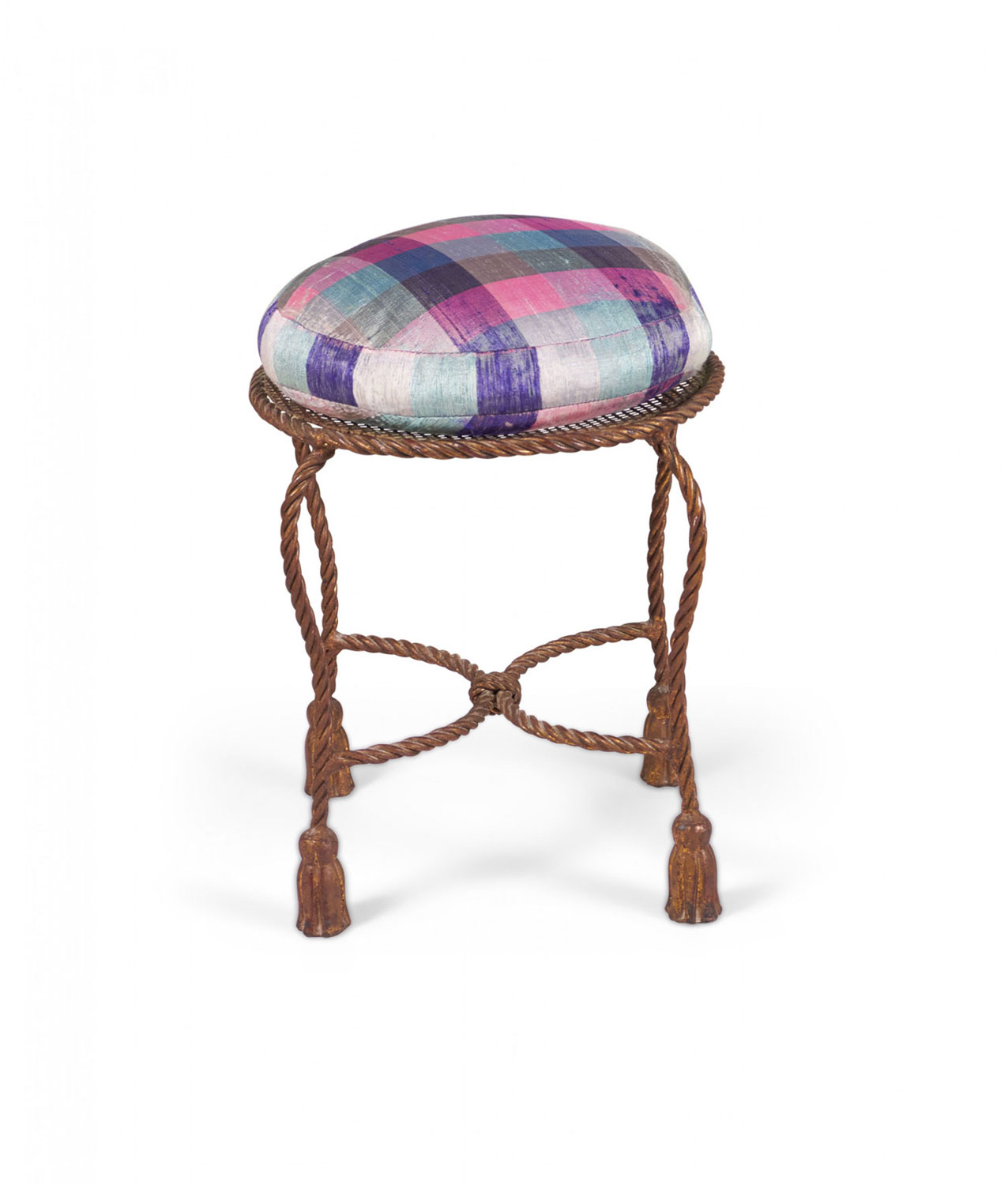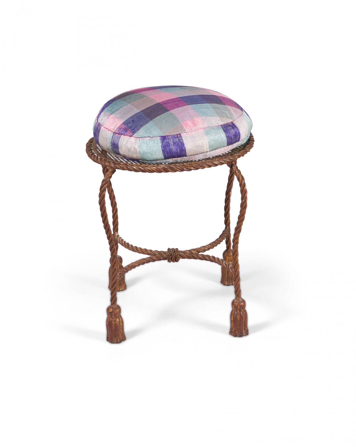 Italian Mid-Century (circa 1950) Rope and Tassel vanity stool with a gilt iron frame and unattached purple pink and green plaid seat cushion. (PALLADIO, ITALY)