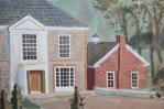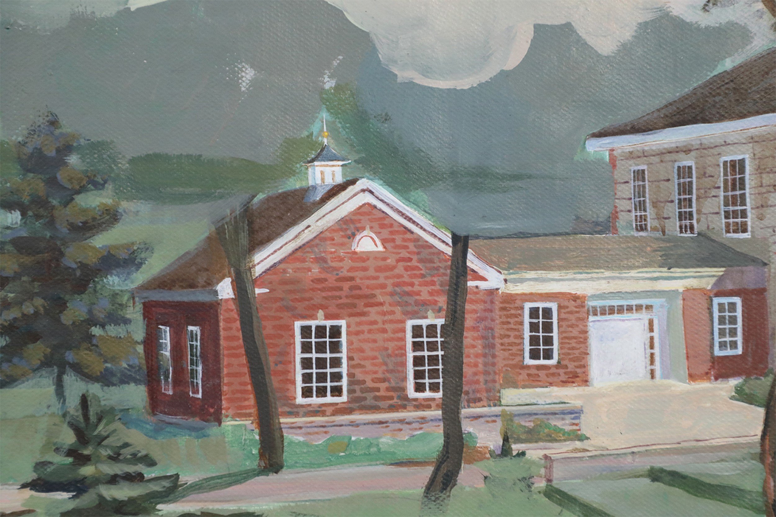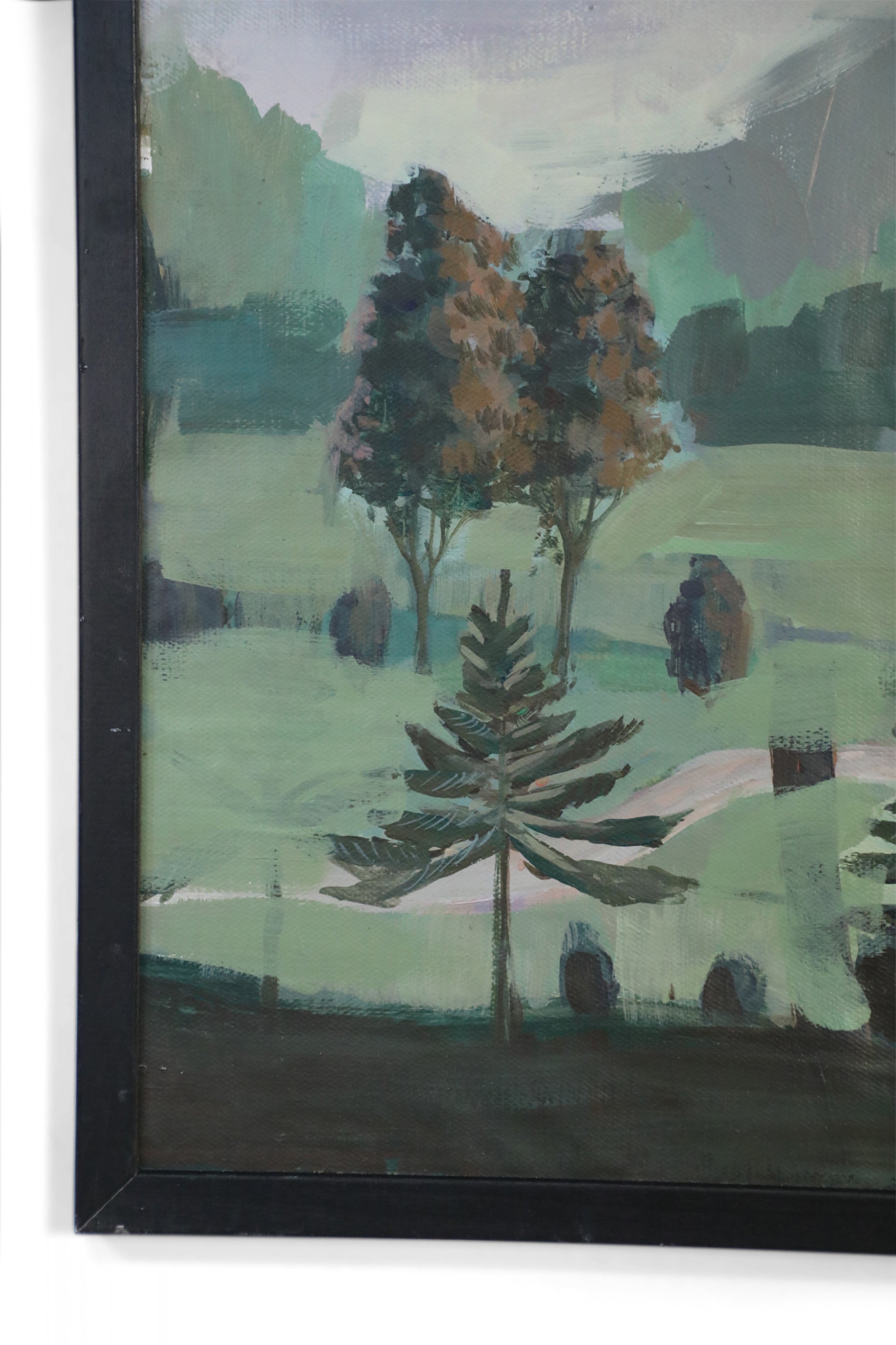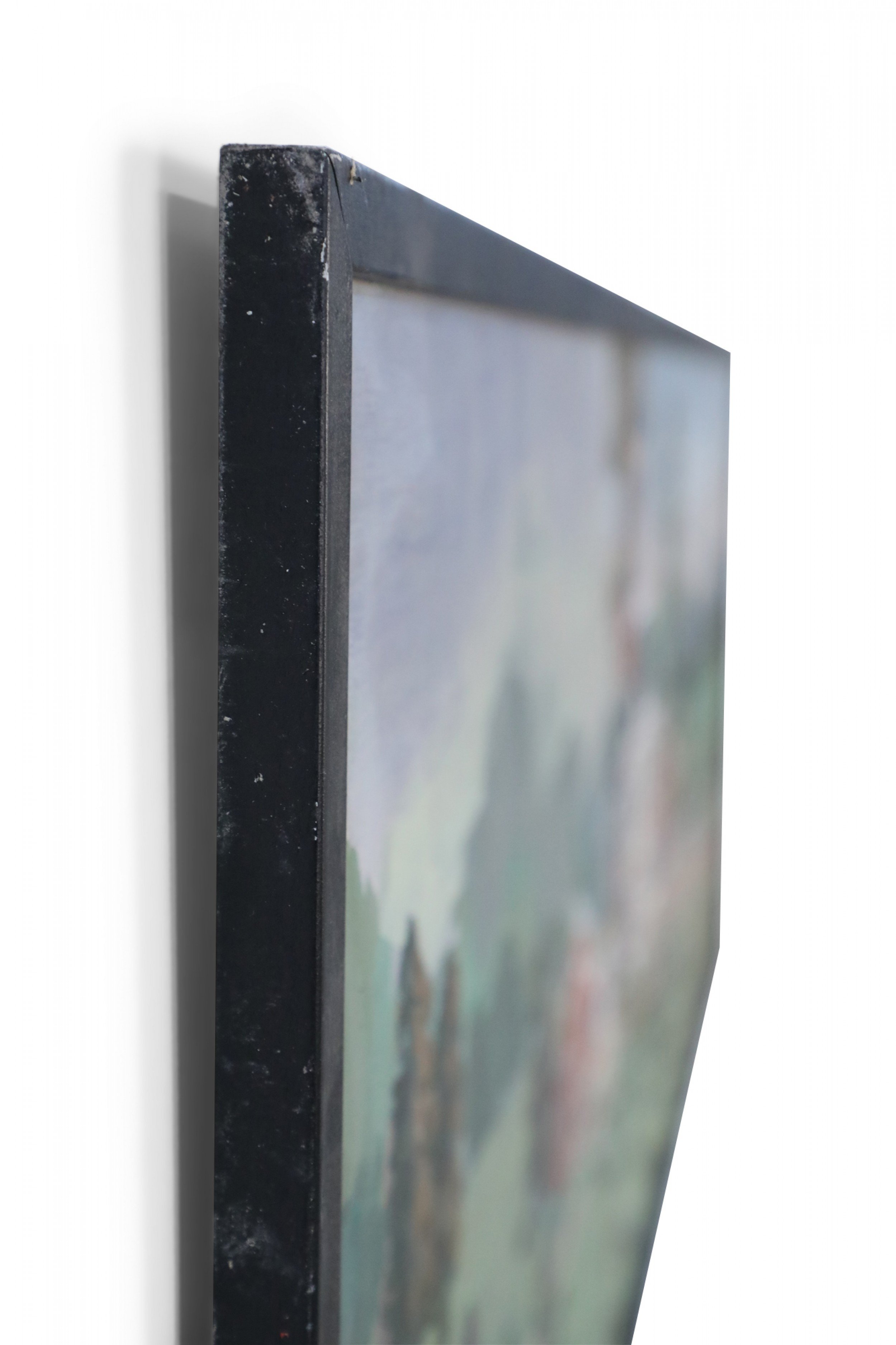 American Country style (20th Century) panoramic landscape painting of a manor house and surrounding gardens on wide, narrow rectangular canvas in a black-painted wooden frame.