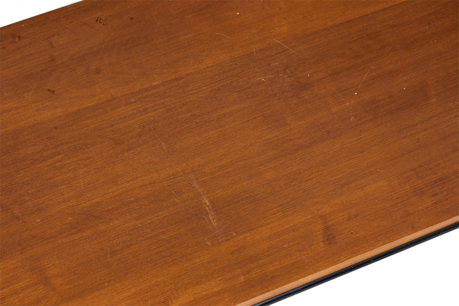 Style: Mid-Century Materials & Techniques: Iron, iron / wrought iron, maple, metal, wood Category: Tables Condition: Damage to table finish. Good; Wear consistent with age and use