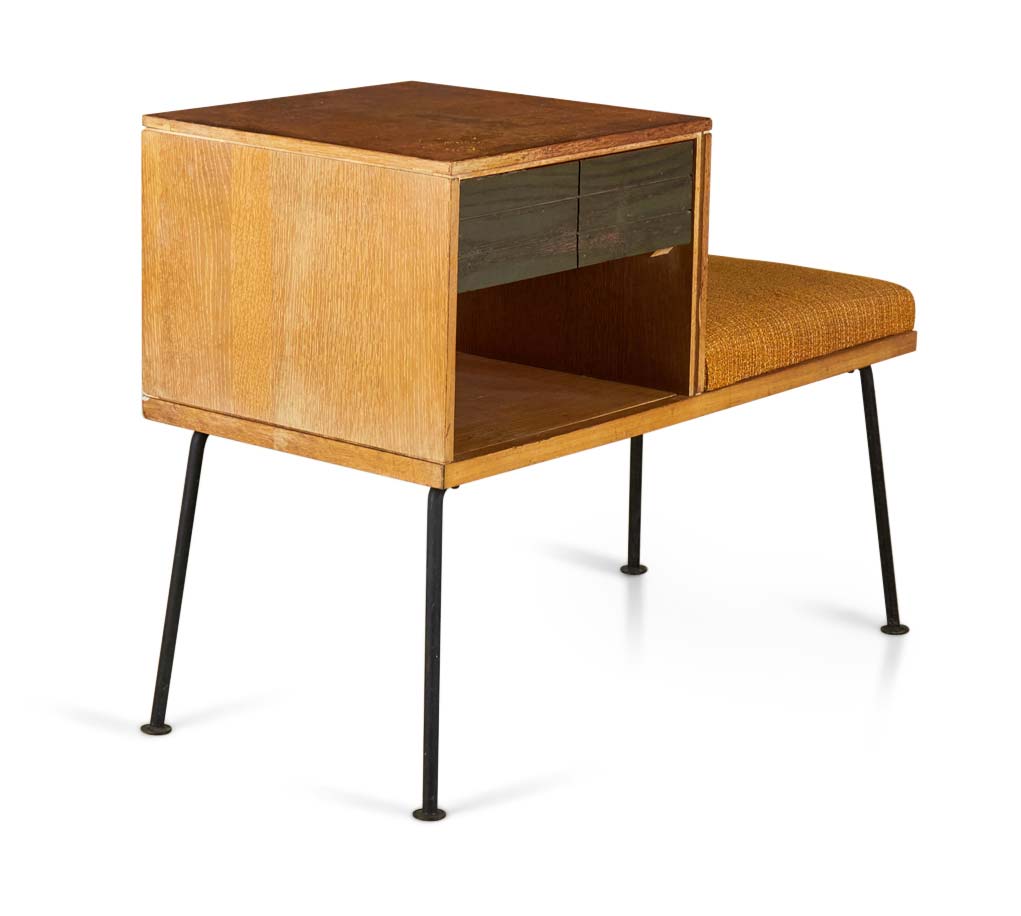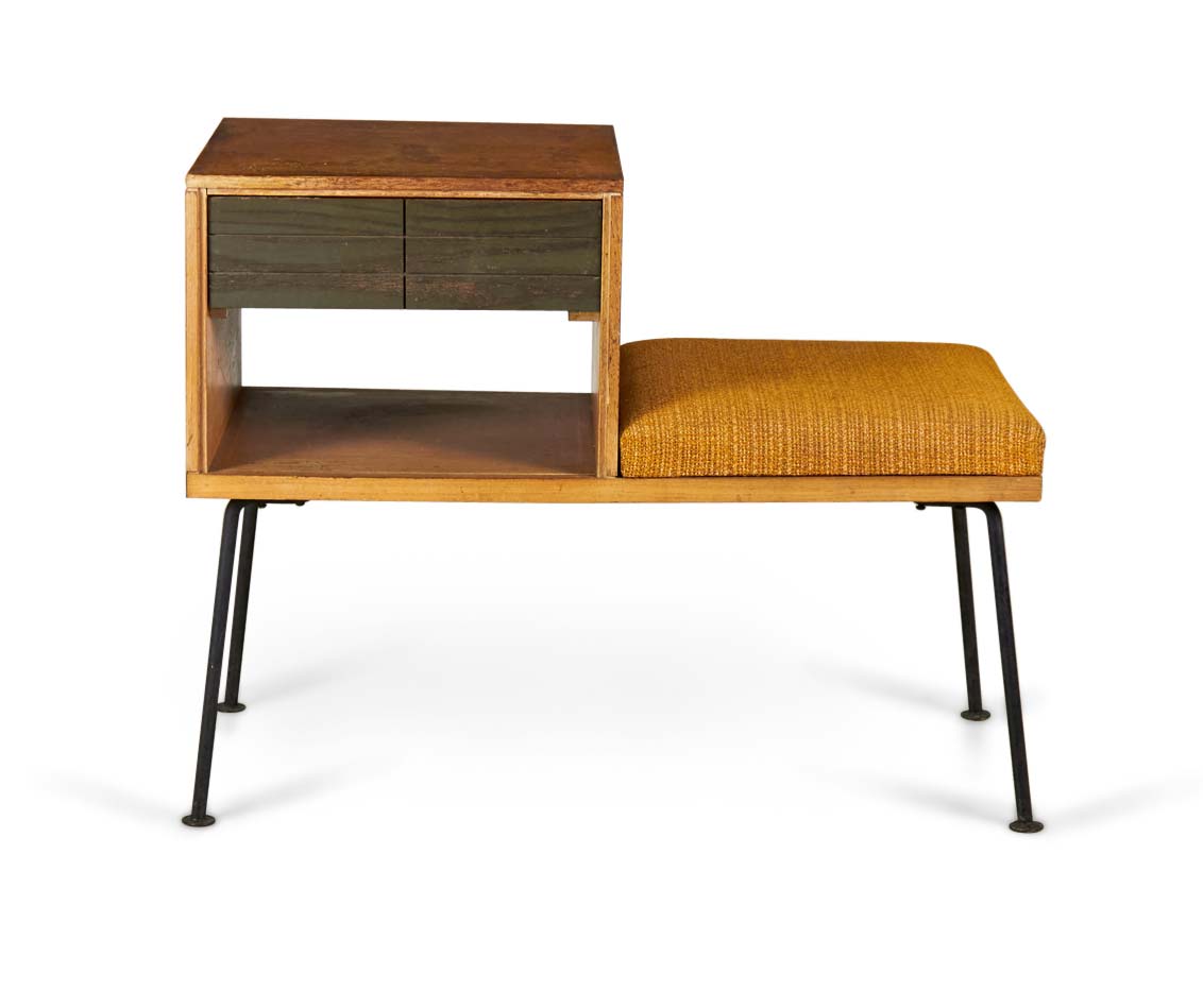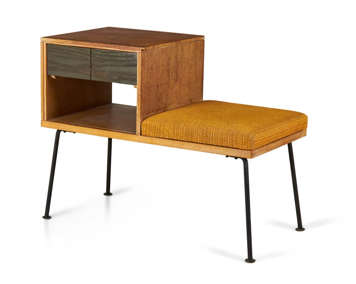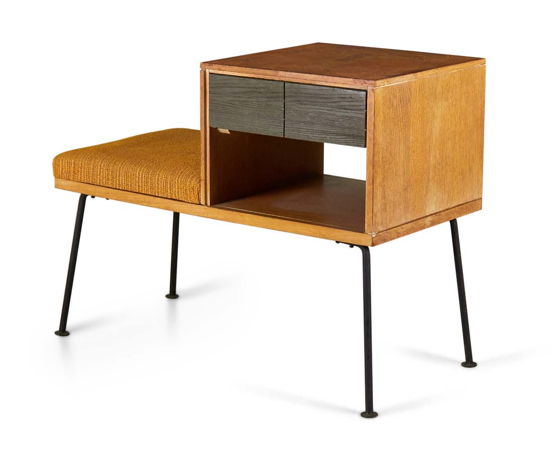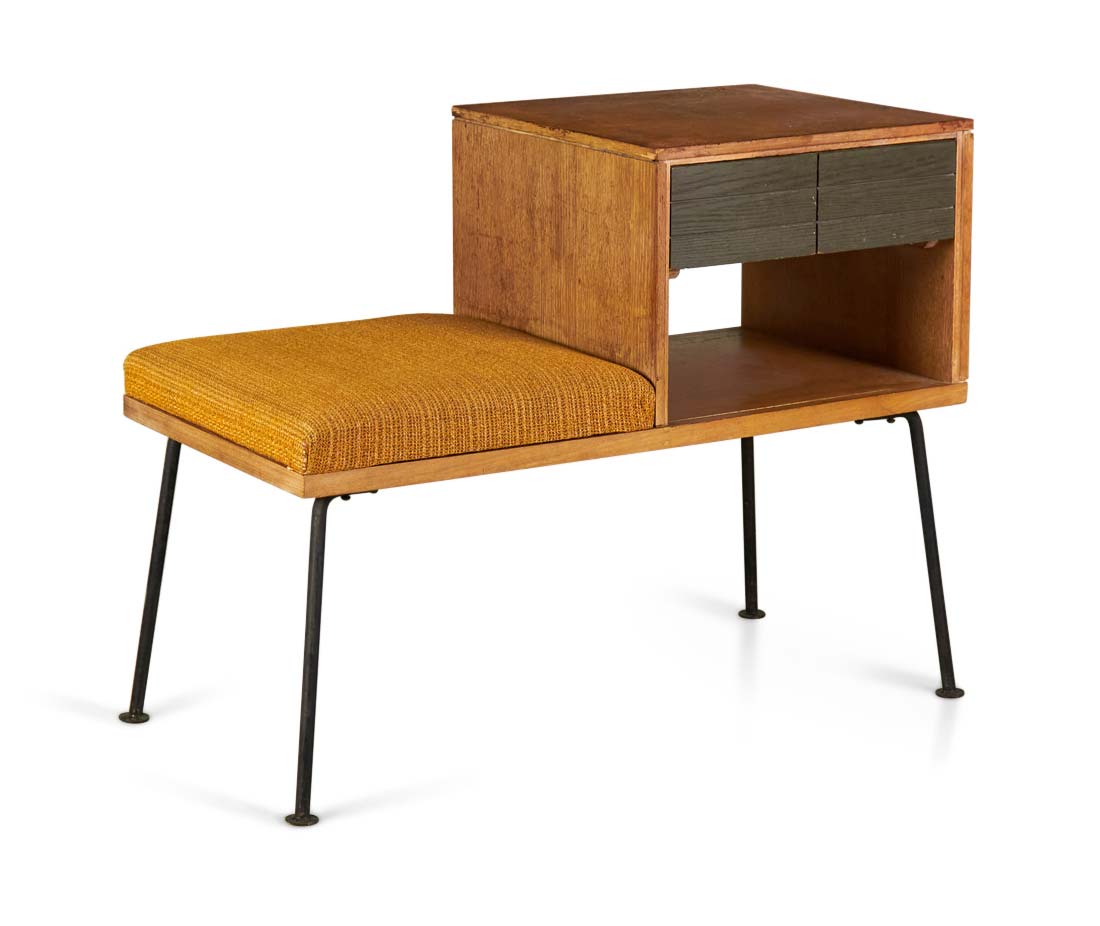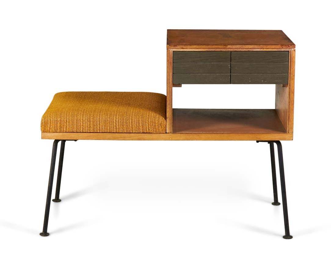 Raymond Loewy for Mengel American Mid-Century Walnut, Iron and Gold Upholstery Telephone Bench