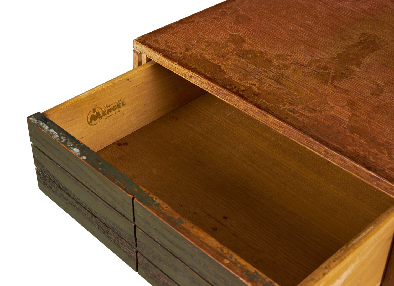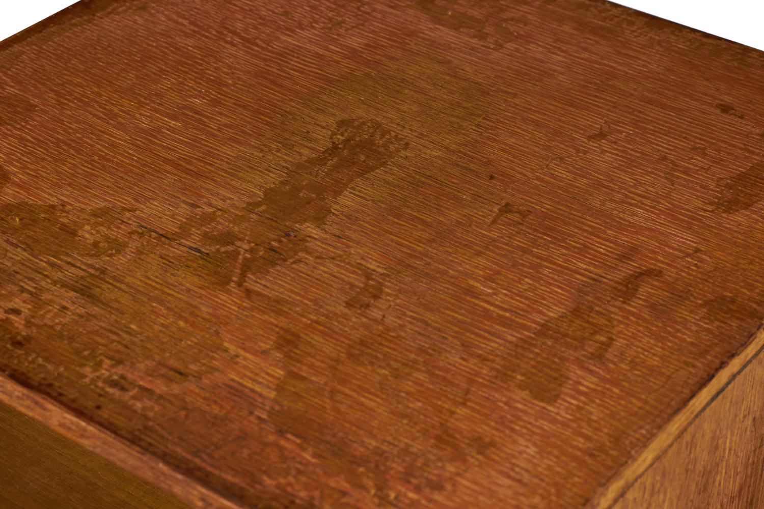 American Mid-Century oak telephone bench /table with a gold textured fabric upholstered seat next to a side table with a dark stained, geometrically incised drawer above an open compartment, resting on four angled iron legs with circular feet. (RAYMOND LOEWY FOR MENGEL FURNITURE)(Available in orange upholstery/darker finish: DUF0089B).