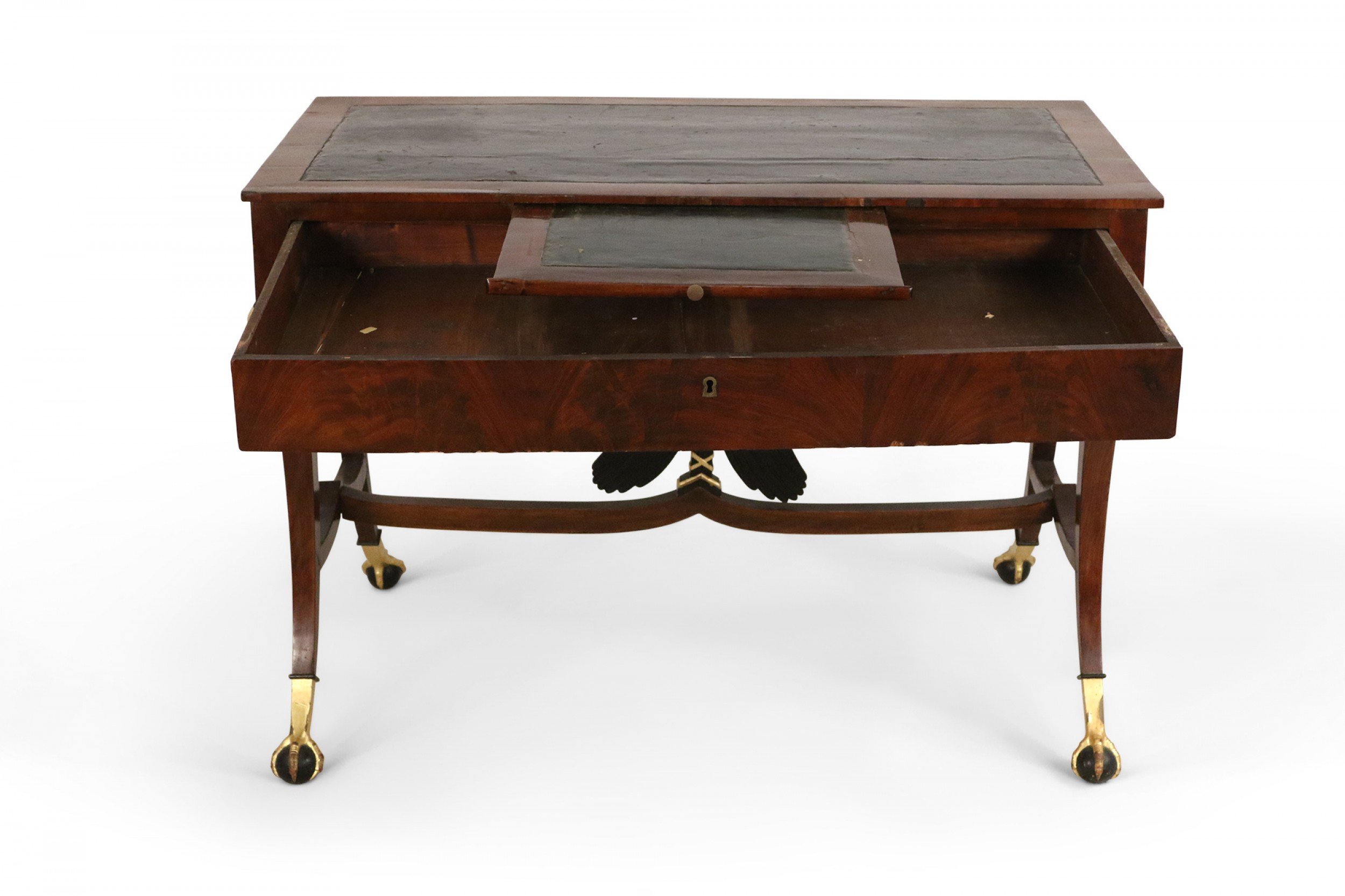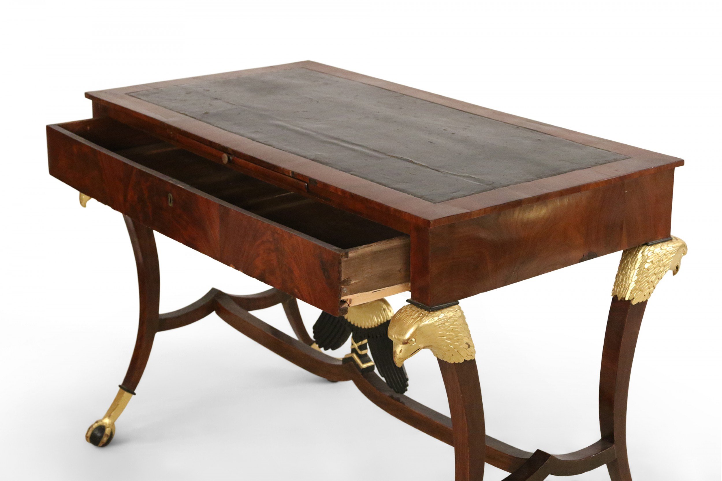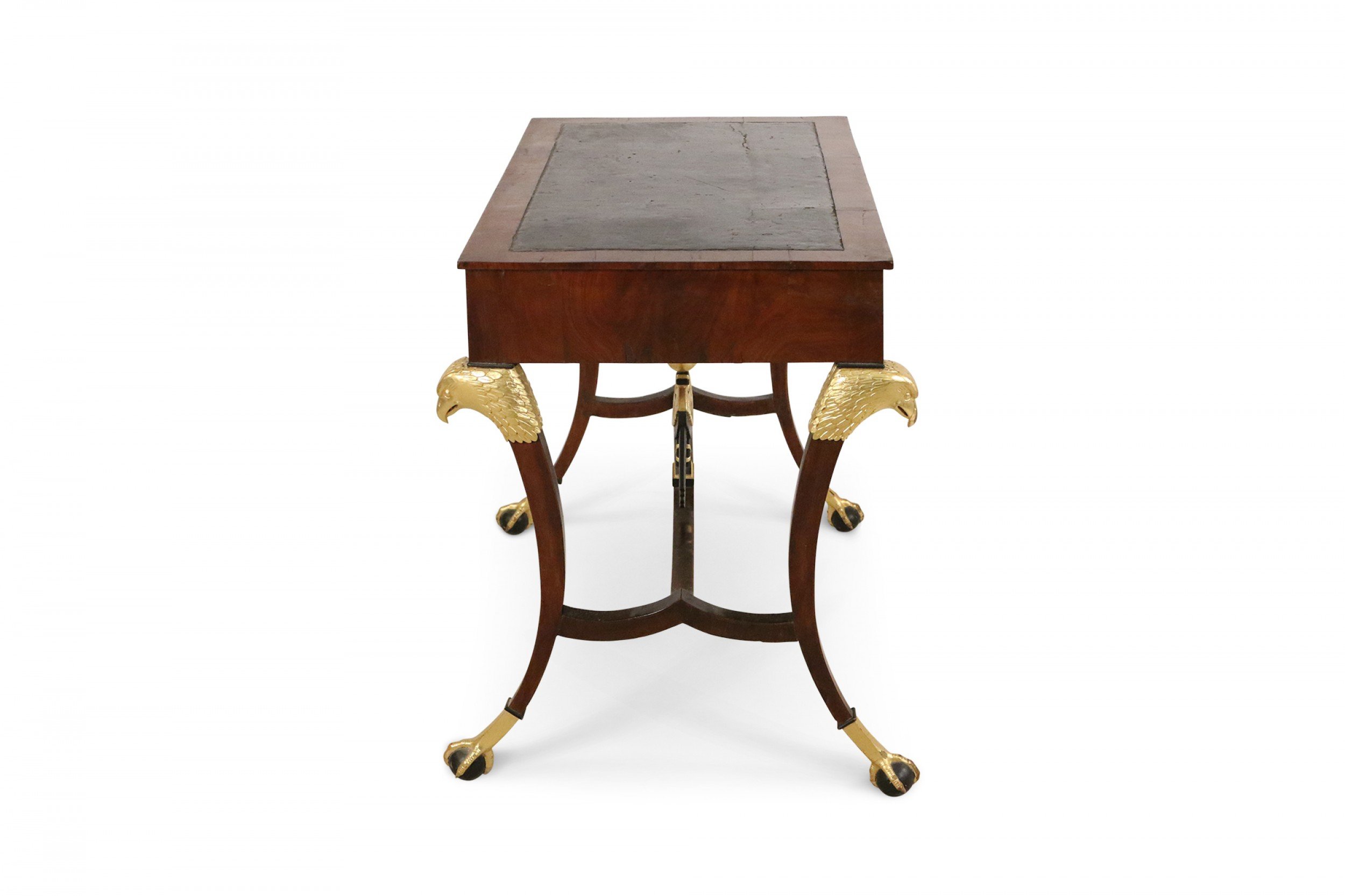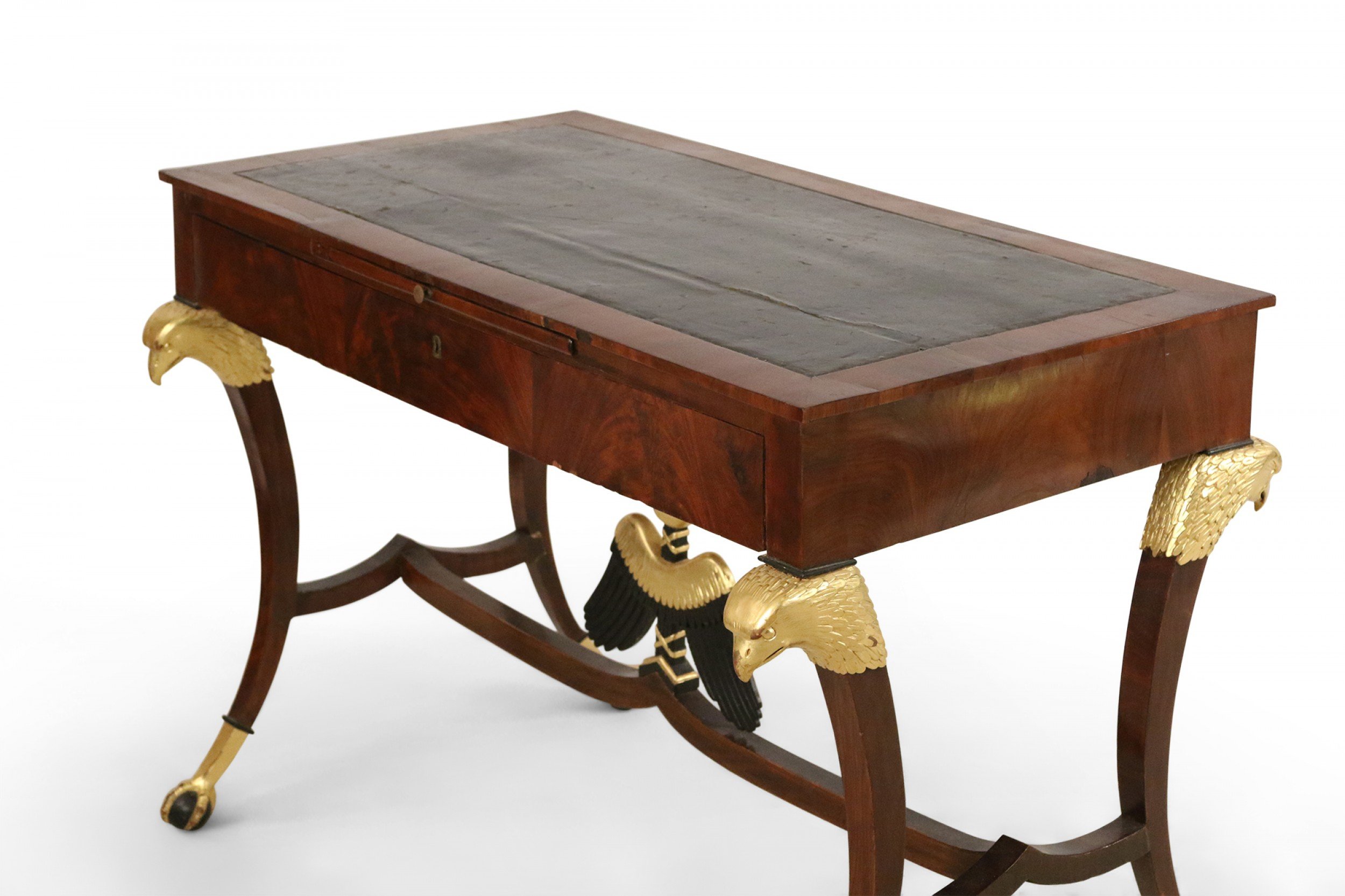 Russian (19th Century) mahogany desk with inset black leather top, key-locked drawer & pull out writing tray with a stretcher having a centered black & gilt eagle connecting 4 saber legs with gilt eagle heads and talon claw & ball feet.