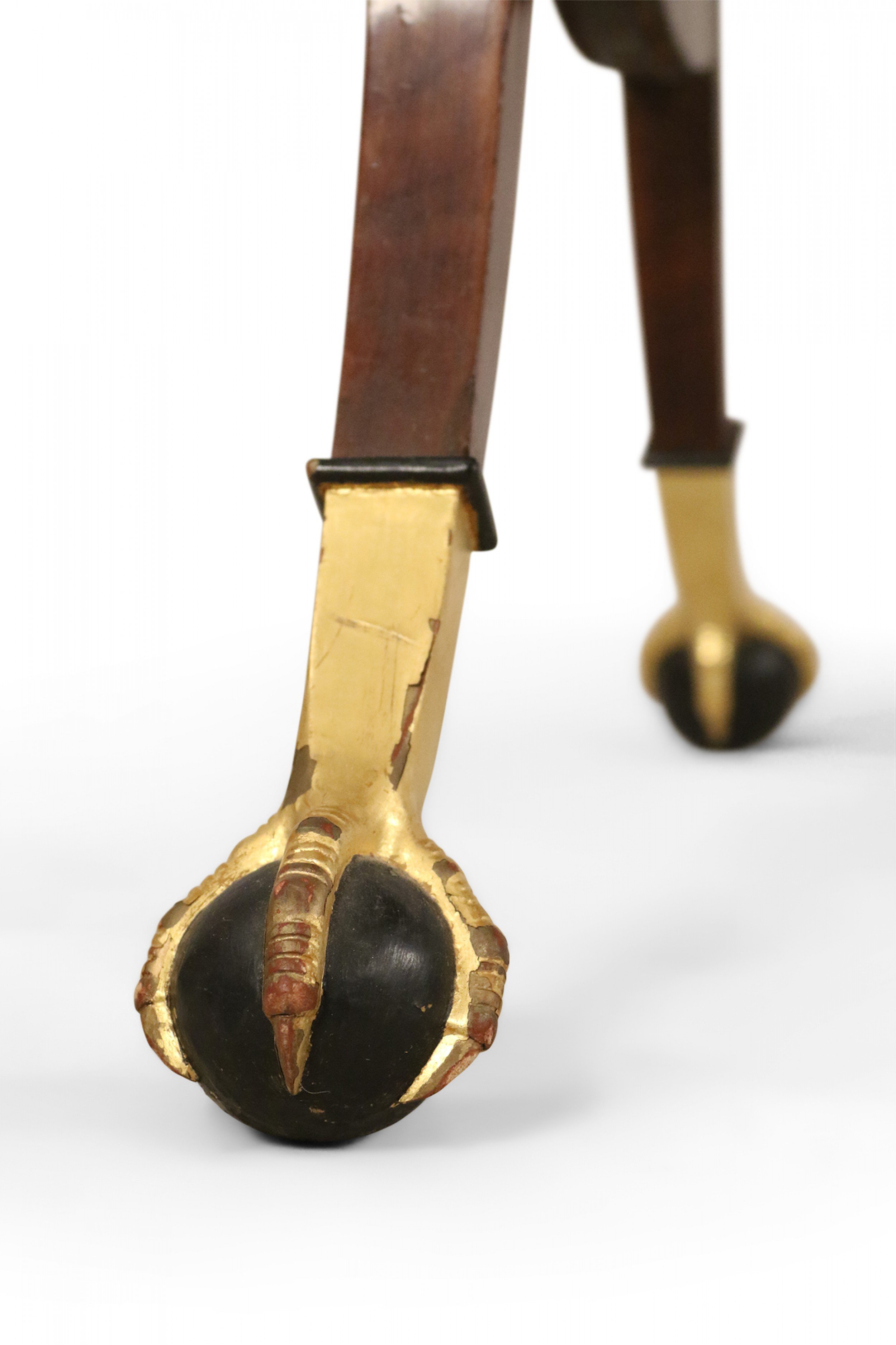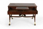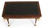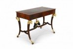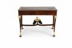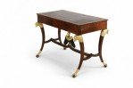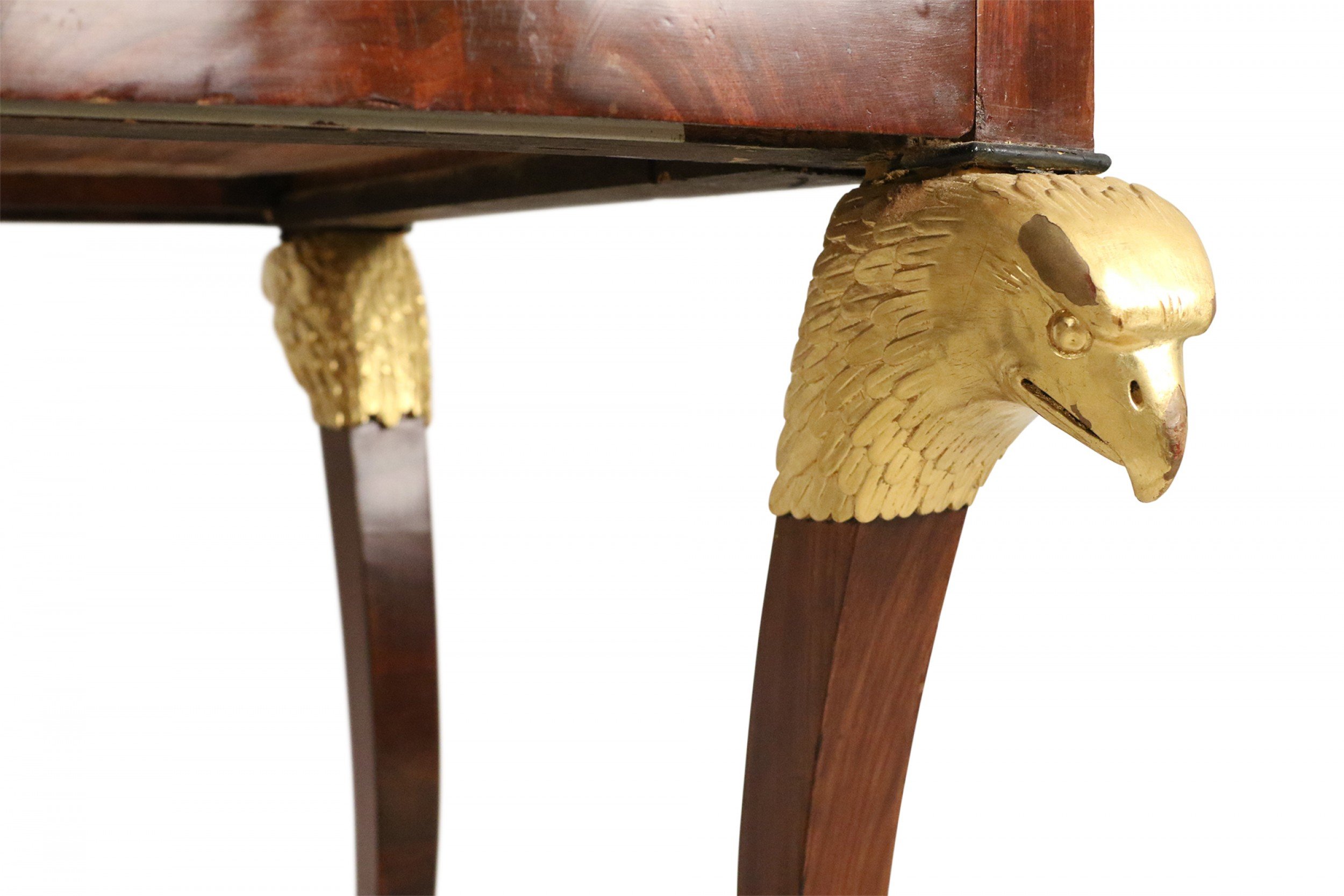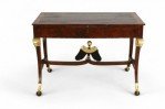 Style: Russian Materials & Techniques: Carved, giltwood, leather, mahogany, wood Category: Tables Condition: Drawer has a split through the bottom.