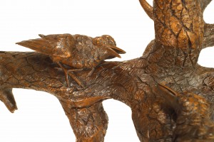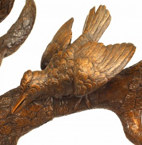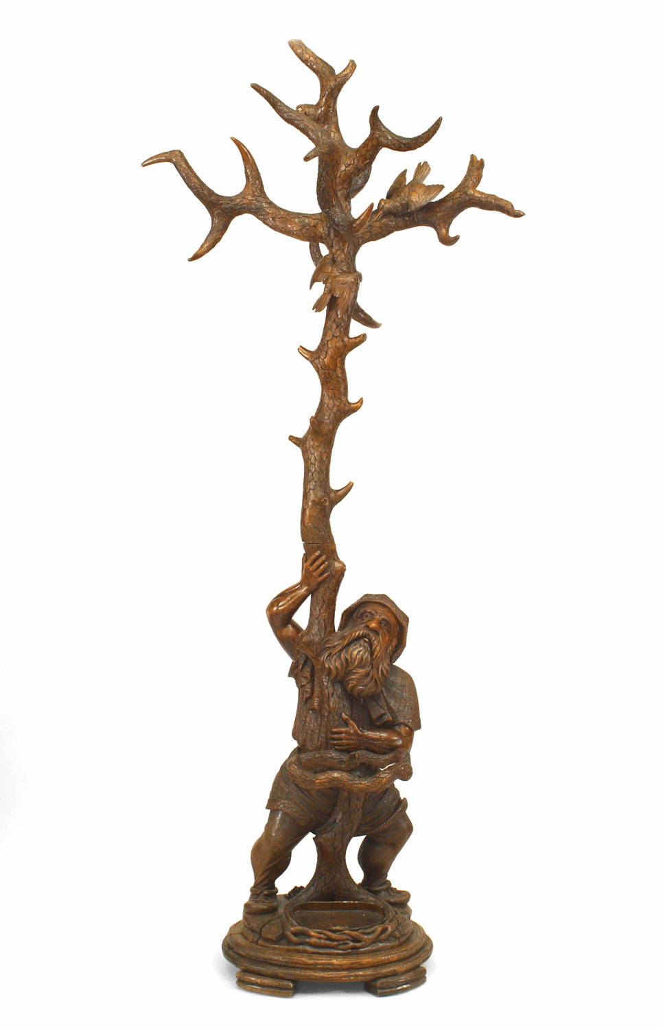 Rustic Black Forest-style (19th Century) carved walnut hatrack/umbrella stand with gnome figure holding tree form with birds in upper branches.