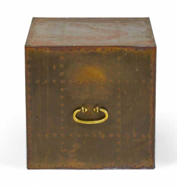 Spanish High Style 'Strongbox' bedside table / commode with brass-clad exterior with natural patina, copper studs, and three drawers with rectangular brass pulls. (SARREID, LTD.) (Similar pieces available with different patinas: DUF0025B-D, similar occasional tables: DUF0026A-F).