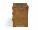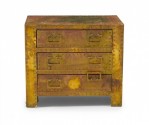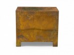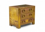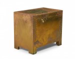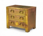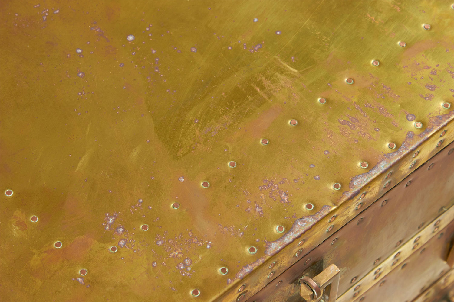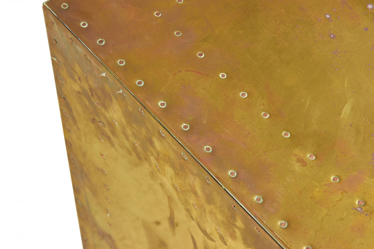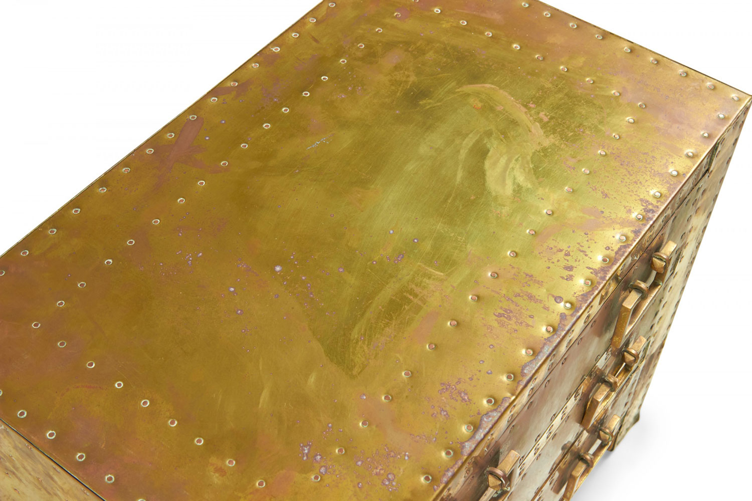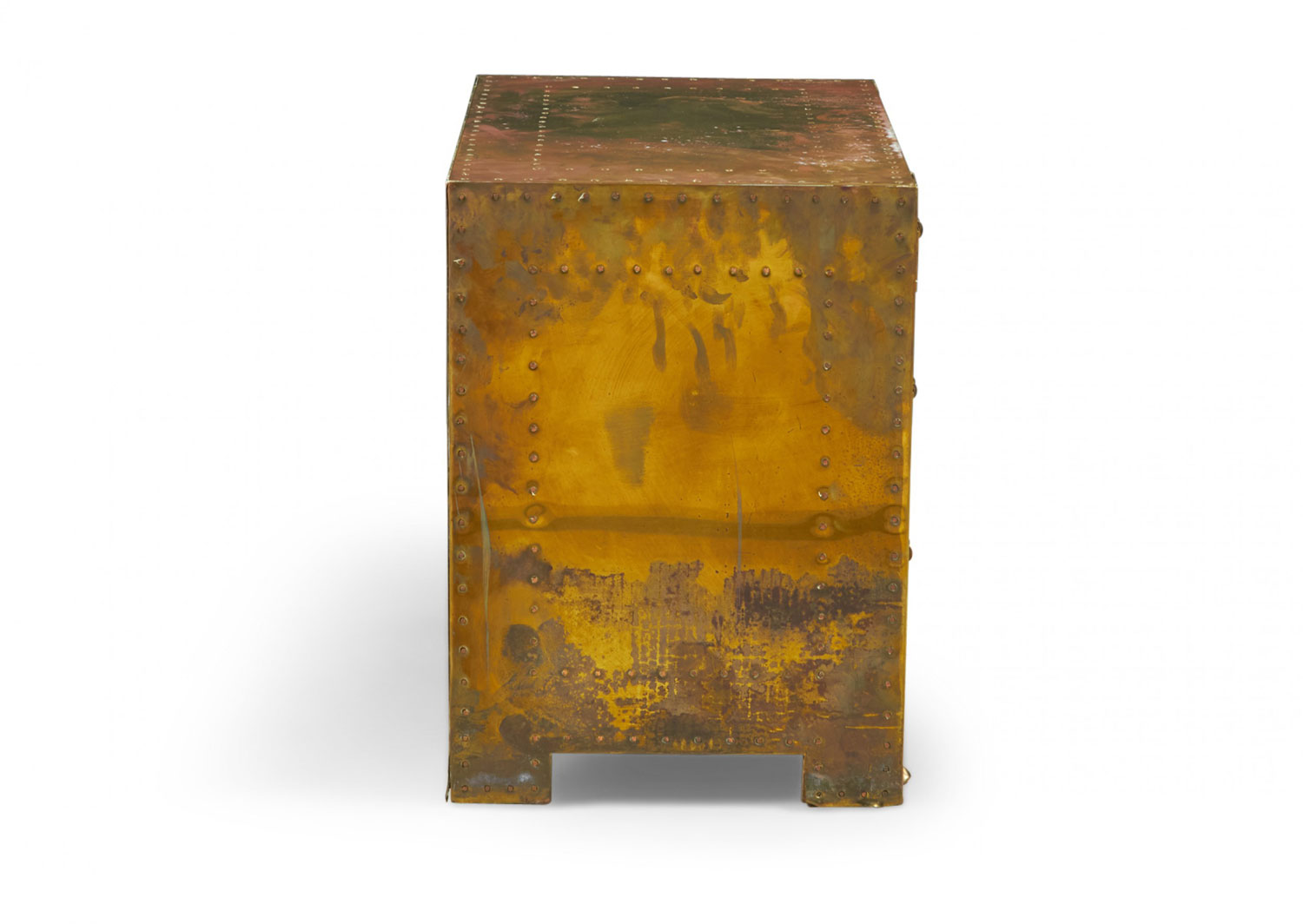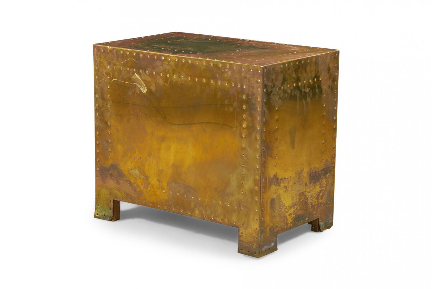 Spanish High Style 'Strongbox' bedside table / commode with brass-clad exterior with natural patina, copper studs, and three drawers with rectangular brass pulls. (SARREID, LTD.)(Similar pieces available with different patinas: DUF0025A-D, similar occasional tables: DUF0026A-F).